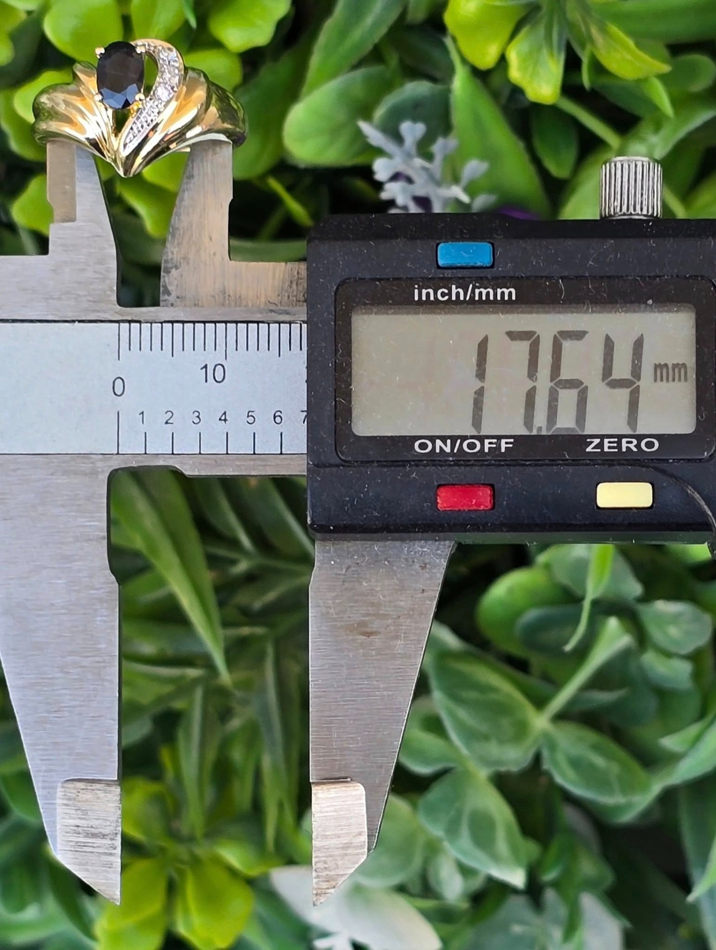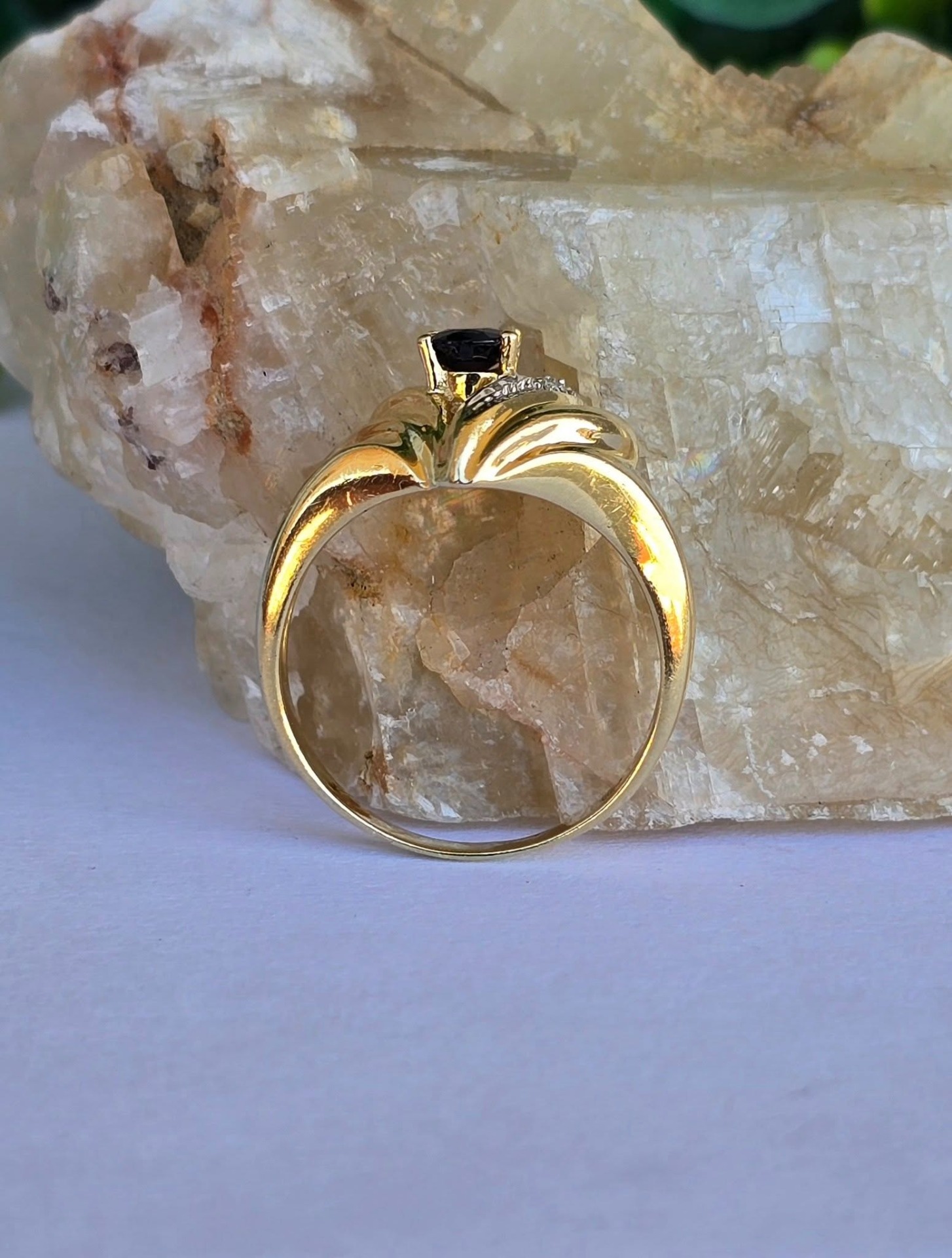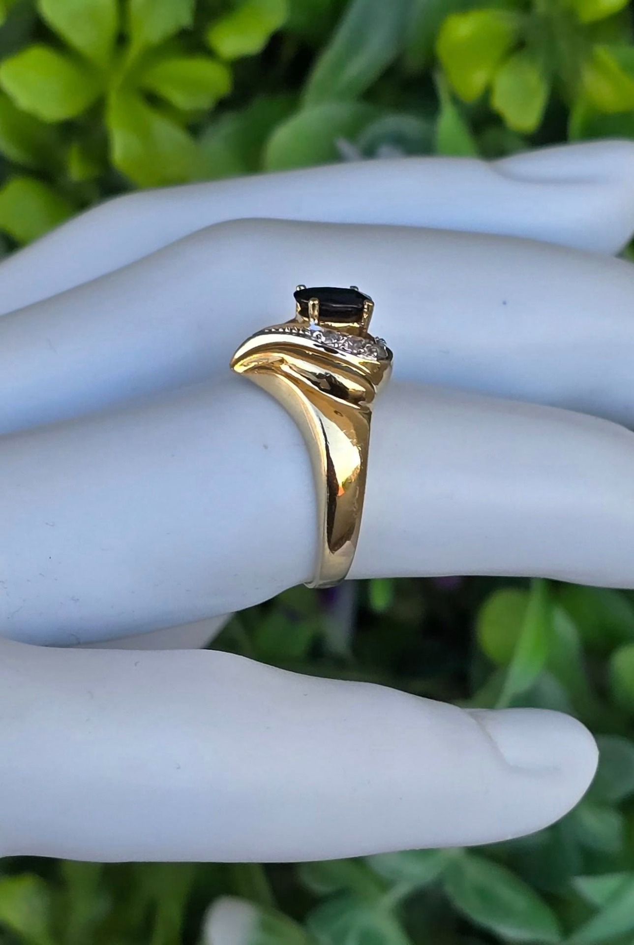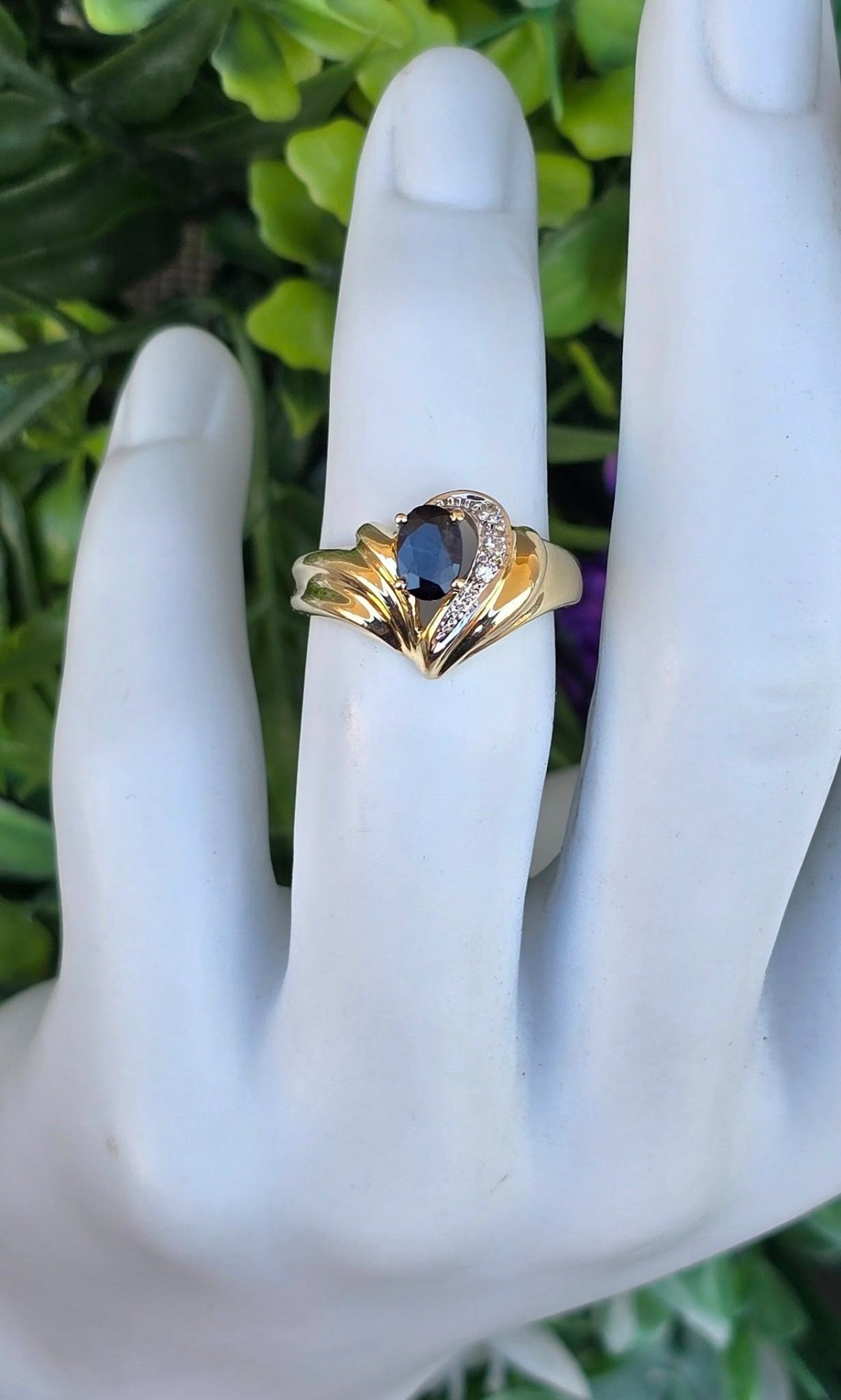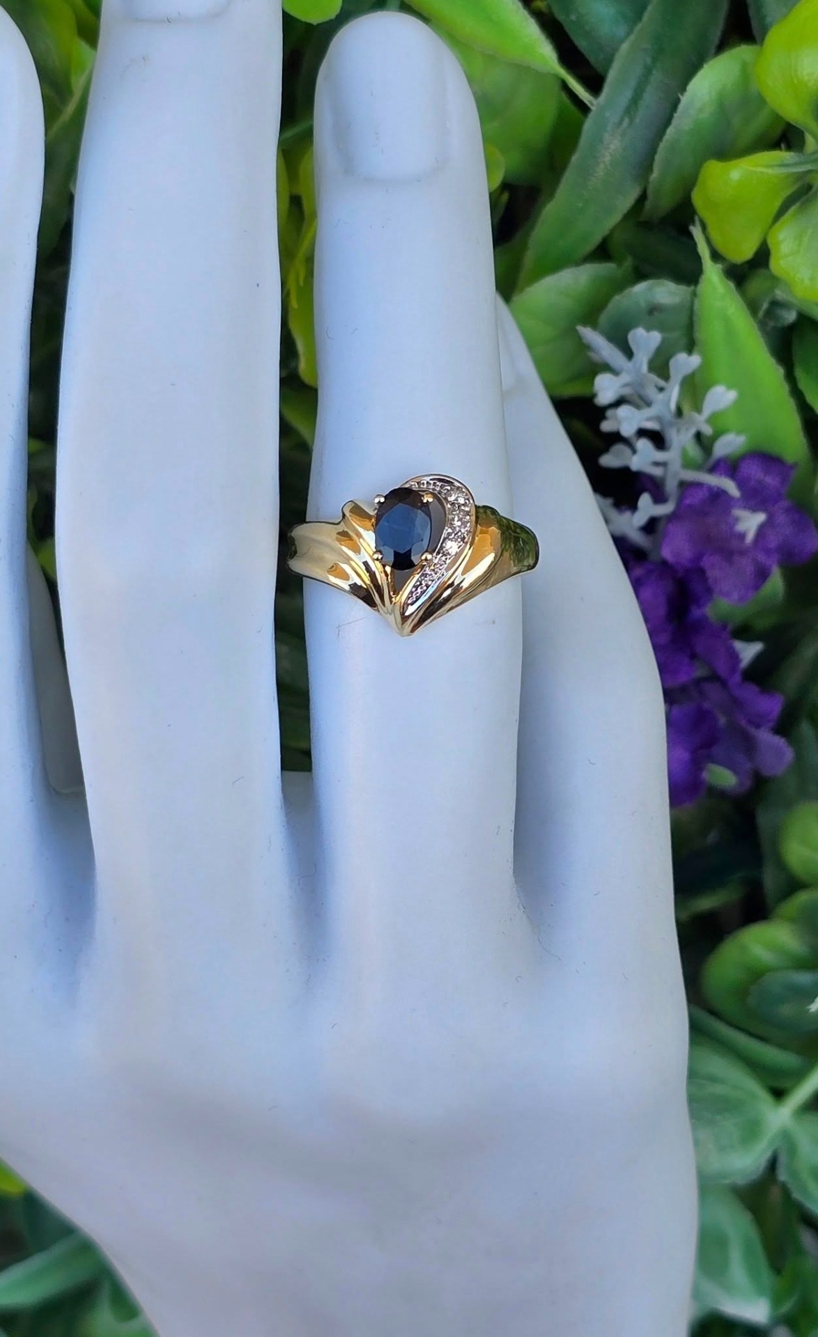 Inel vechi din aur de 14K, cu safir și 3 diamante naturale, manufactură în design romantic.