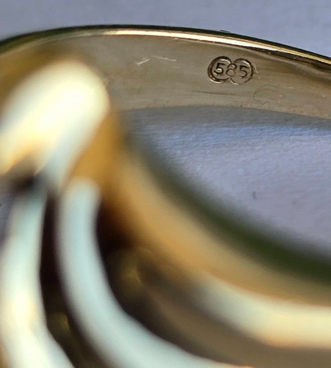 Prezintă marcaj 585 pentru puritate aur de 14K.