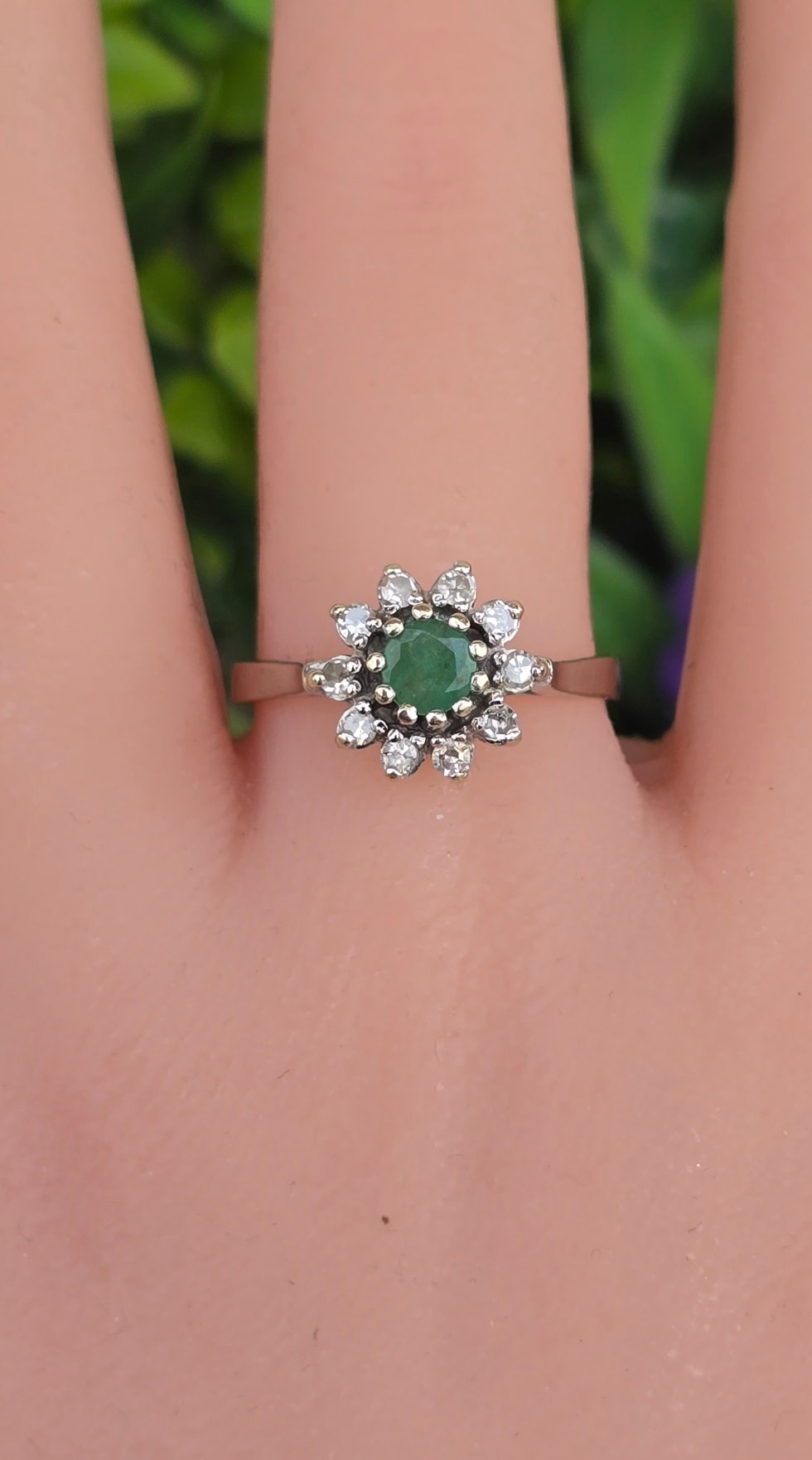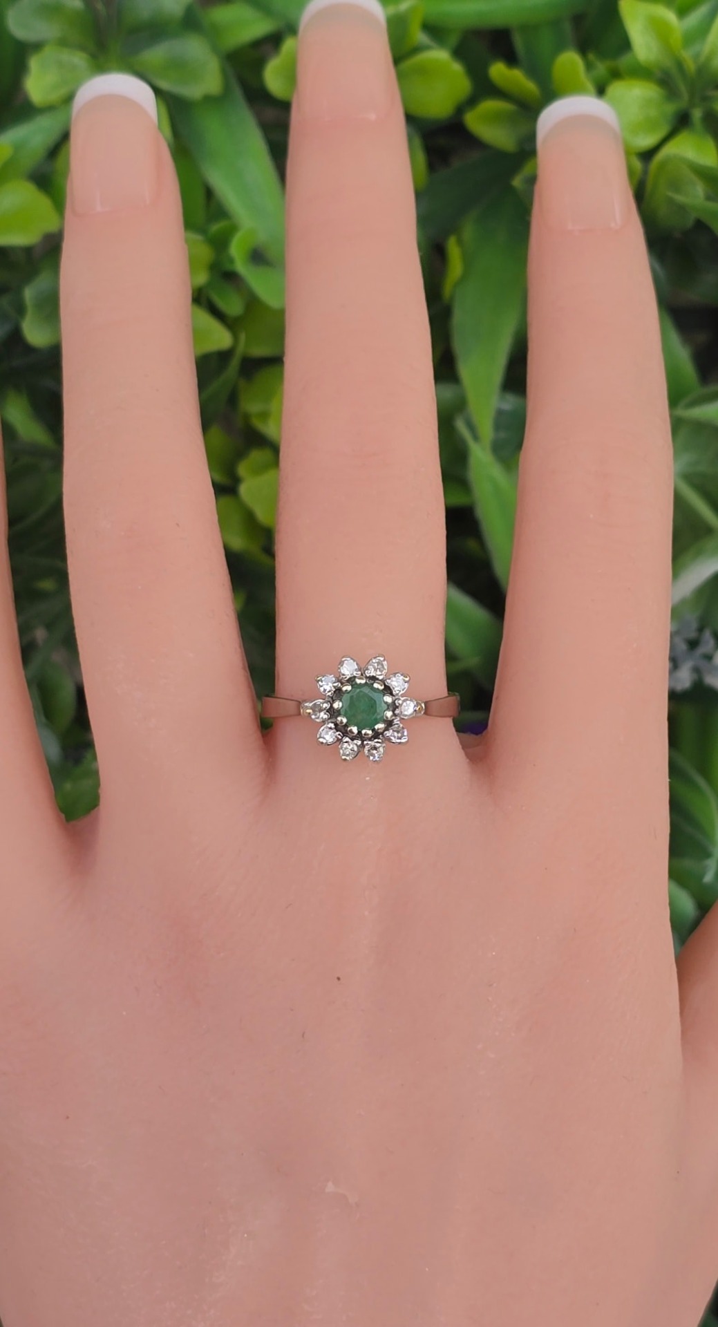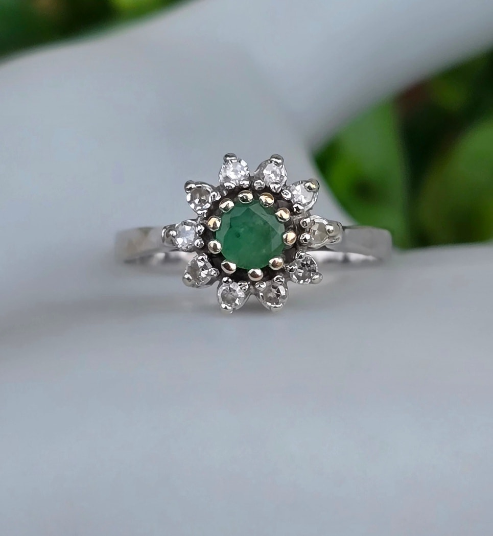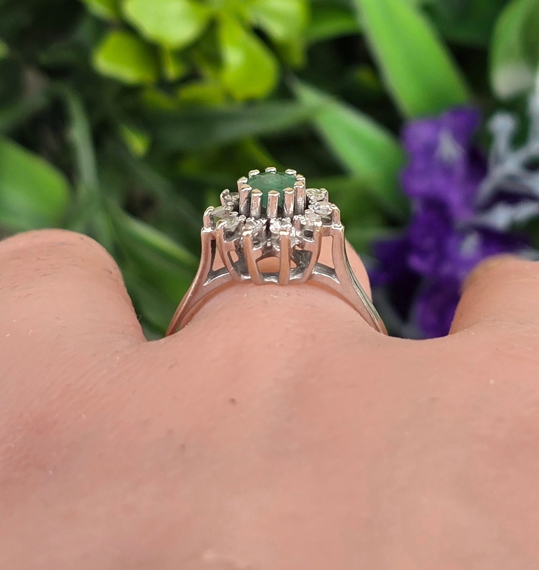 Inel vechi din aur de 14K, cu smarald și 10 diamante naturale.