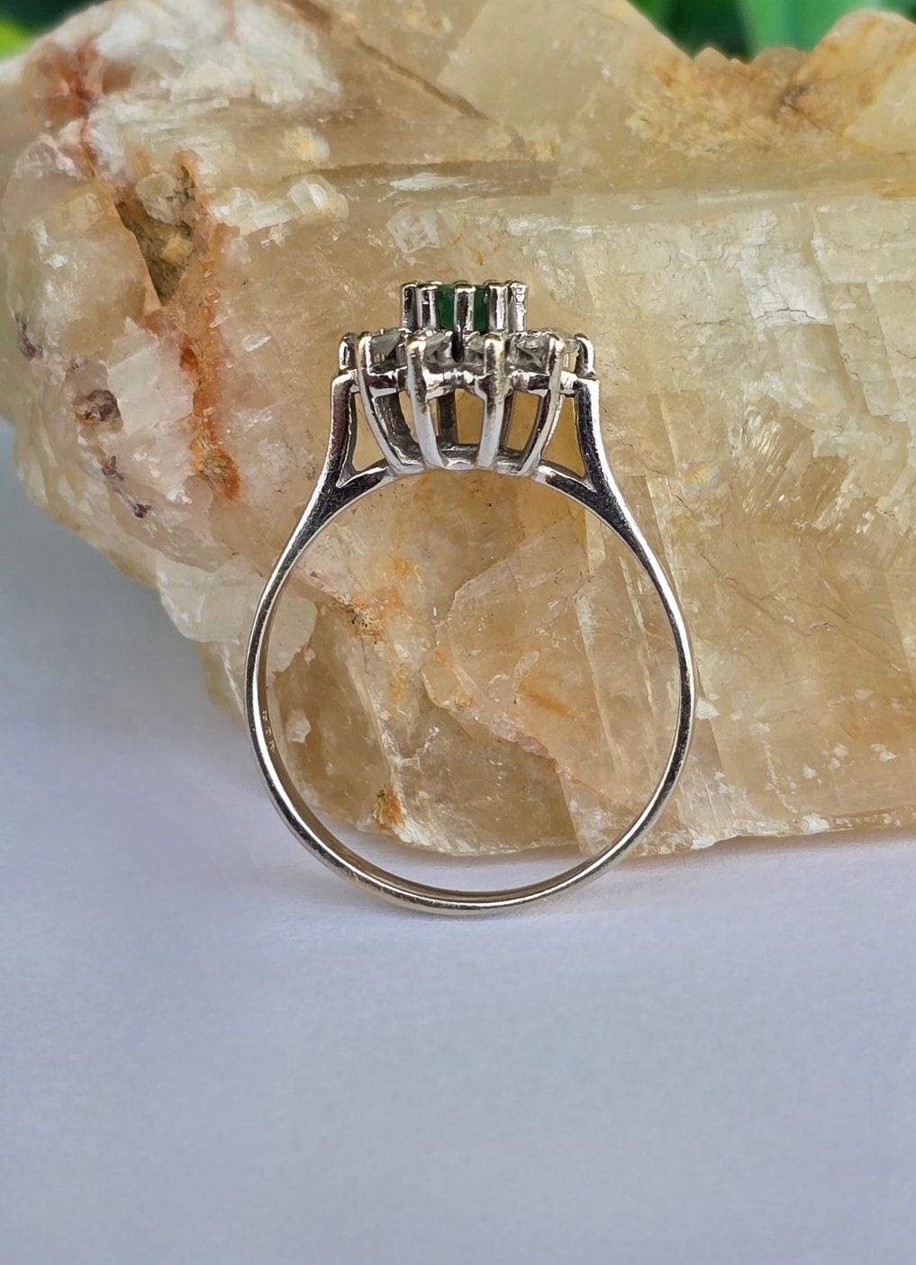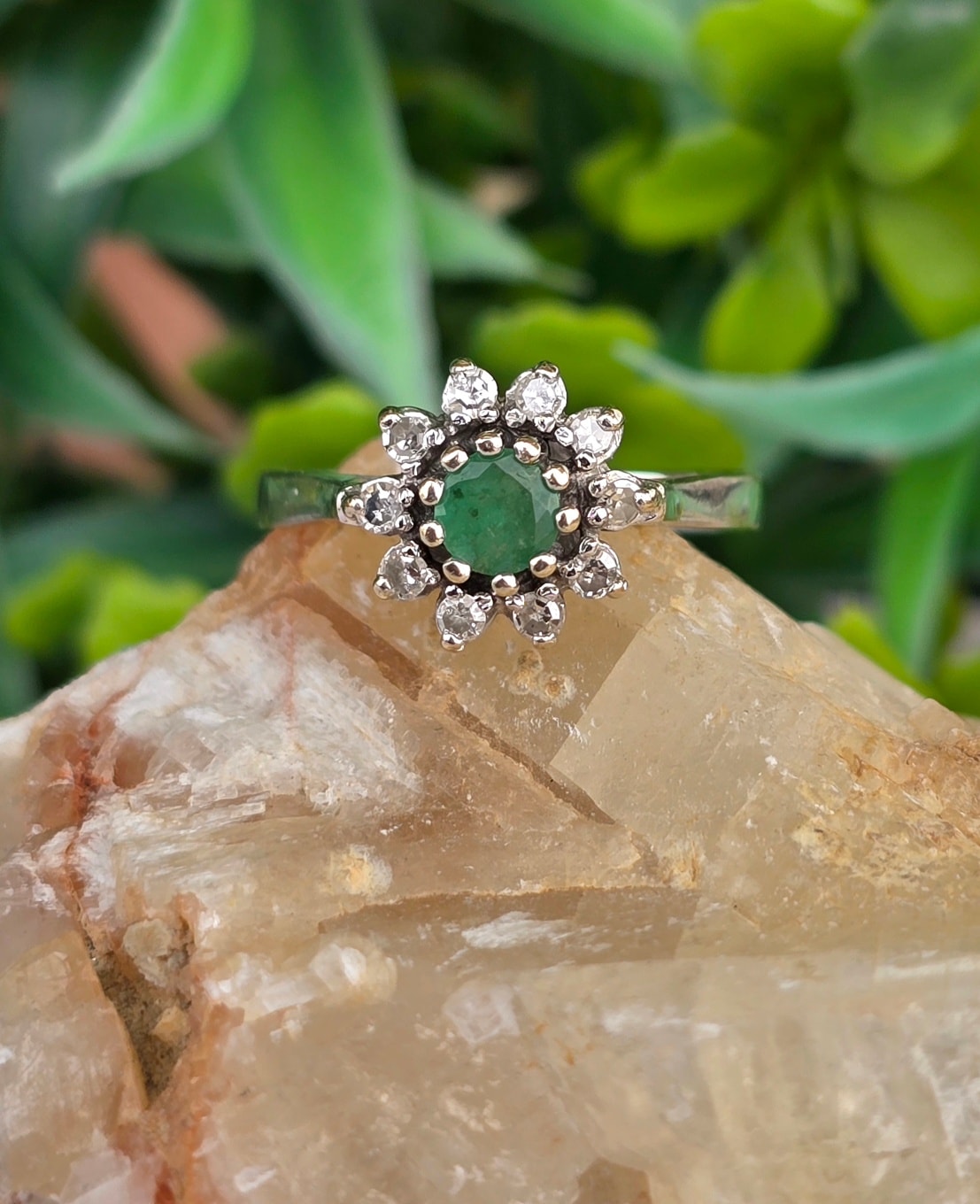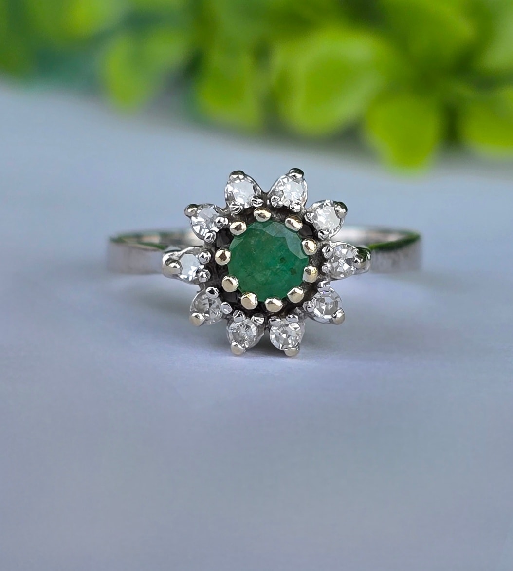 Inel vechi din aur de 14K, cu smarald și 10 diamante naturale.