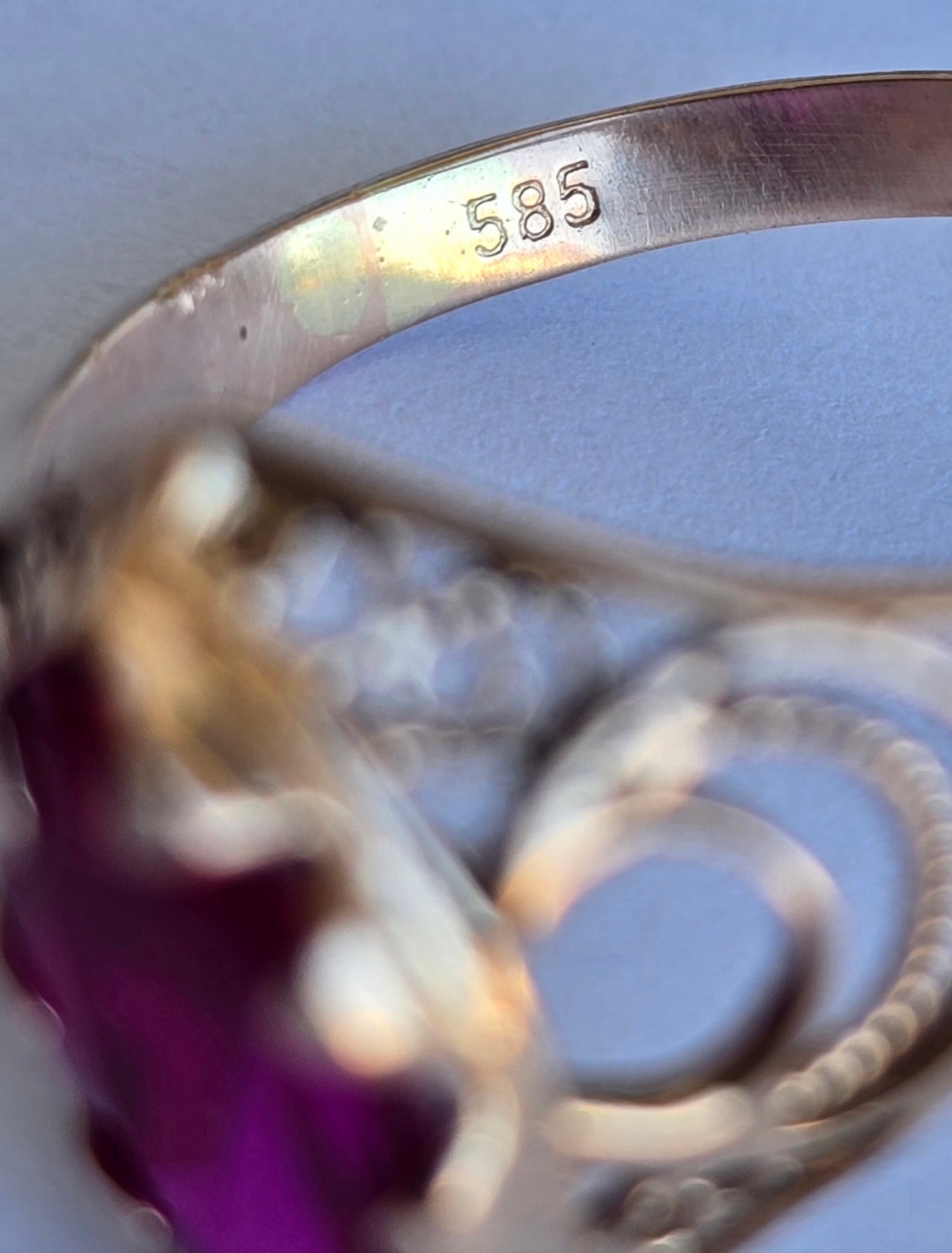 Prezintă marcaj 585 pentru puritate aur de 14K.