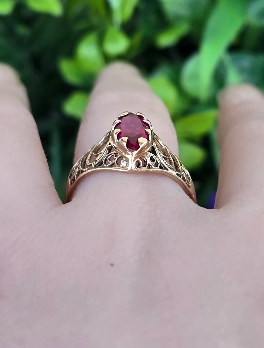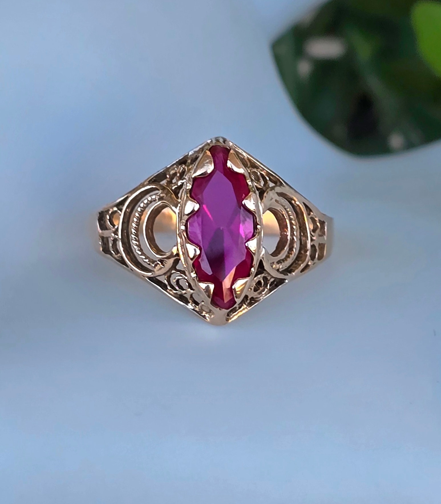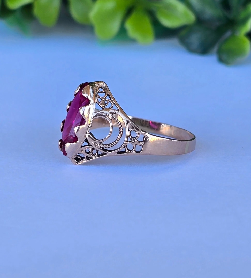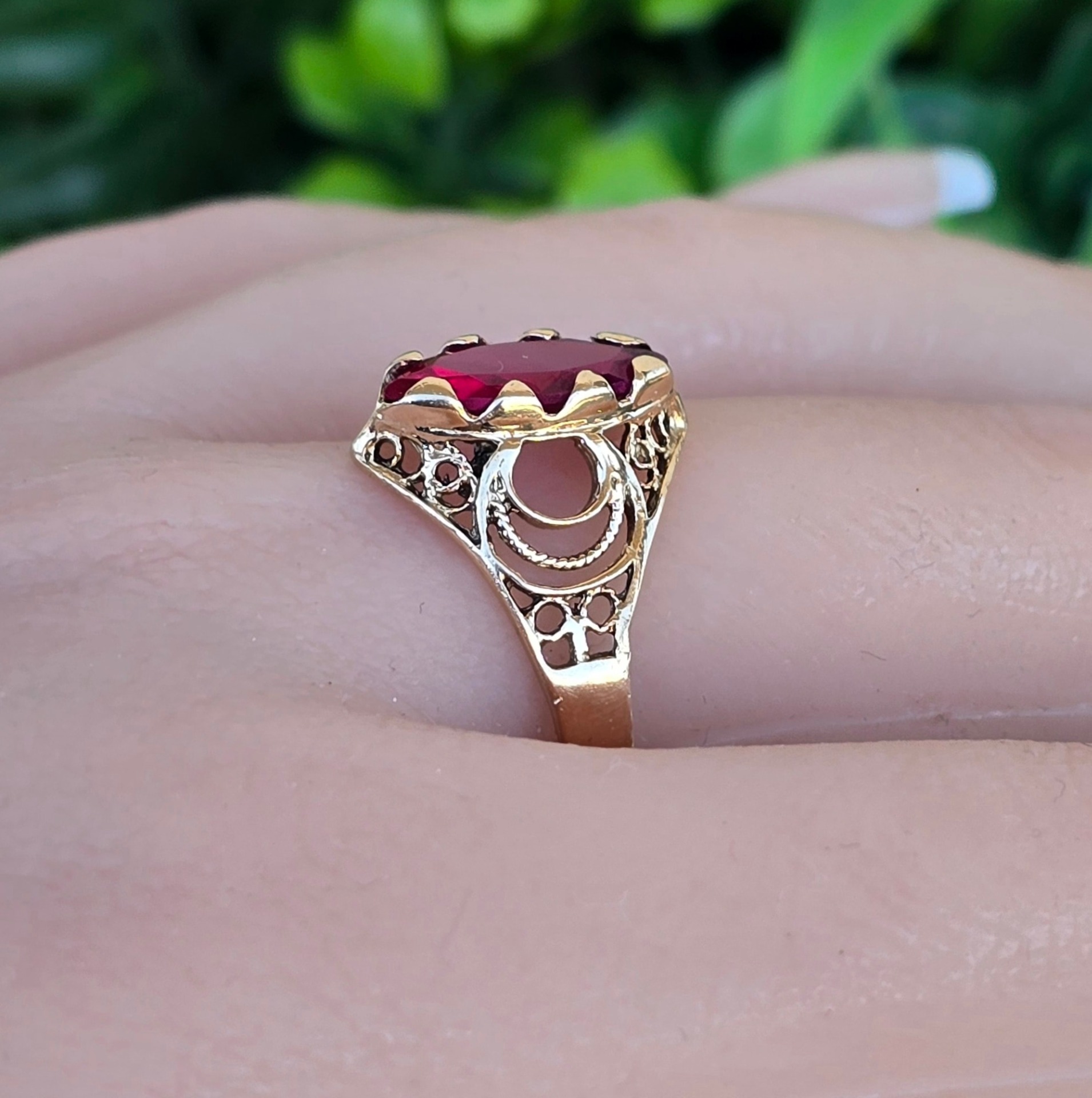 Inel vechi din aur de 14K, cu un frumos rubin de sinteză, manufactură excepțională.