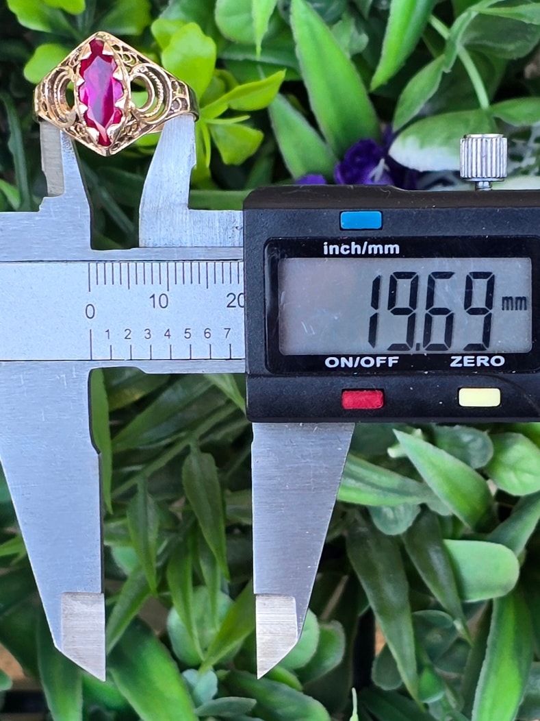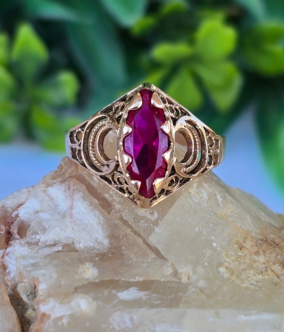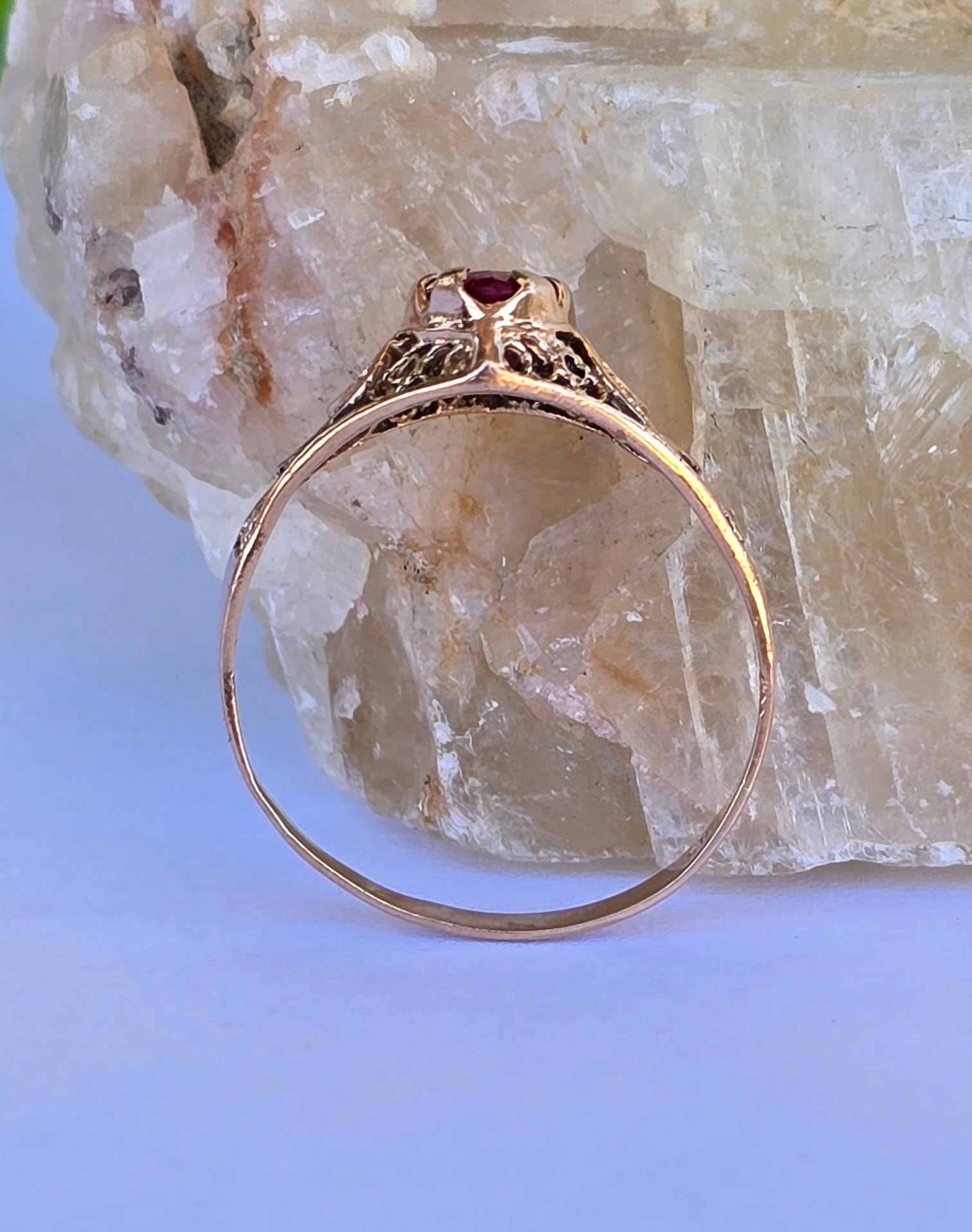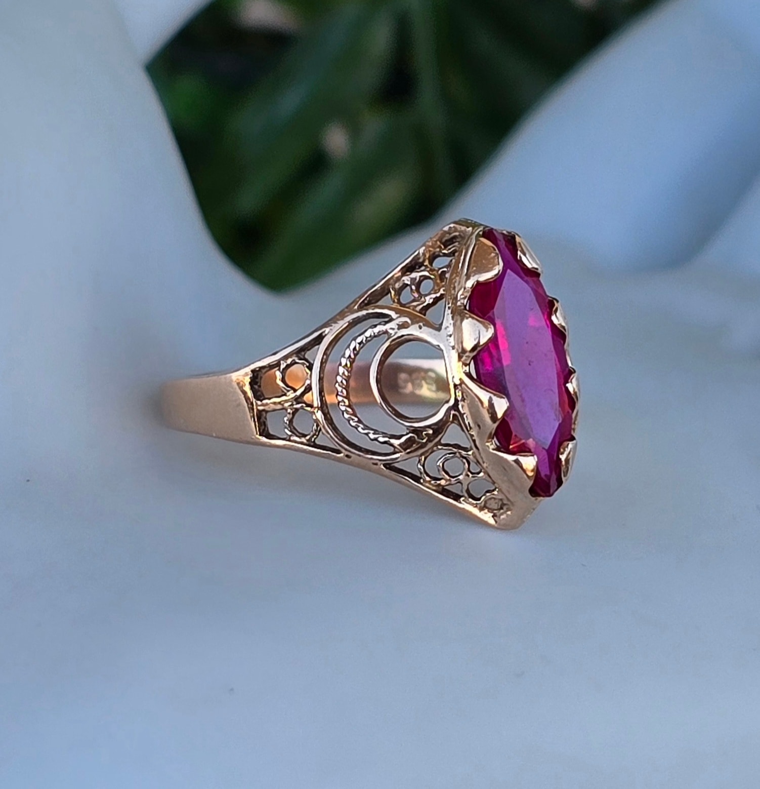 Inel vechi din aur de 14K, cu un frumos rubin de sinteză, manufactură excepțională.