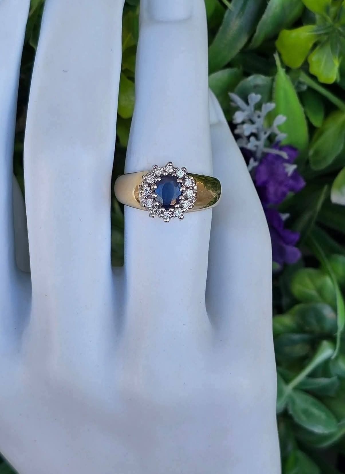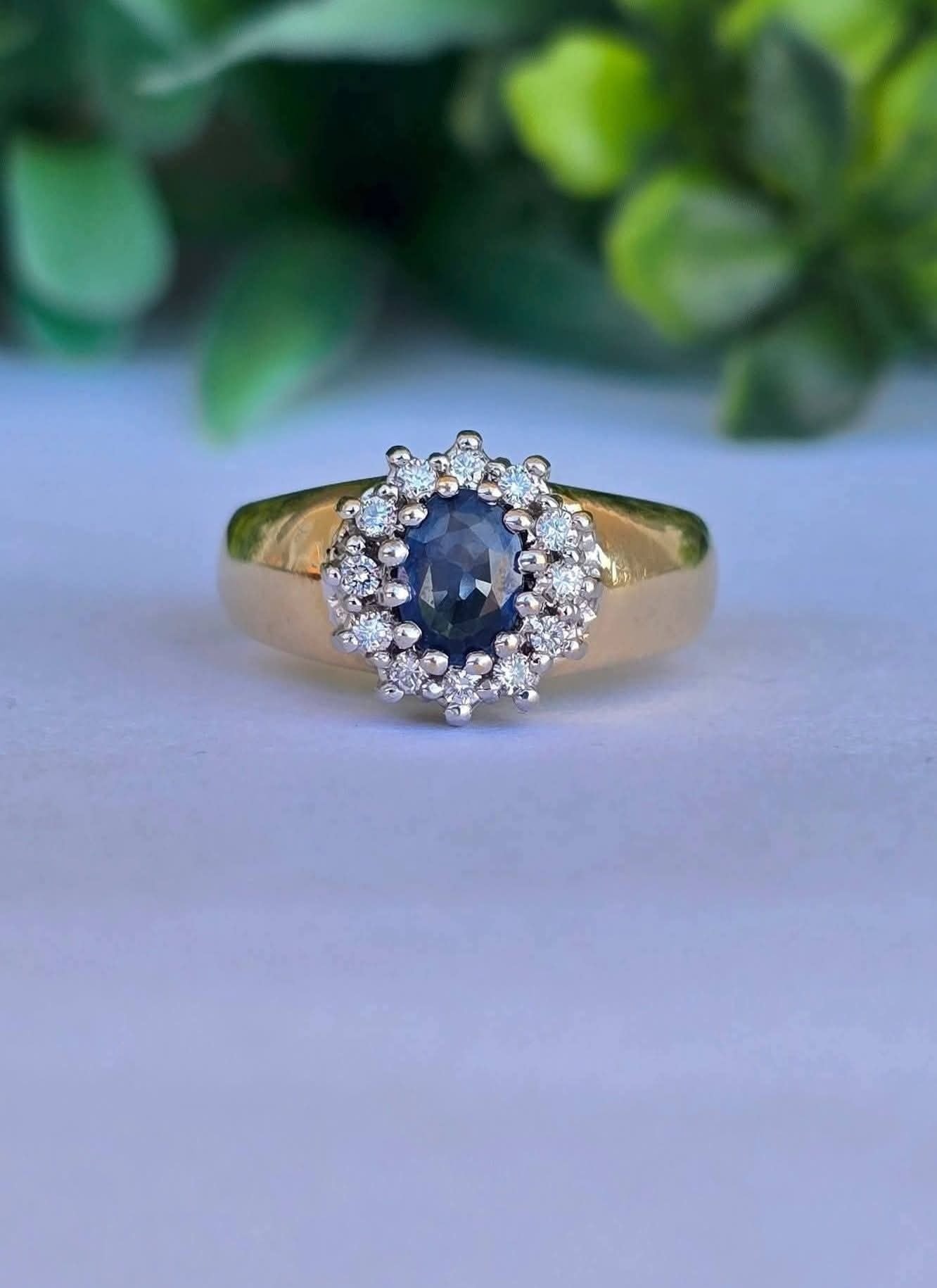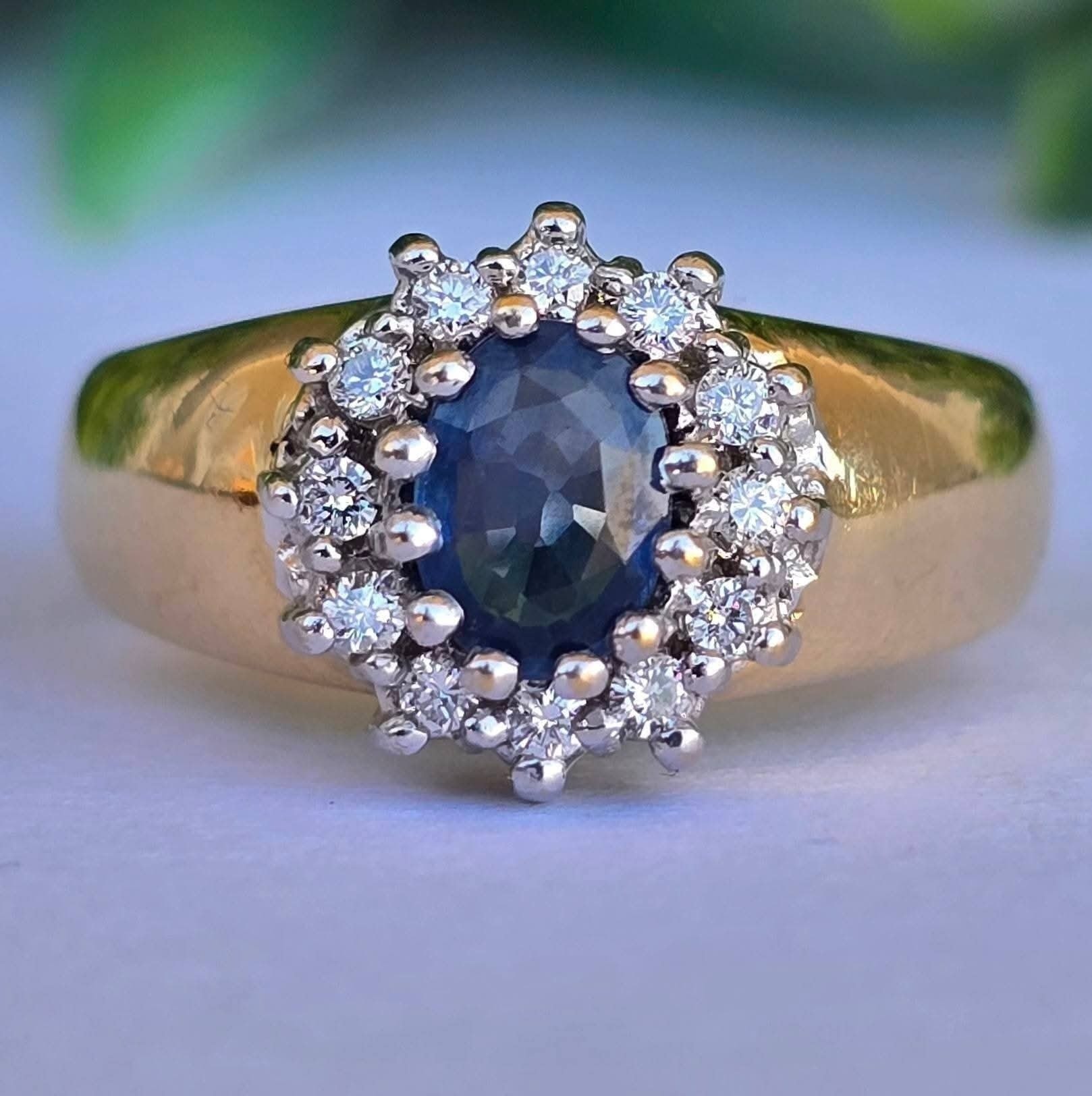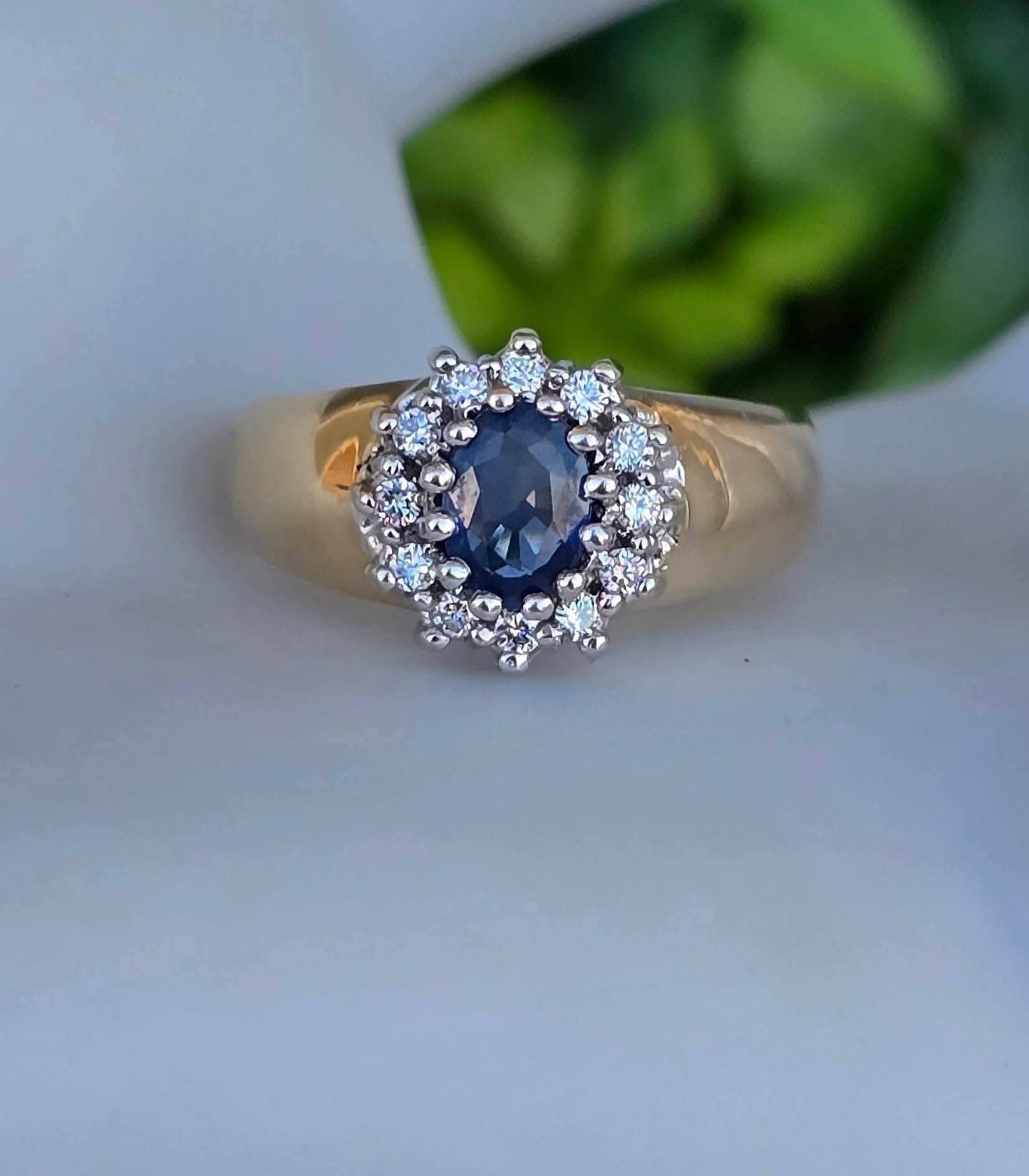 Inel vechi din aur de 14K, cu un superb safir și 12 diamante naturale de calitate superioară.