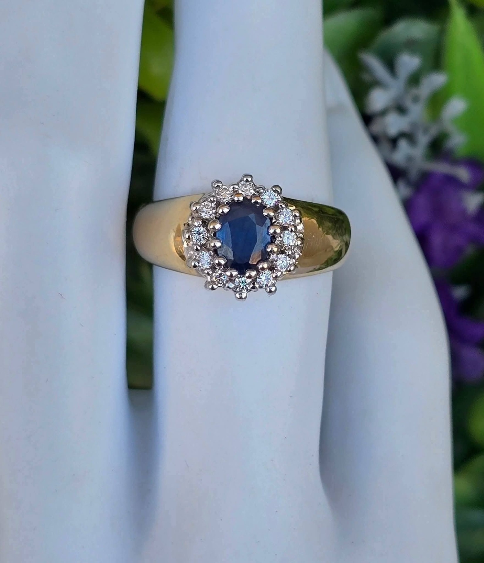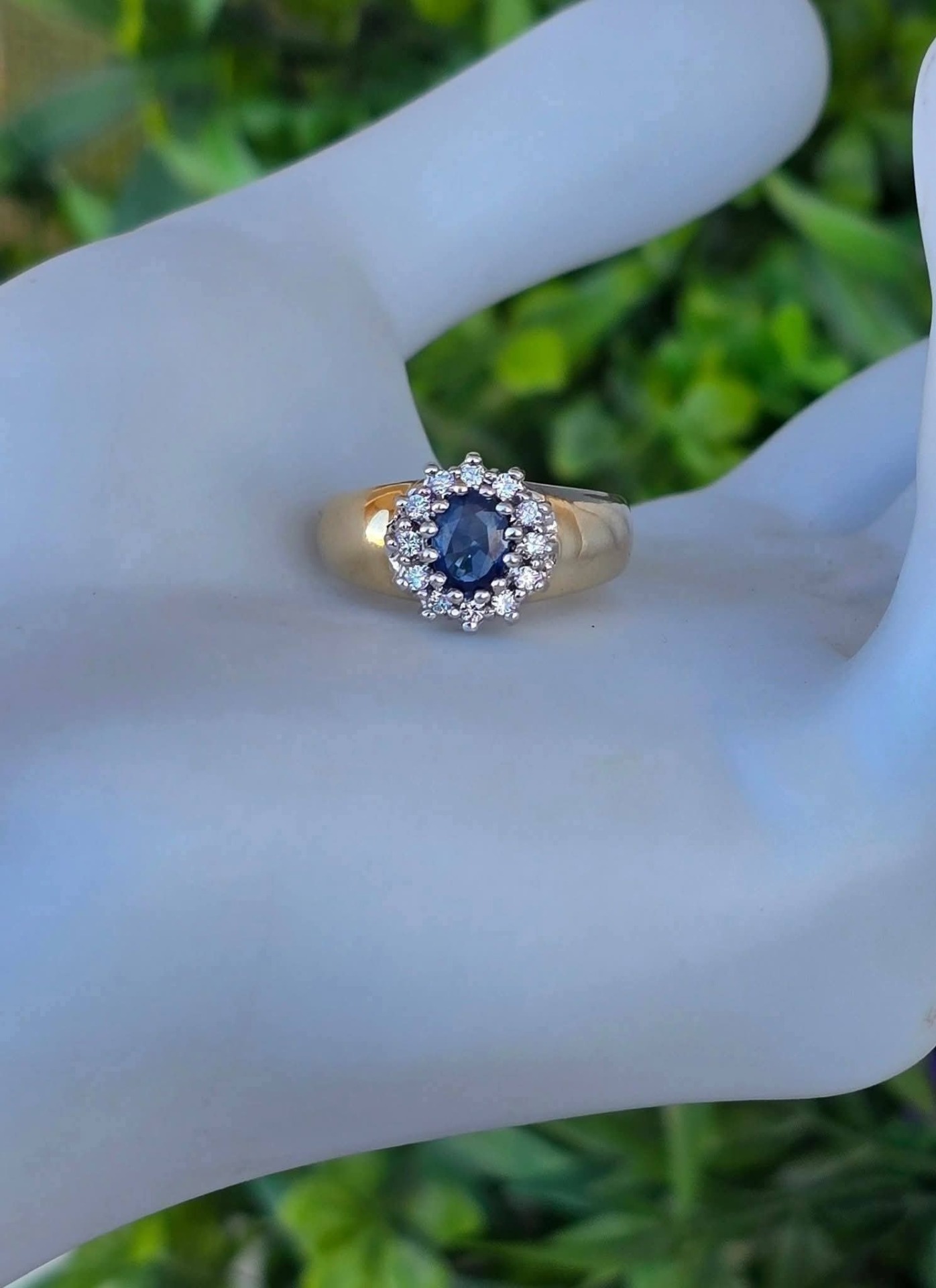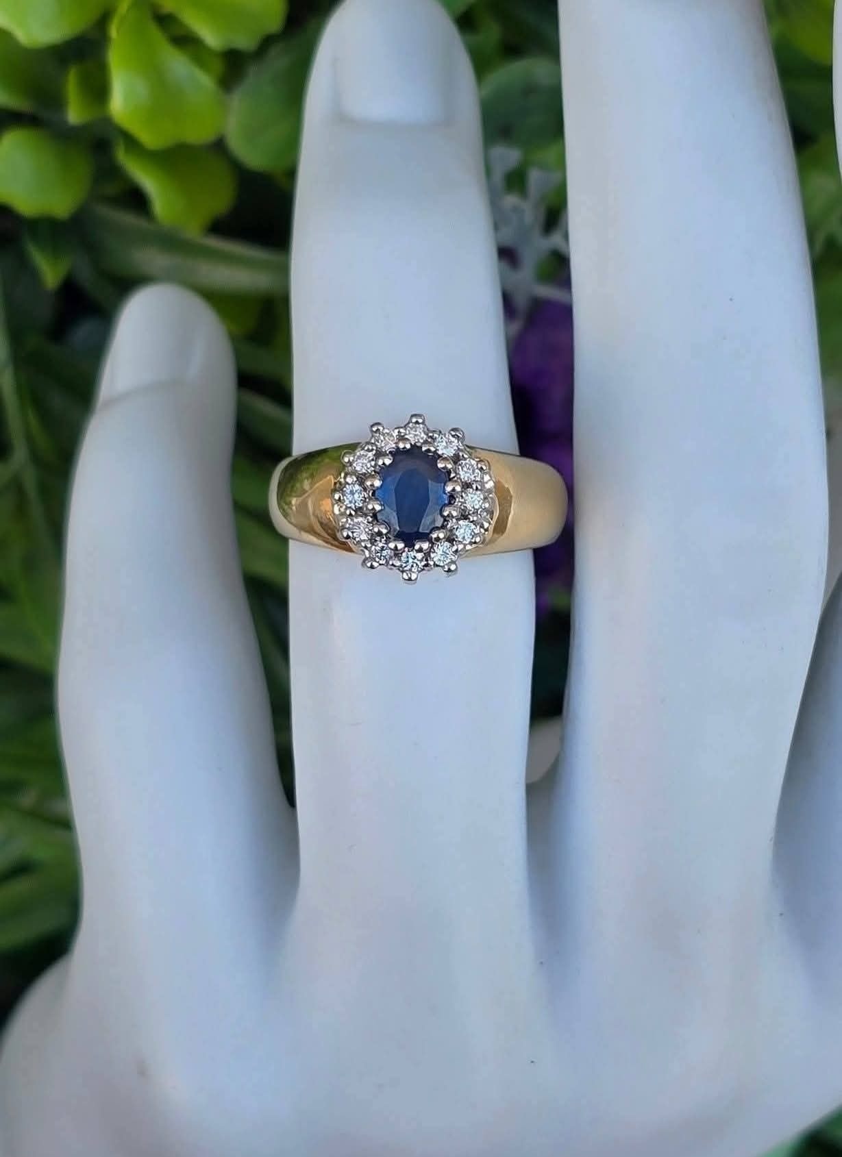Inel vechi din aur de 14K, cu un superb safir și 12 diamante naturale de calitate superioară.
