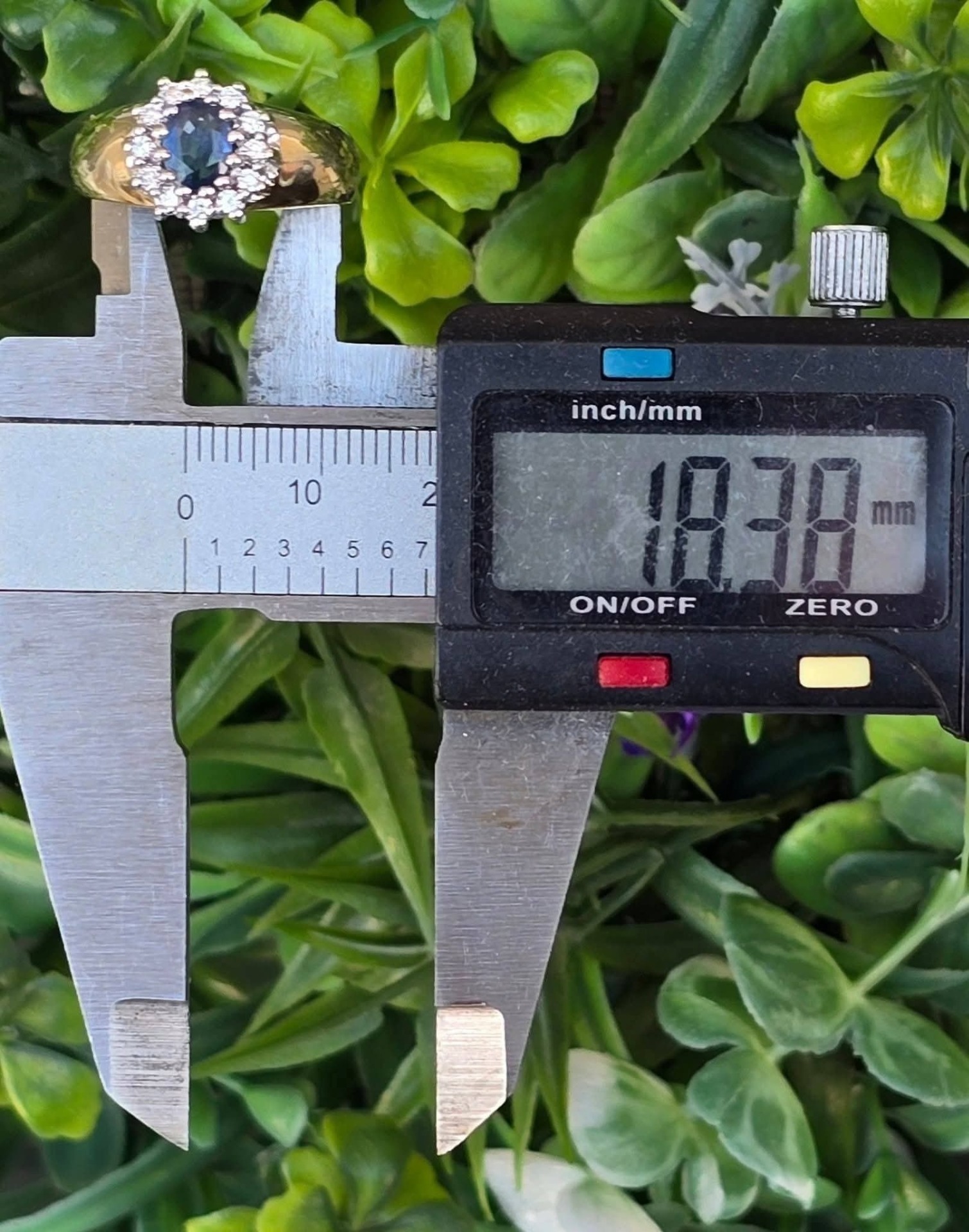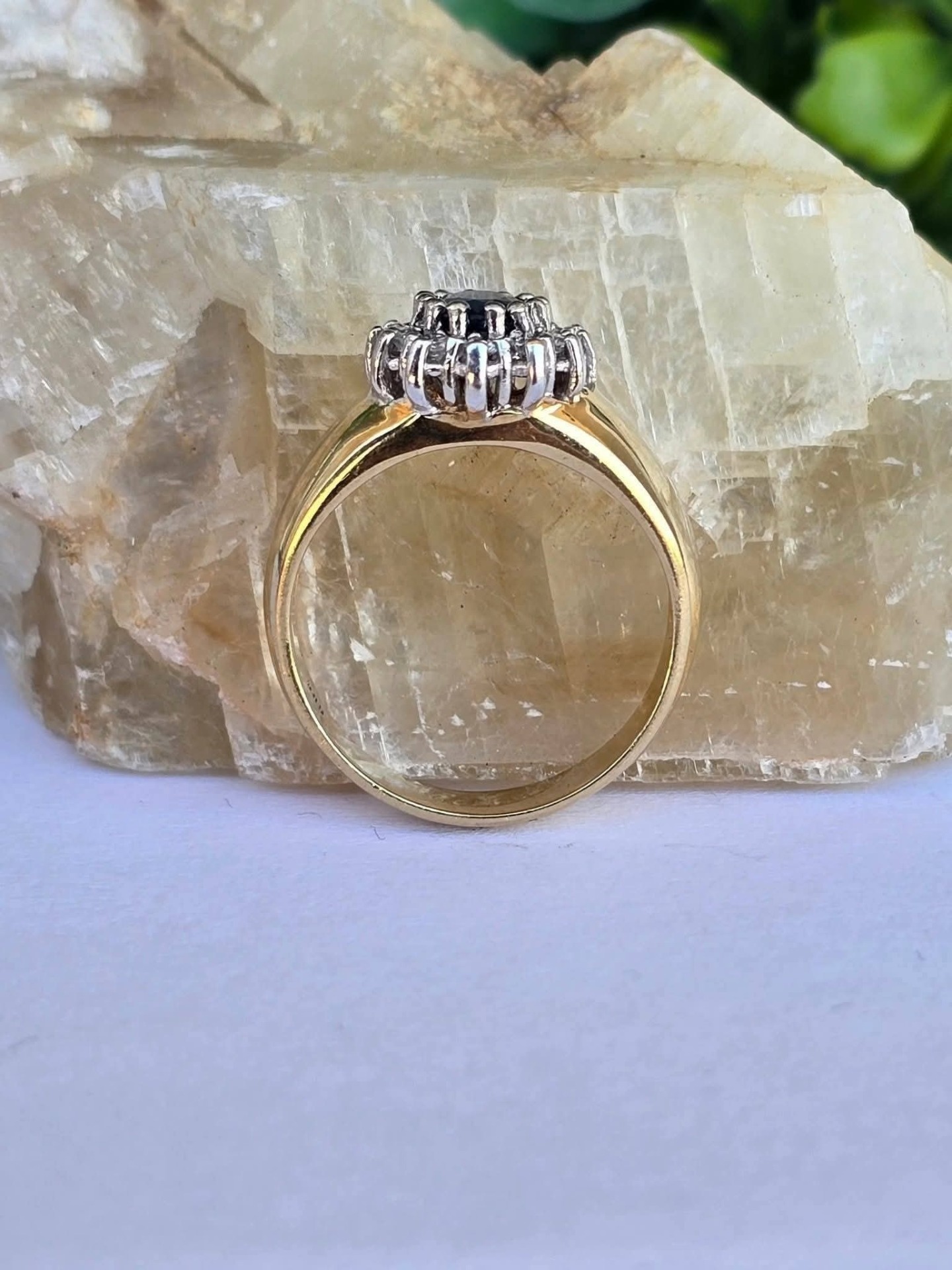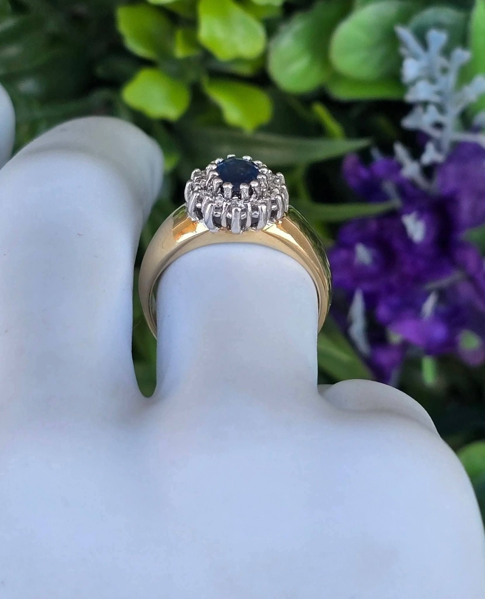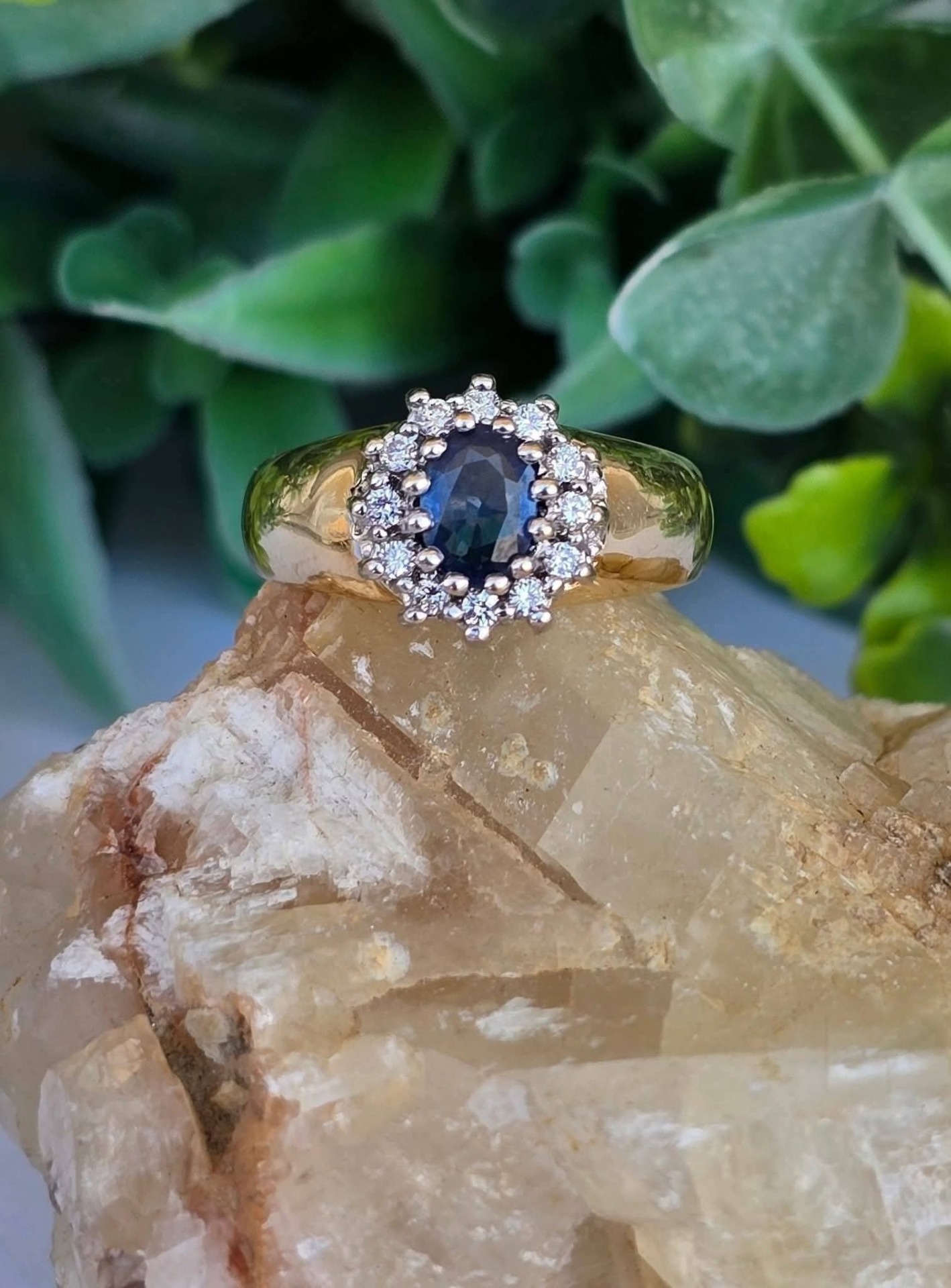 Inel vechi din aur de 14K, cu un superb safir și 12 diamante naturale de calitate superioară.