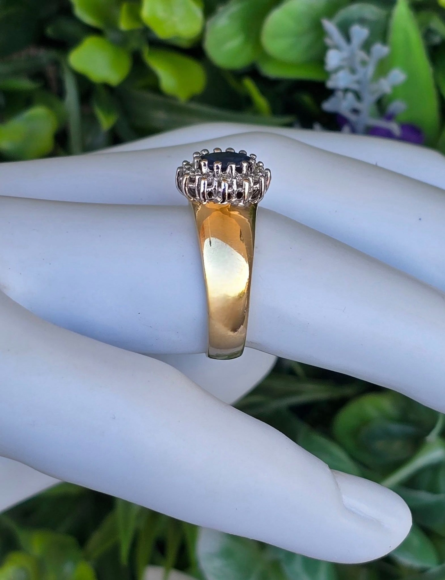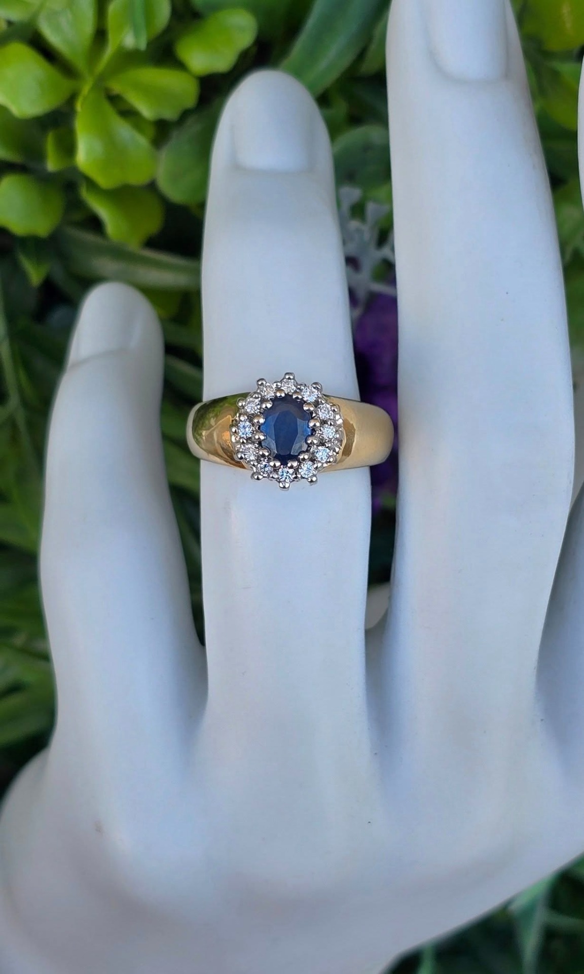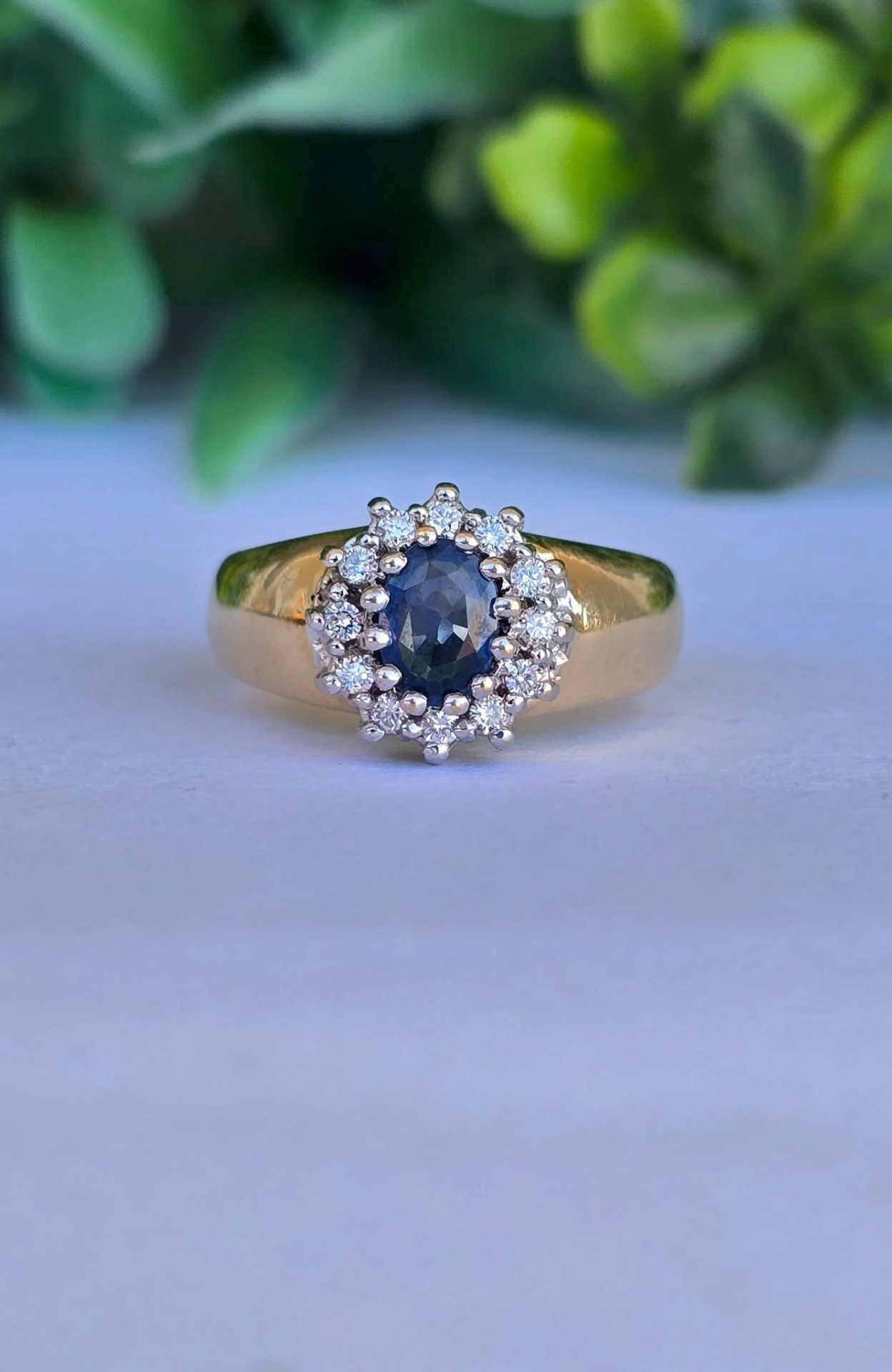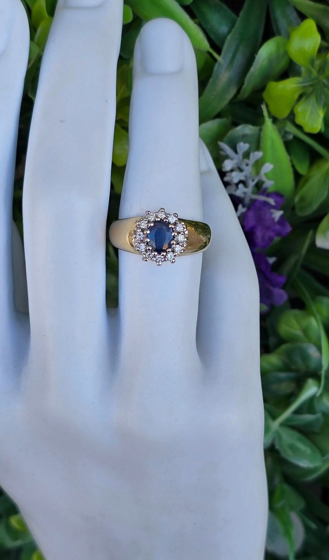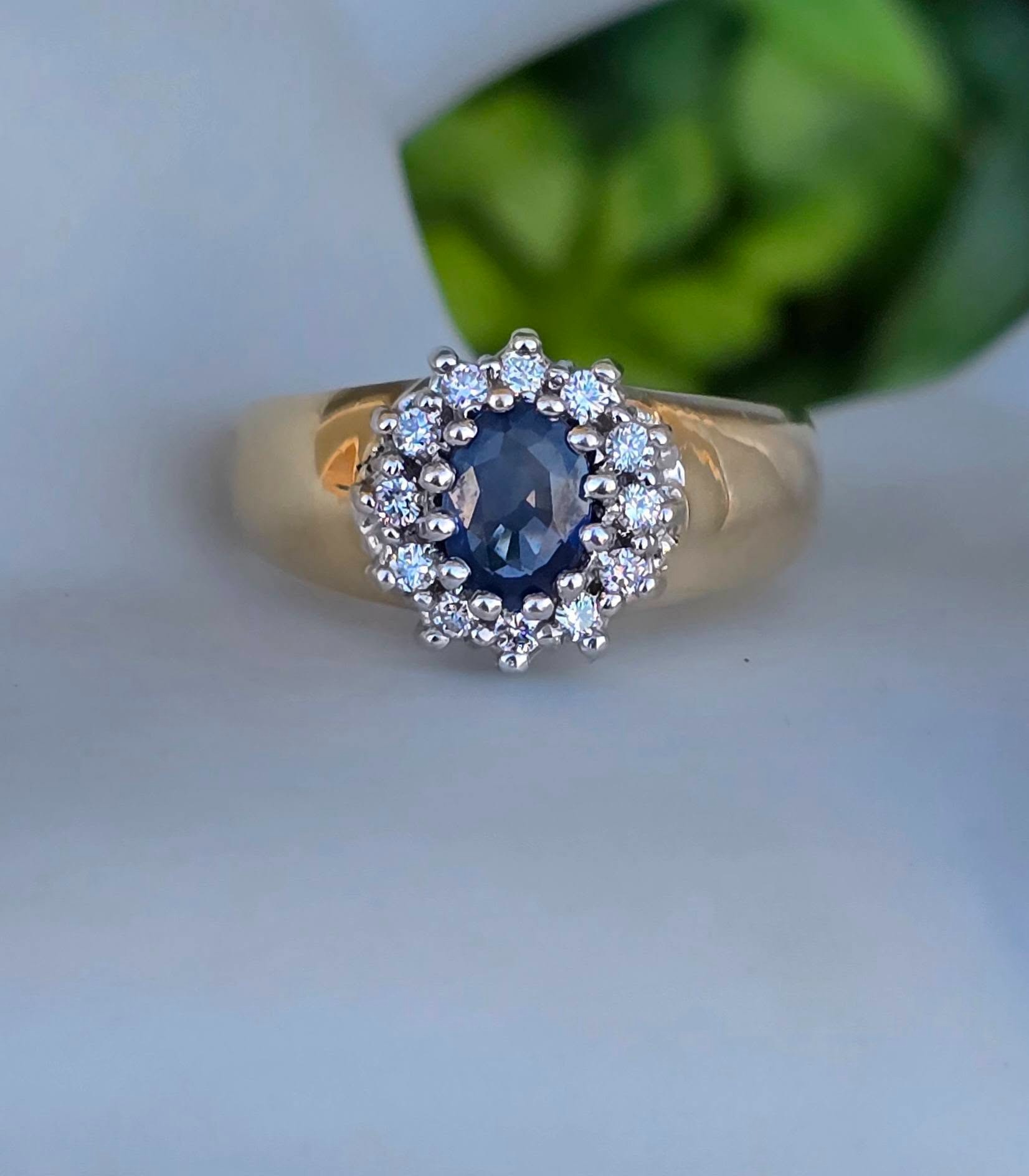 Inel vechi din aur de 14K, cu un superb safir și 12 diamante naturale de calitate superioară.