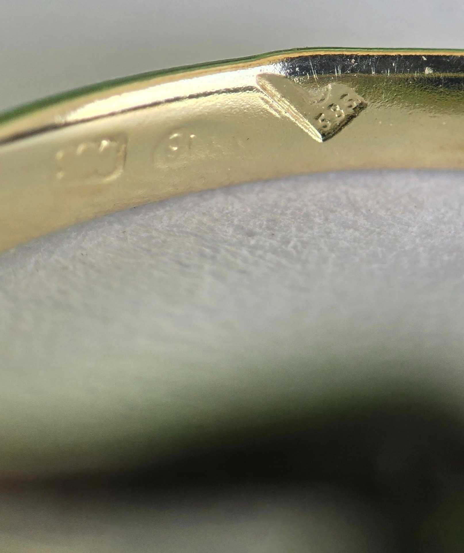 Prezintă marcaj 585 pentru puritate aur de 14K și marcaj de meșter.