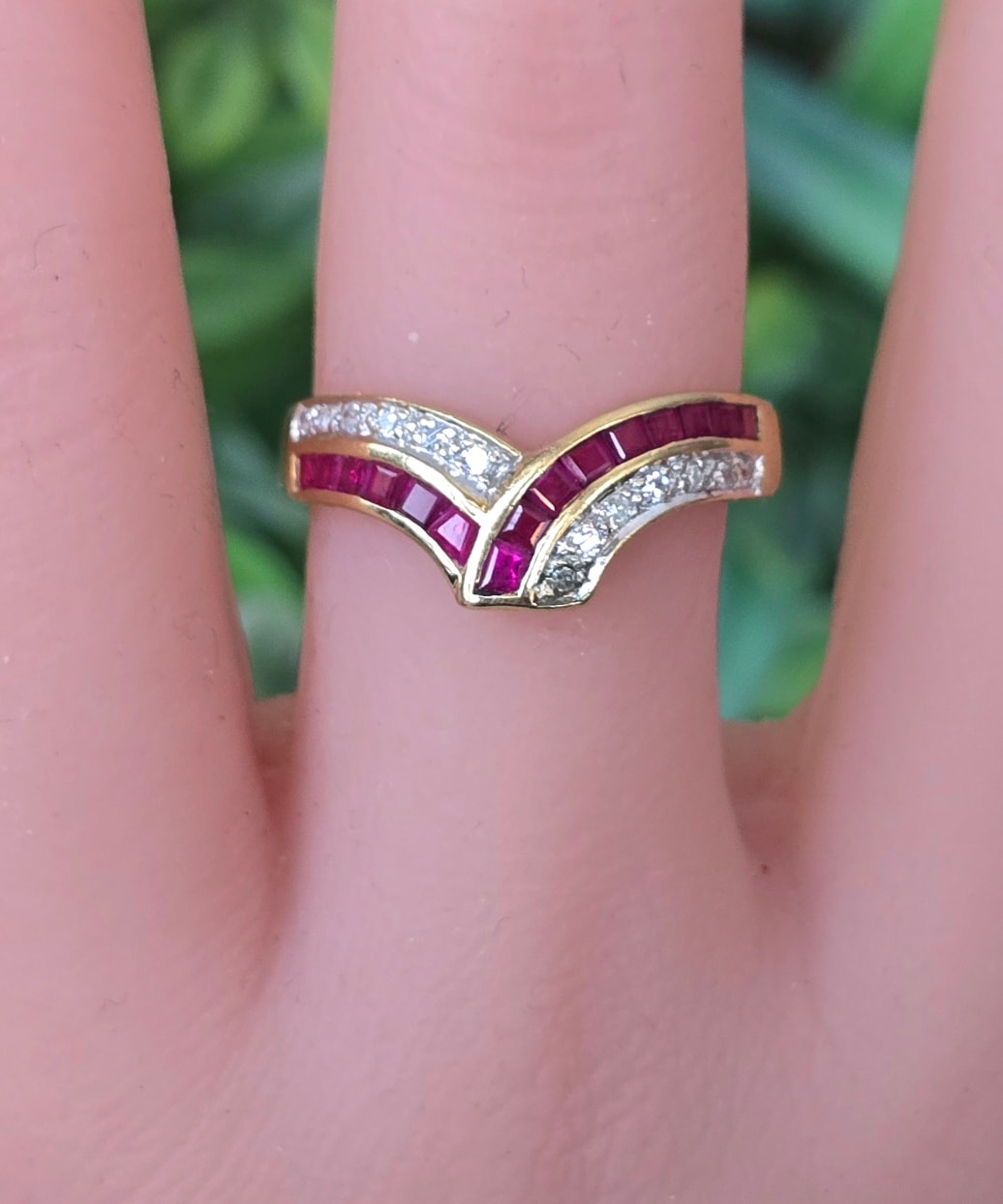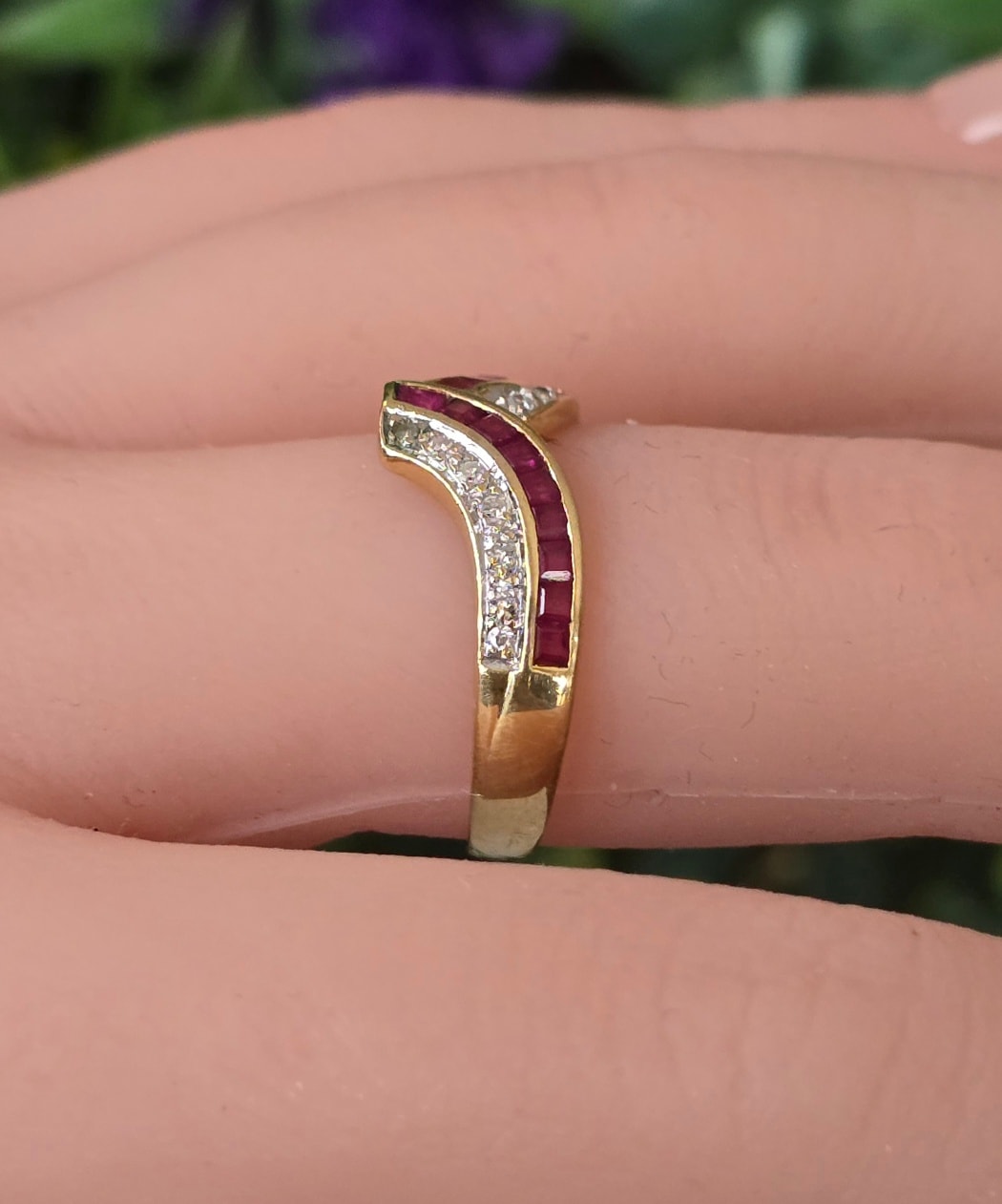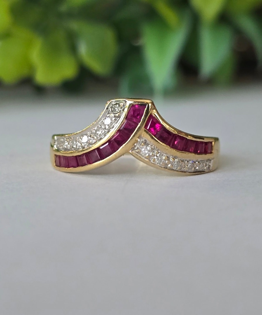 Inel vechi din aur de 18K, cu 13 diamante și 15 rubine naturale.