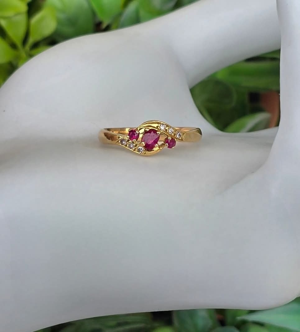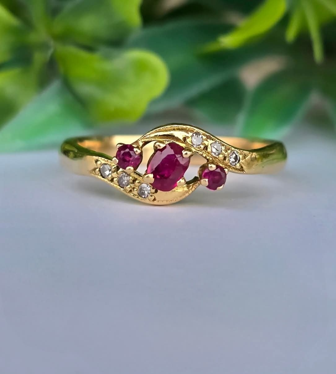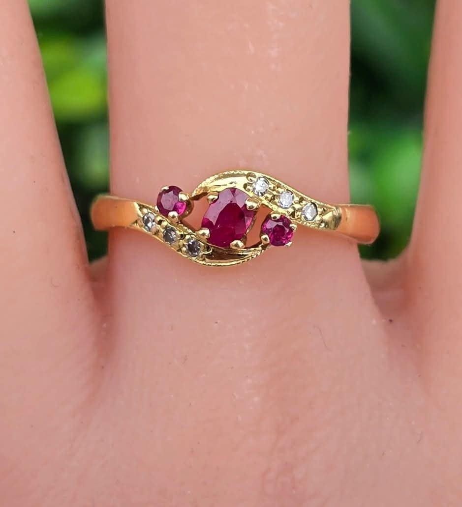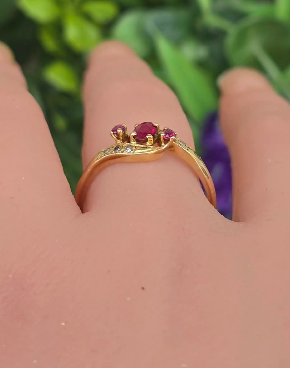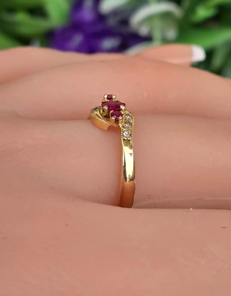 Inel vechi din aur de 18K, cu 3 rubine și 6 diamante naturale.