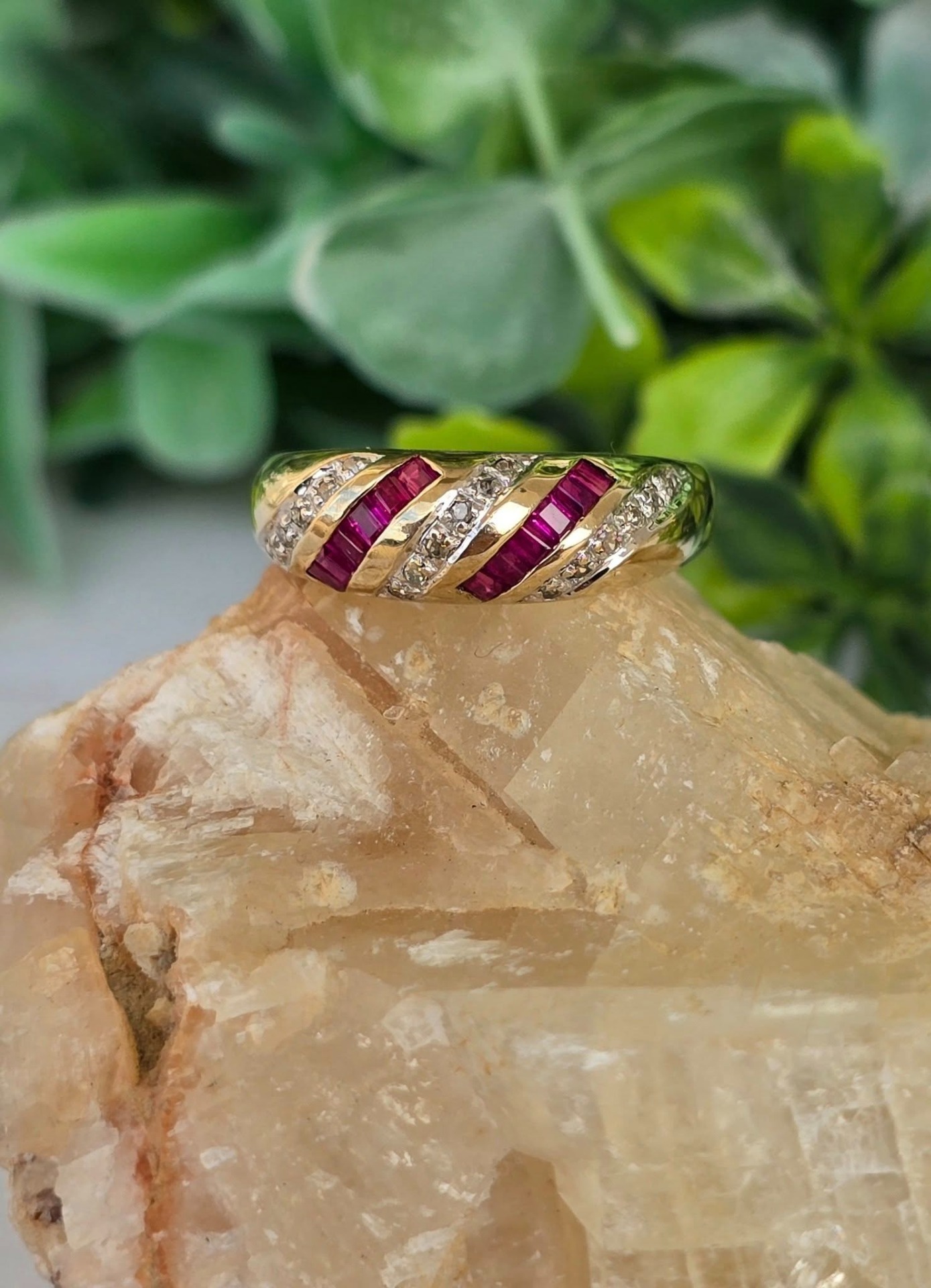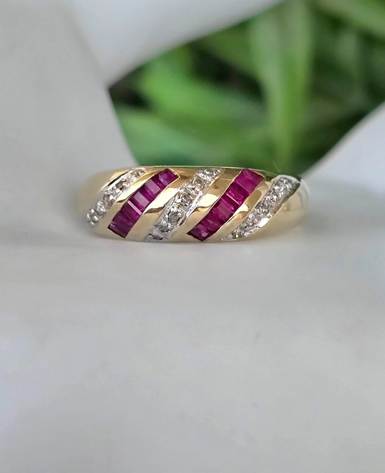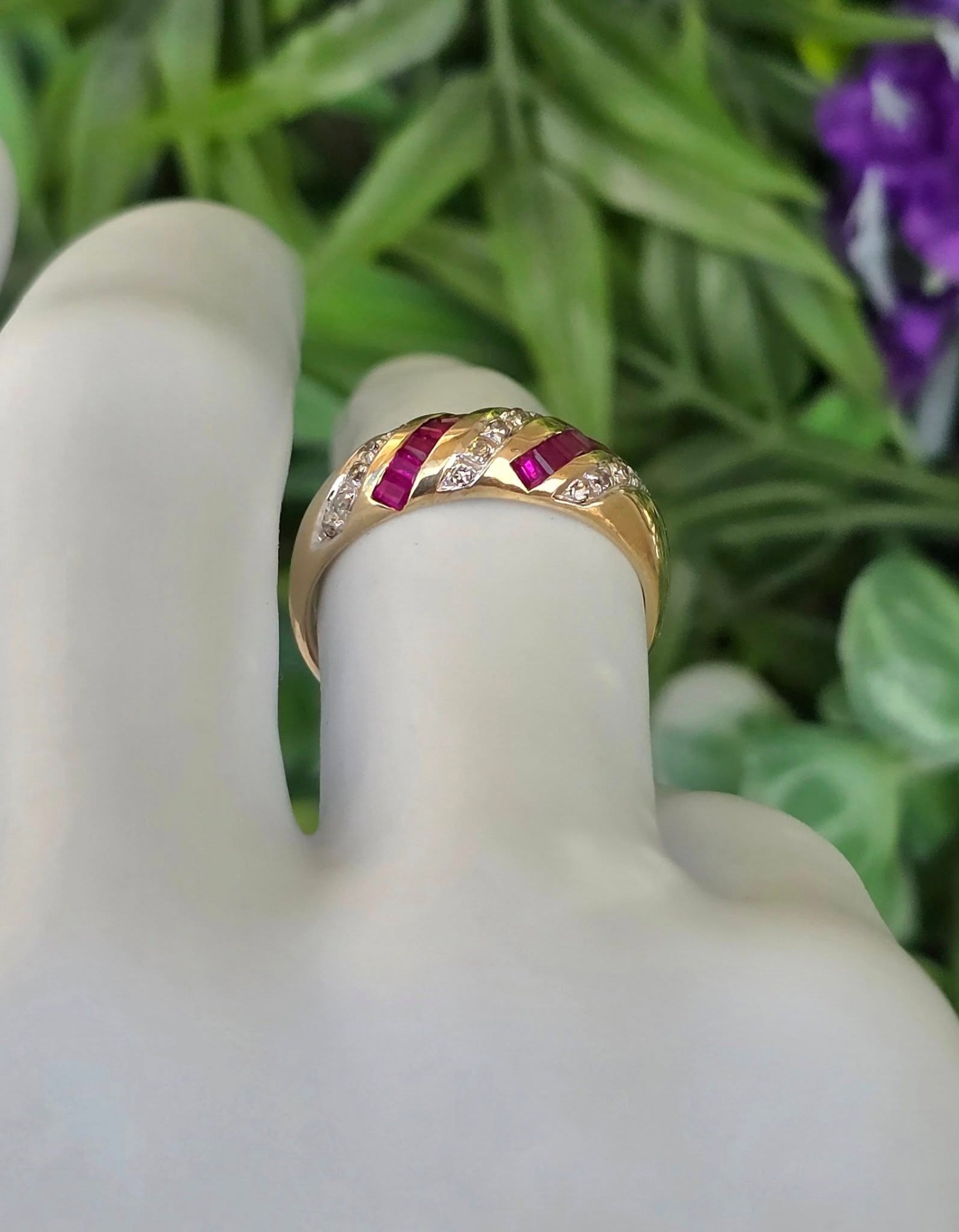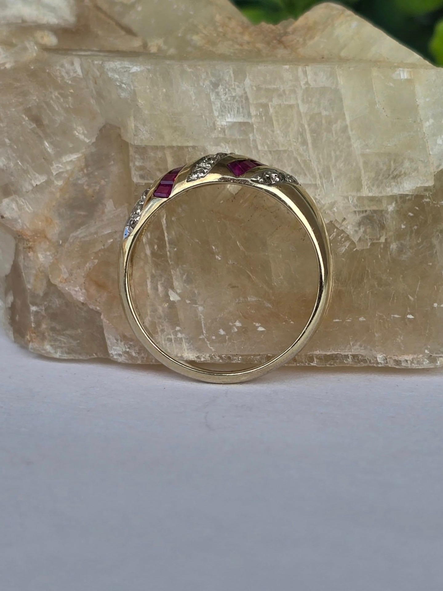 Inel vechi din aur de 8K, cu 12 rubine și 18 diamante naturale.