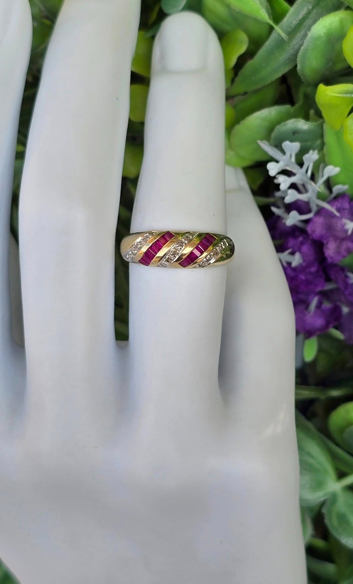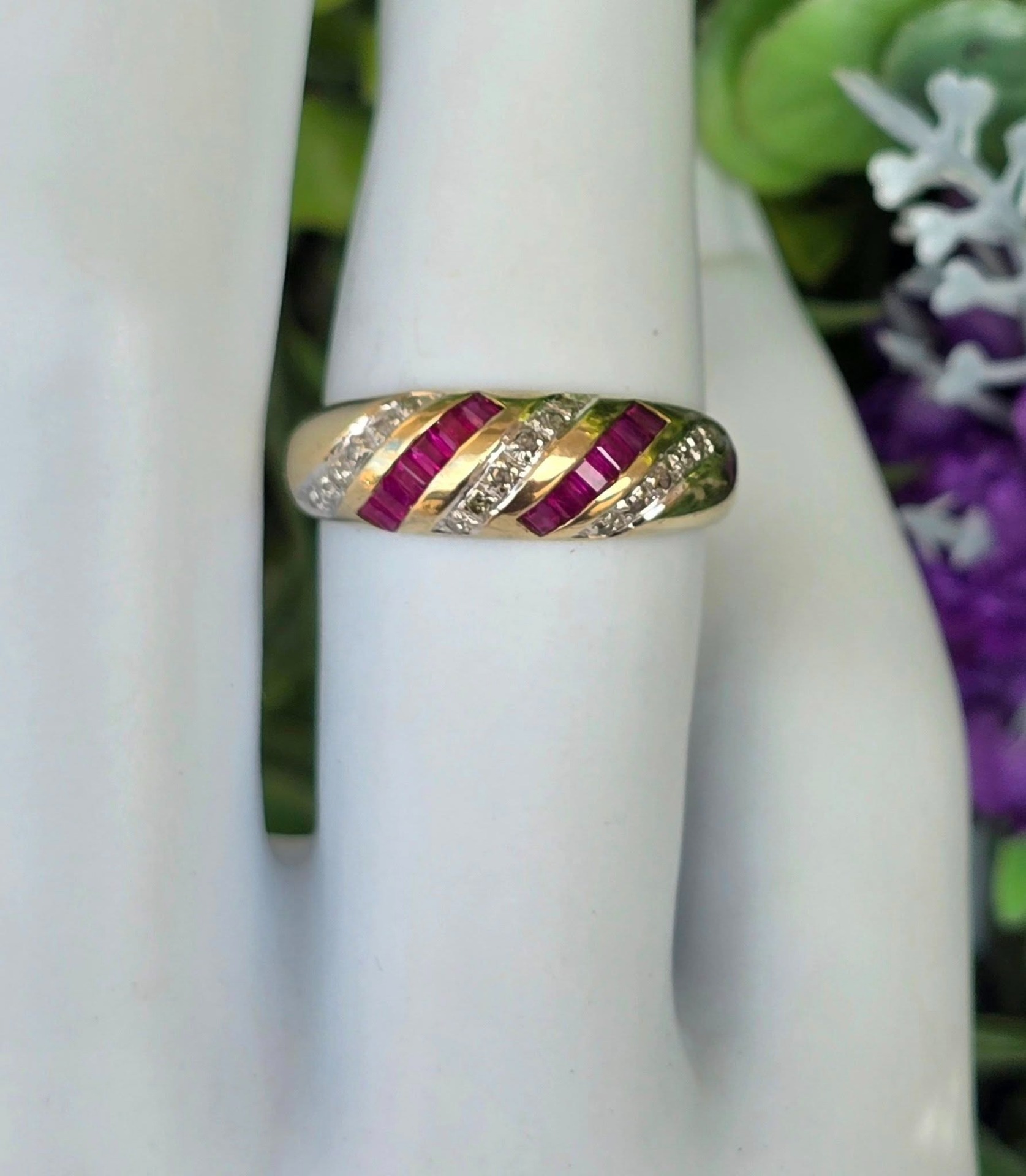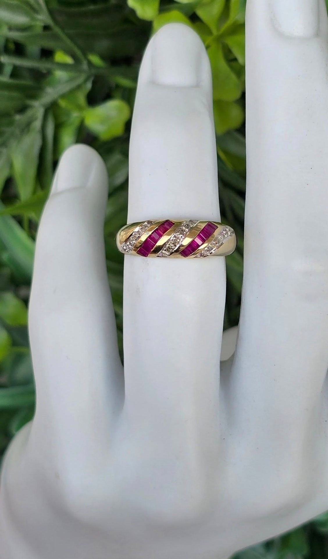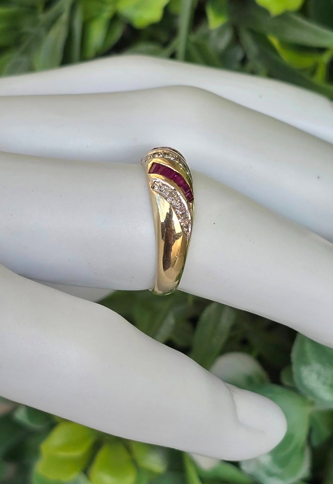 Inel vechi din aur de 8K, cu 12 rubine și 18 diamante naturale.