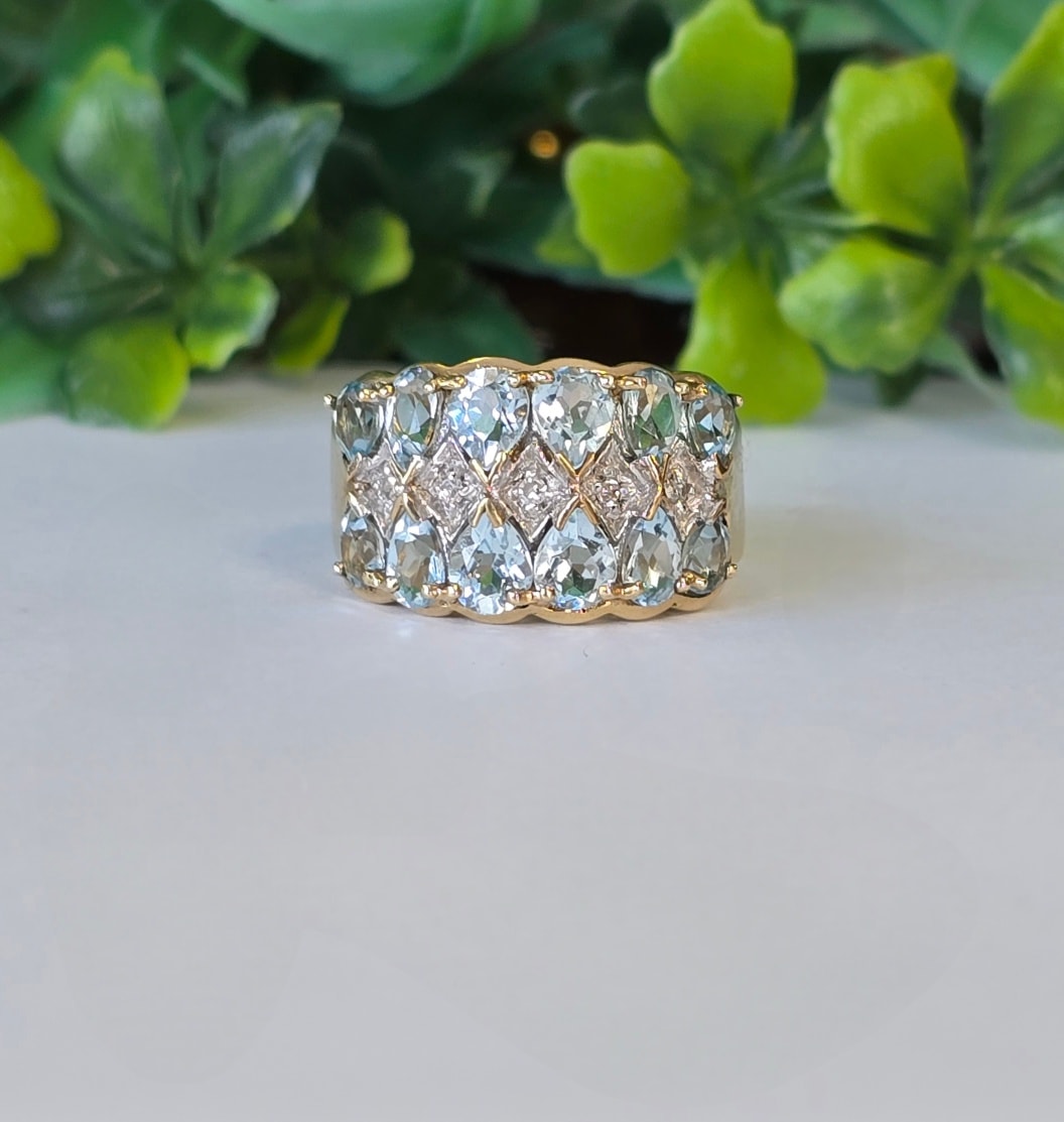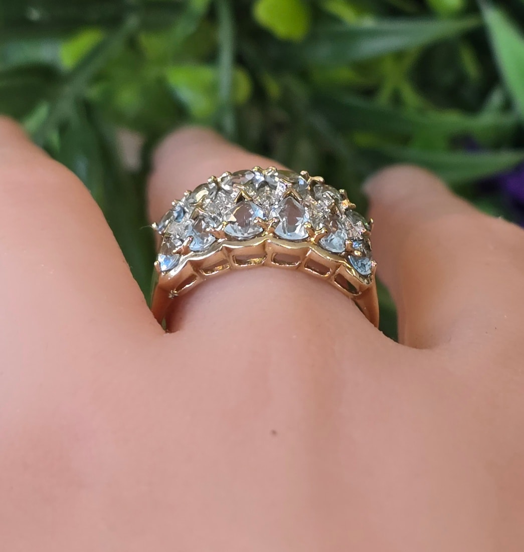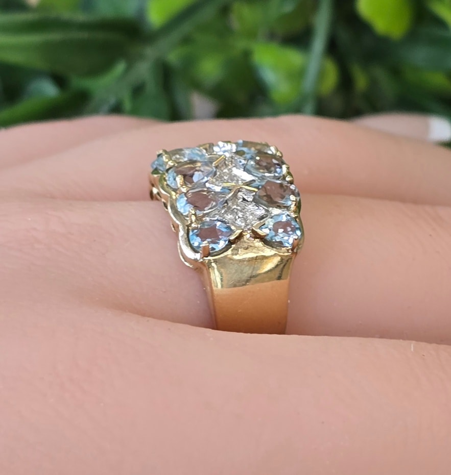 Inel vechi din aur de 8K, cu 12 topaze "light blue" și 5 diamante naturale.