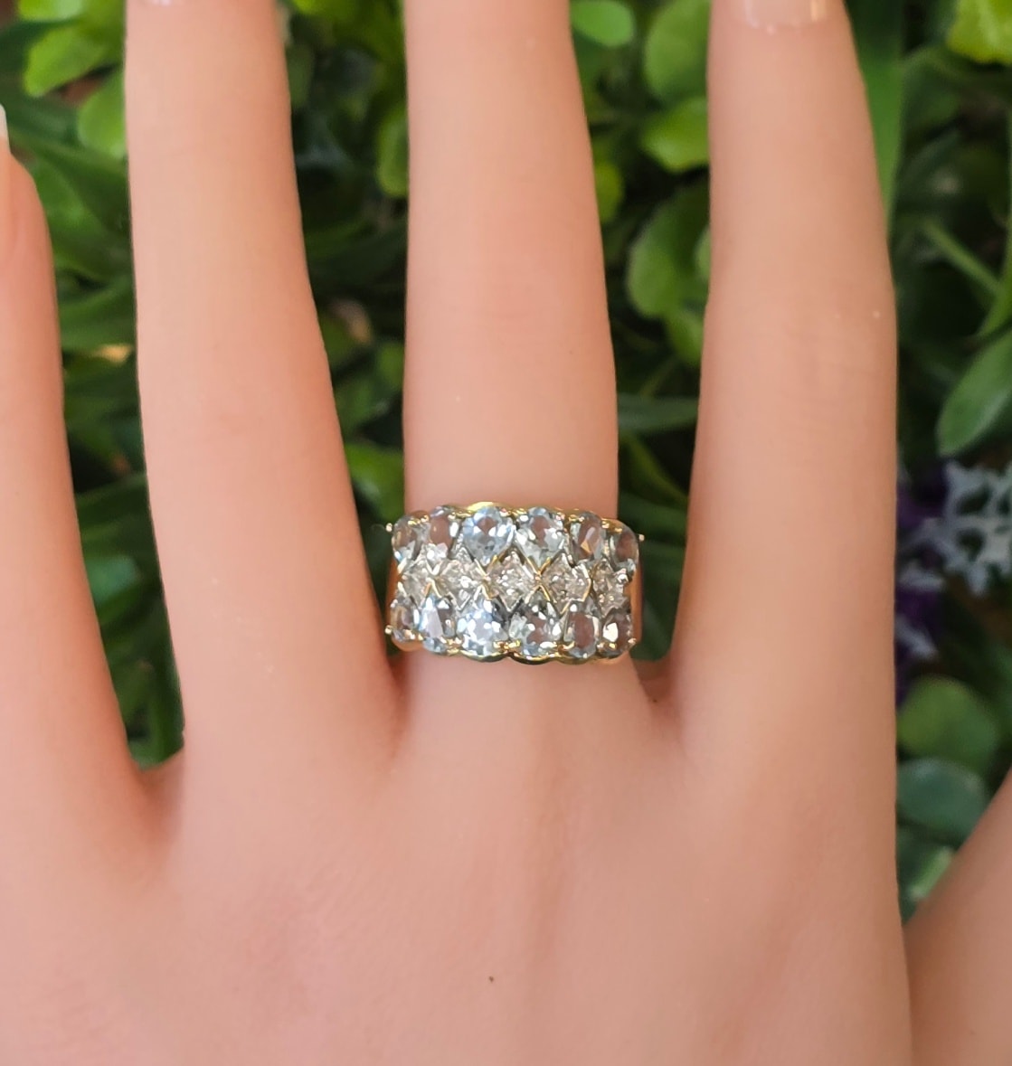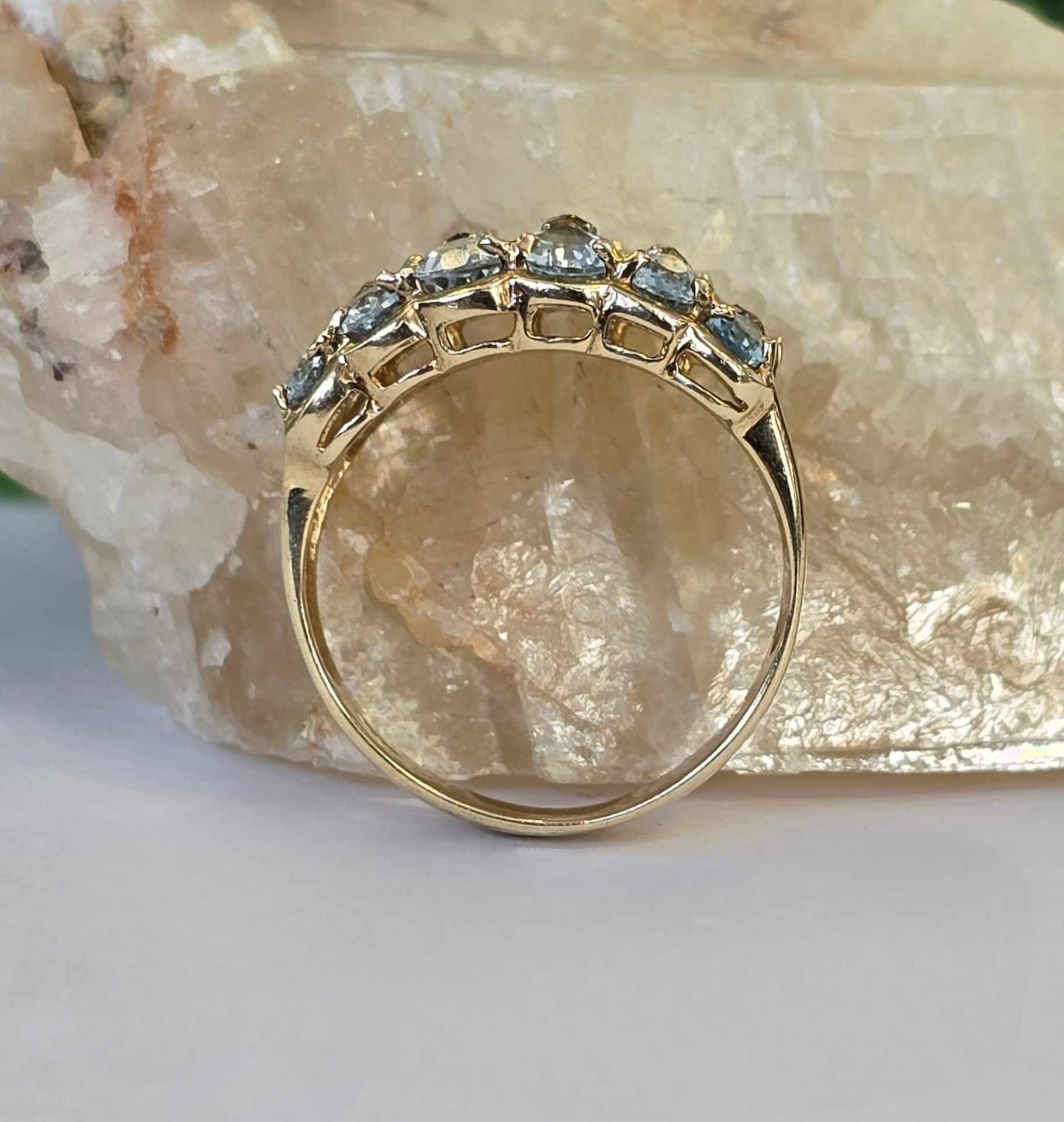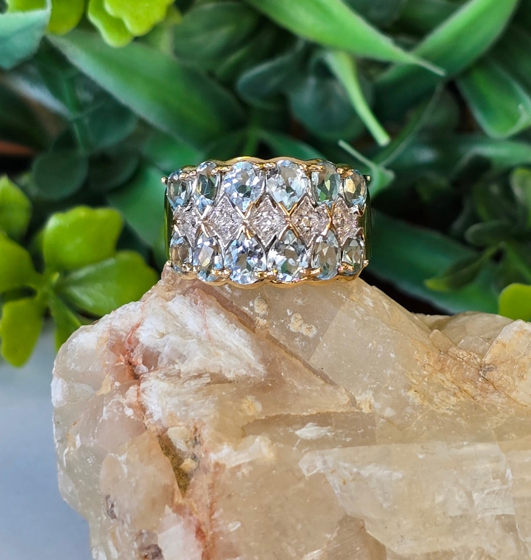 Inel vechi din aur de 8K, cu 12 topaze "light blue" și 5 diamante naturale.