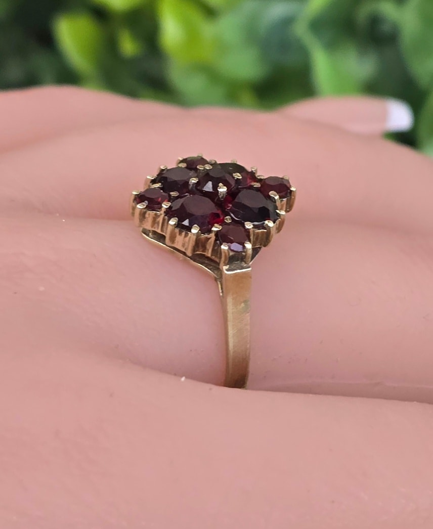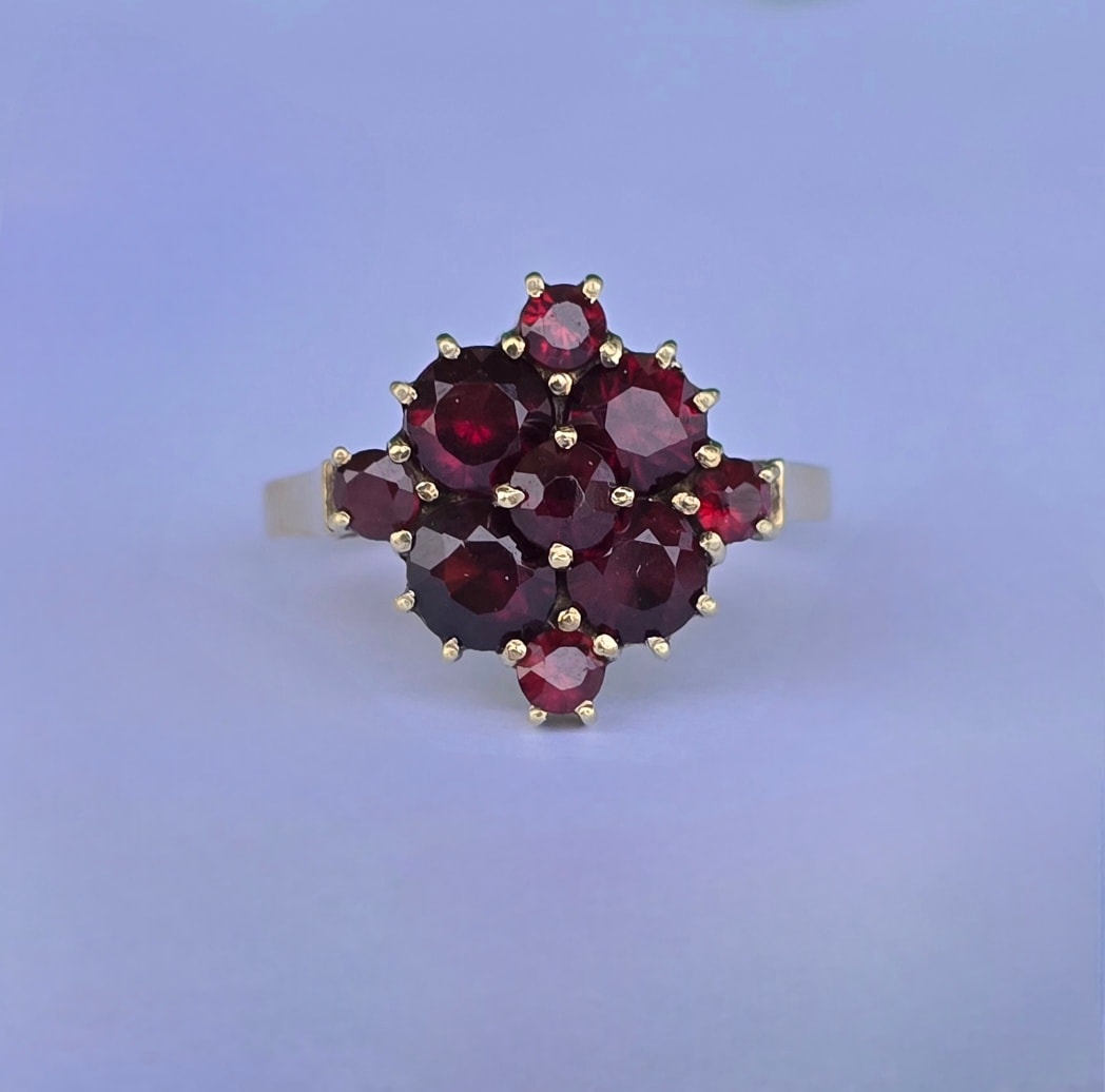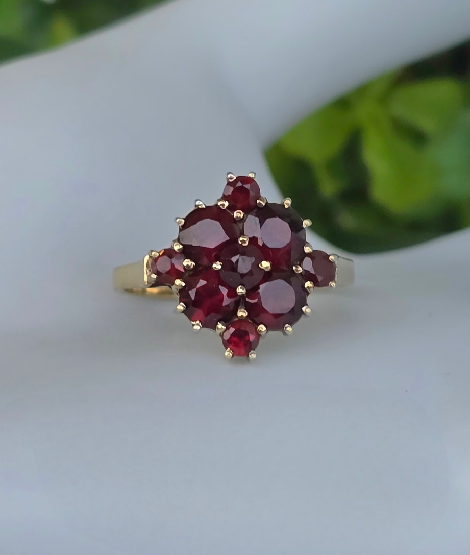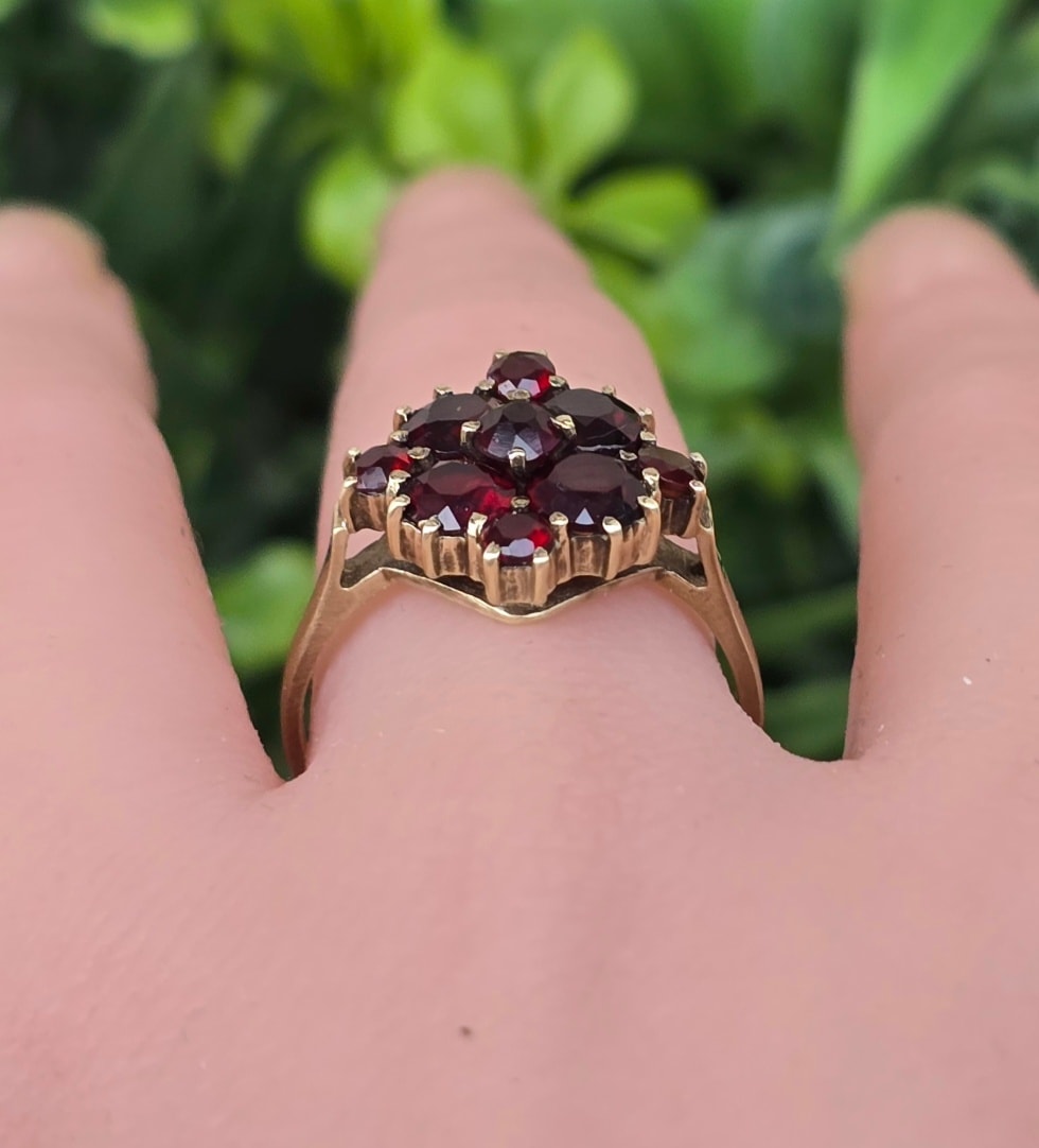 Inel vechi din aur de 8K, cu 9 granate Bohemia naturale de calitate superioară, manufactură de excepție.