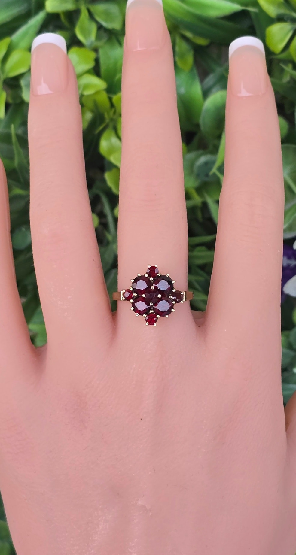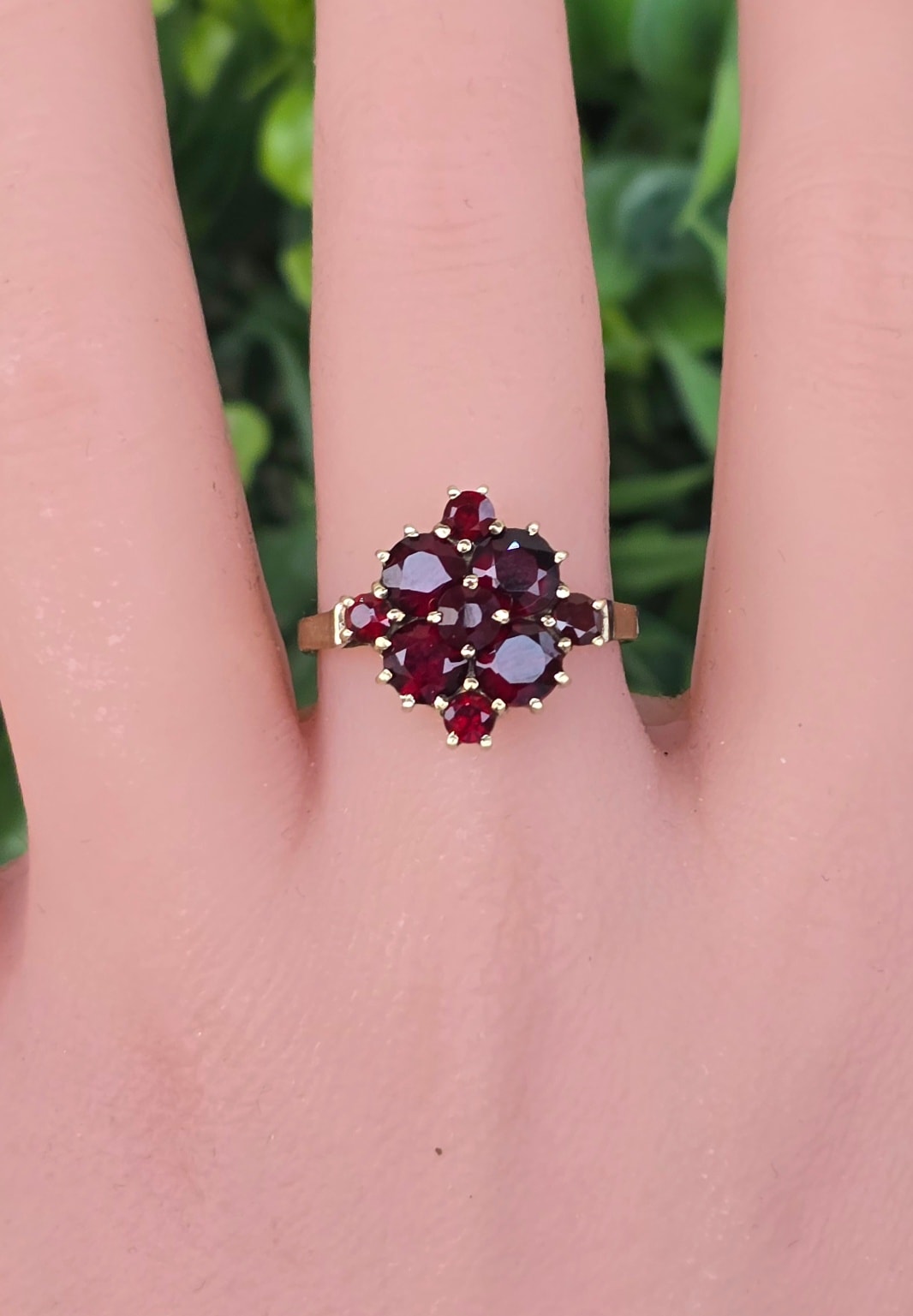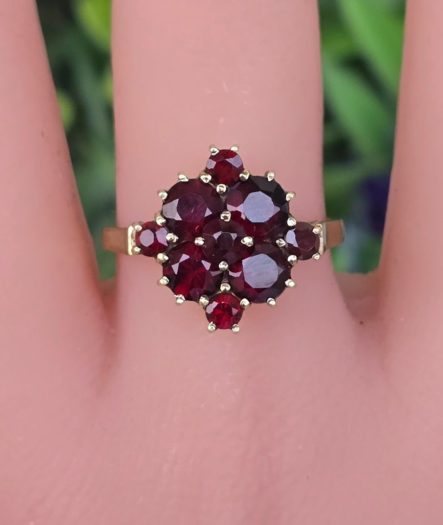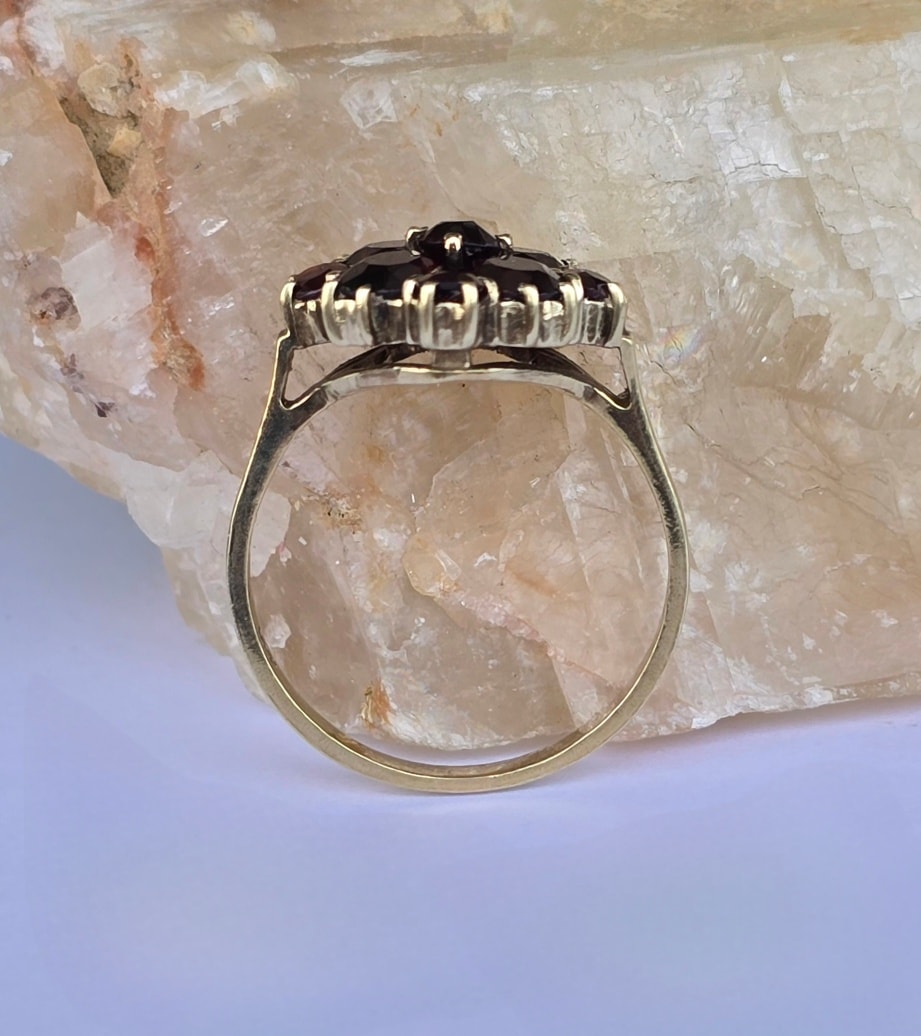 Inel vechi din aur de 8K, cu 9 granate Bohemia naturale de calitate superioară, manufactură de excepție.