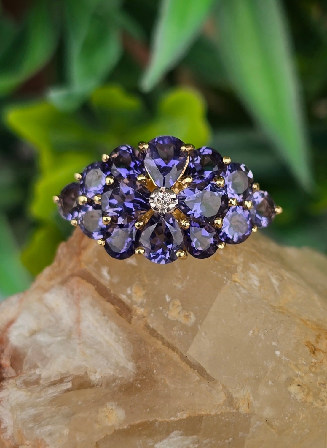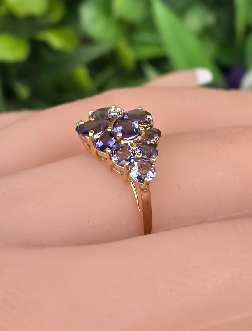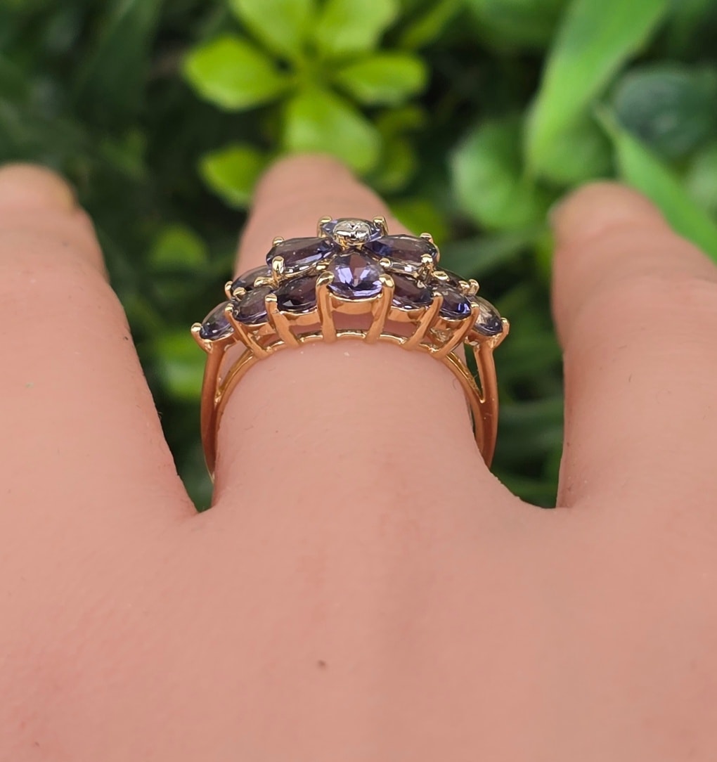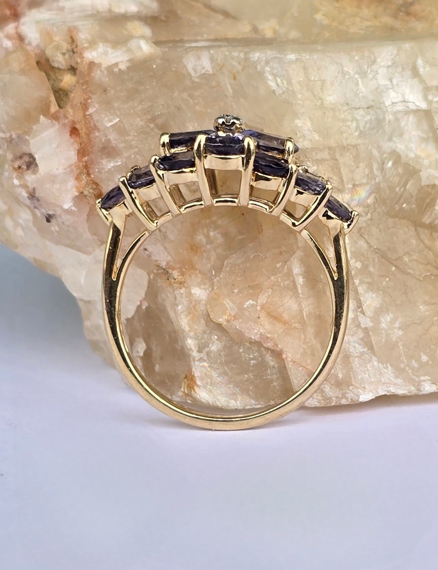 Inel vechi din aur de 9K, cu diamant și 14 iolite (safire de apă) naturale.
