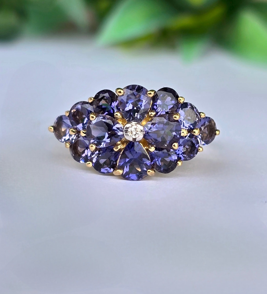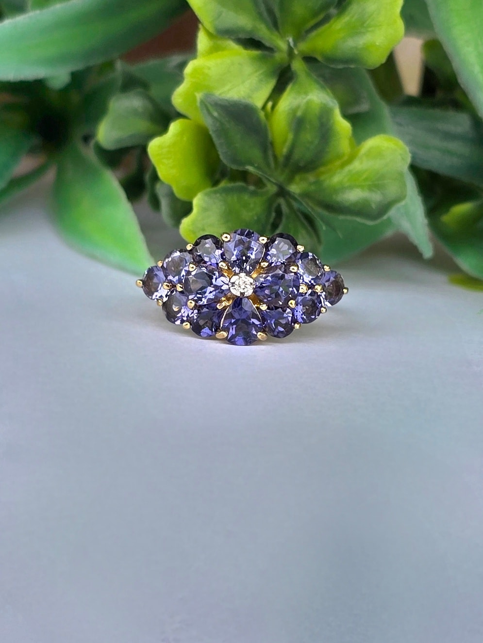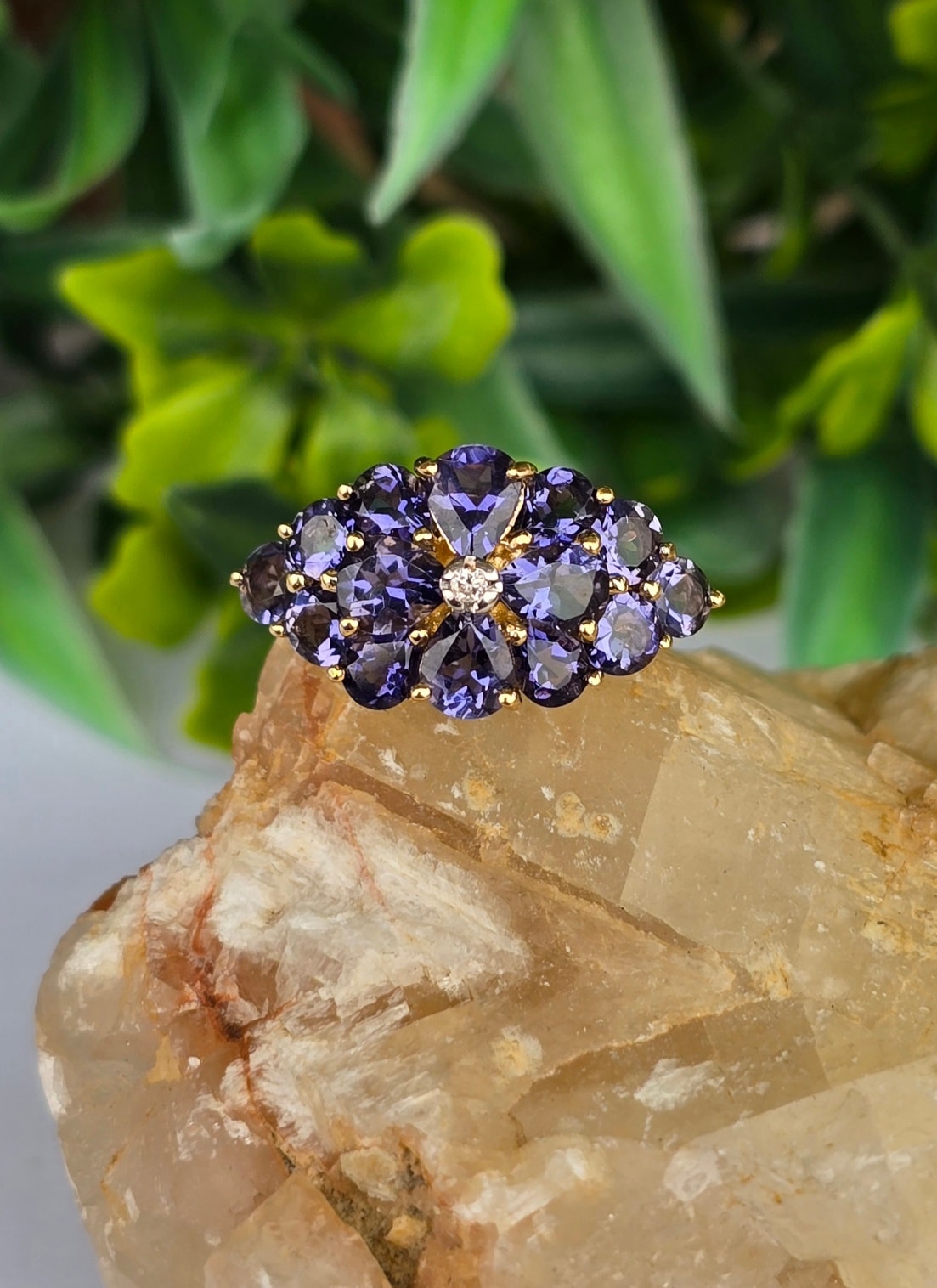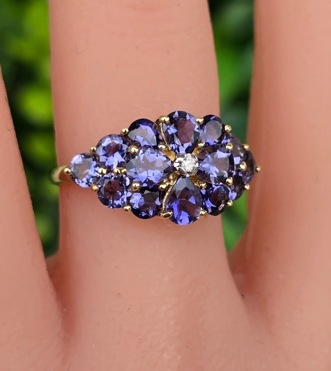 Inel vechi din aur de 9K, cu diamant și 14 iolite (safire de apă) naturale.