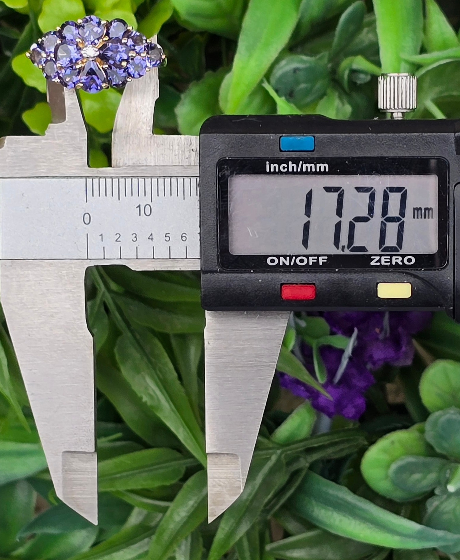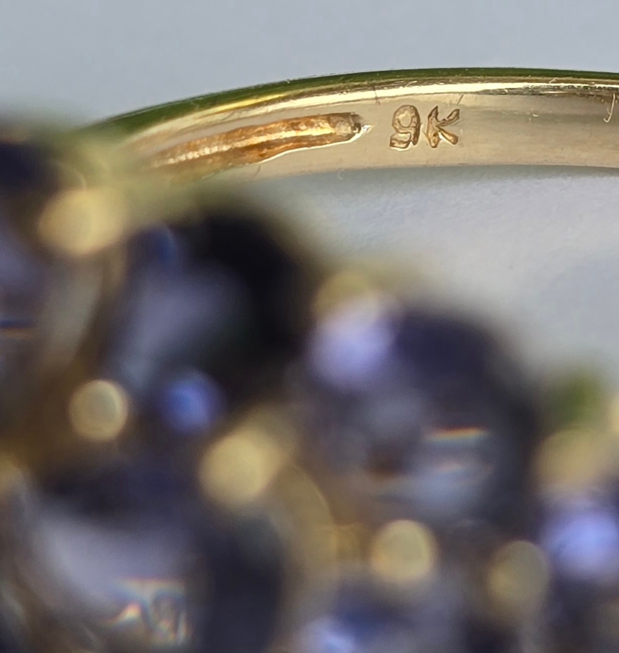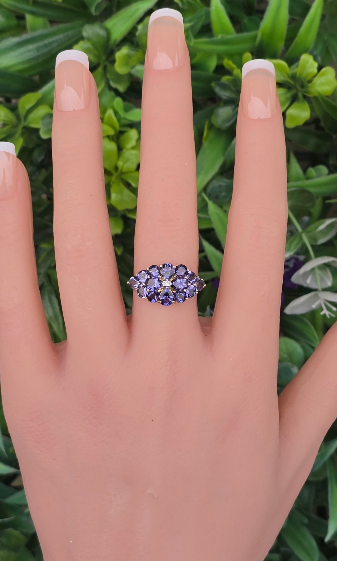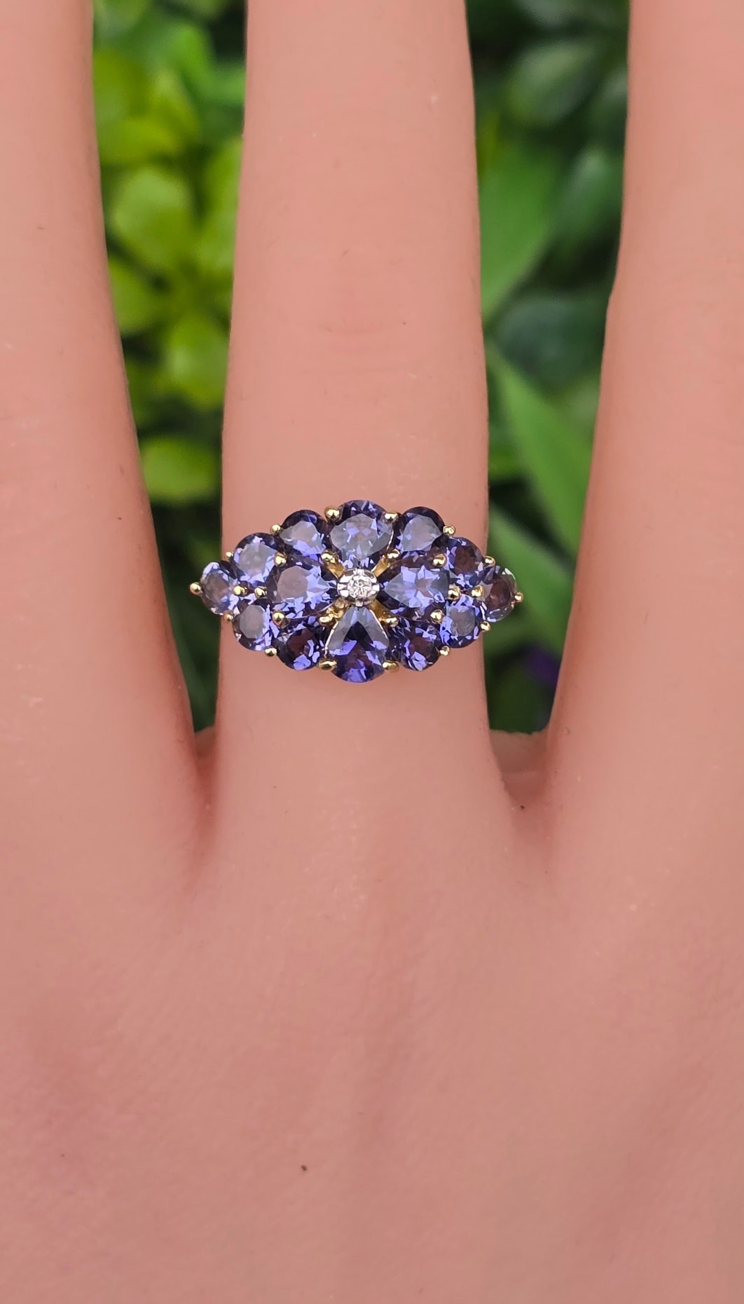 Inel vechi din aur de 9K, cu diamant și 14 iolite (safire de apă) naturale.