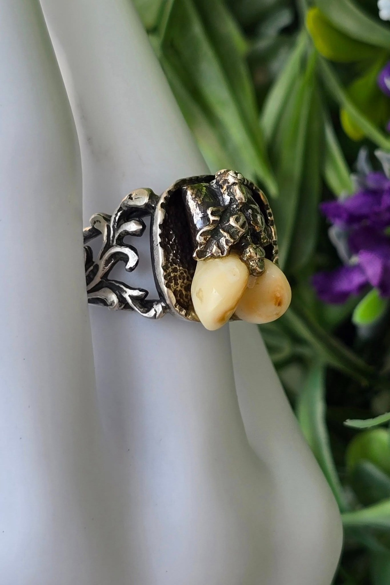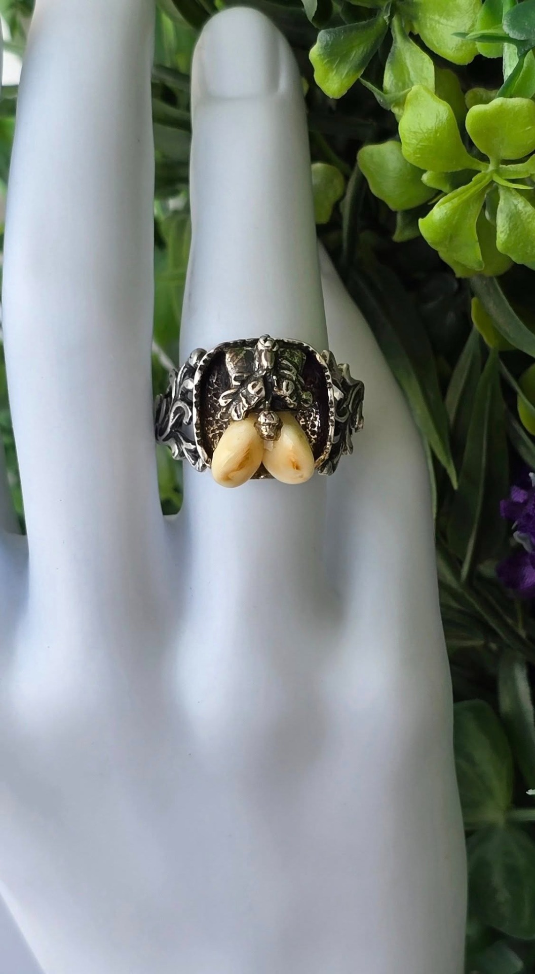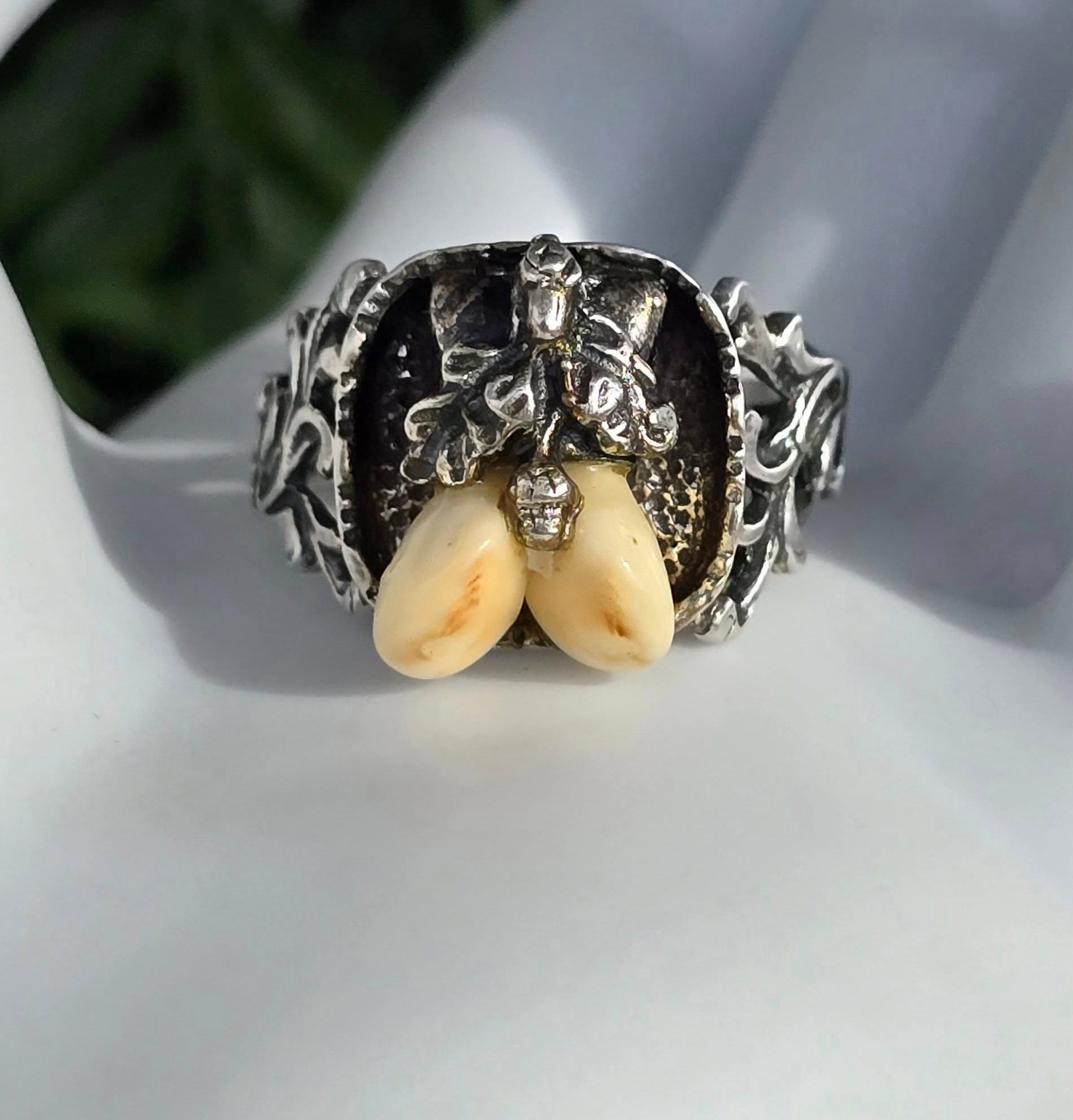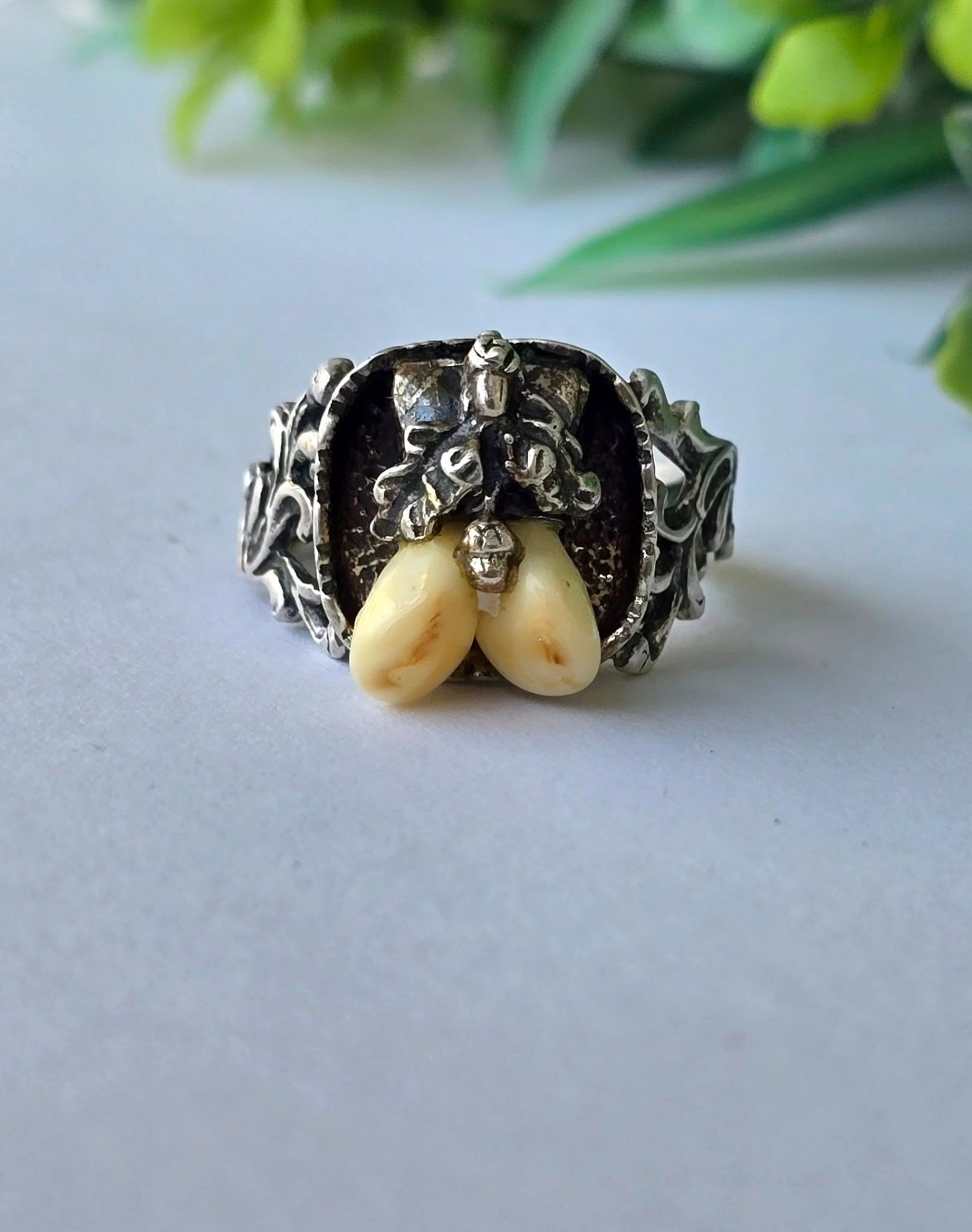 Inel vechi Grandel, tradițional bavarez, din argint, cu dinți de căprioară, frumos lucrat manual, stilizat cu frunze de stejar și ghinde (anii 1950-1960,