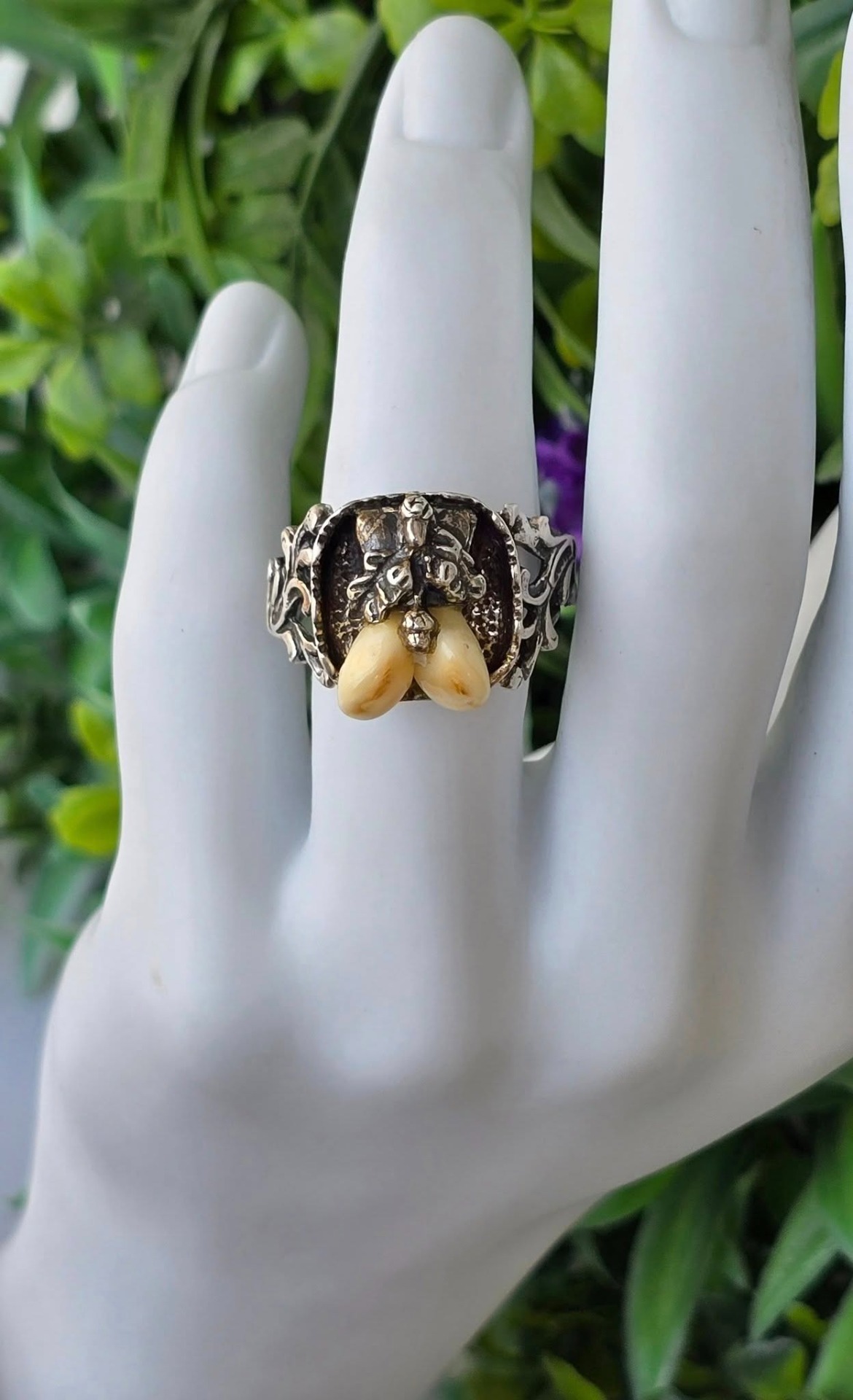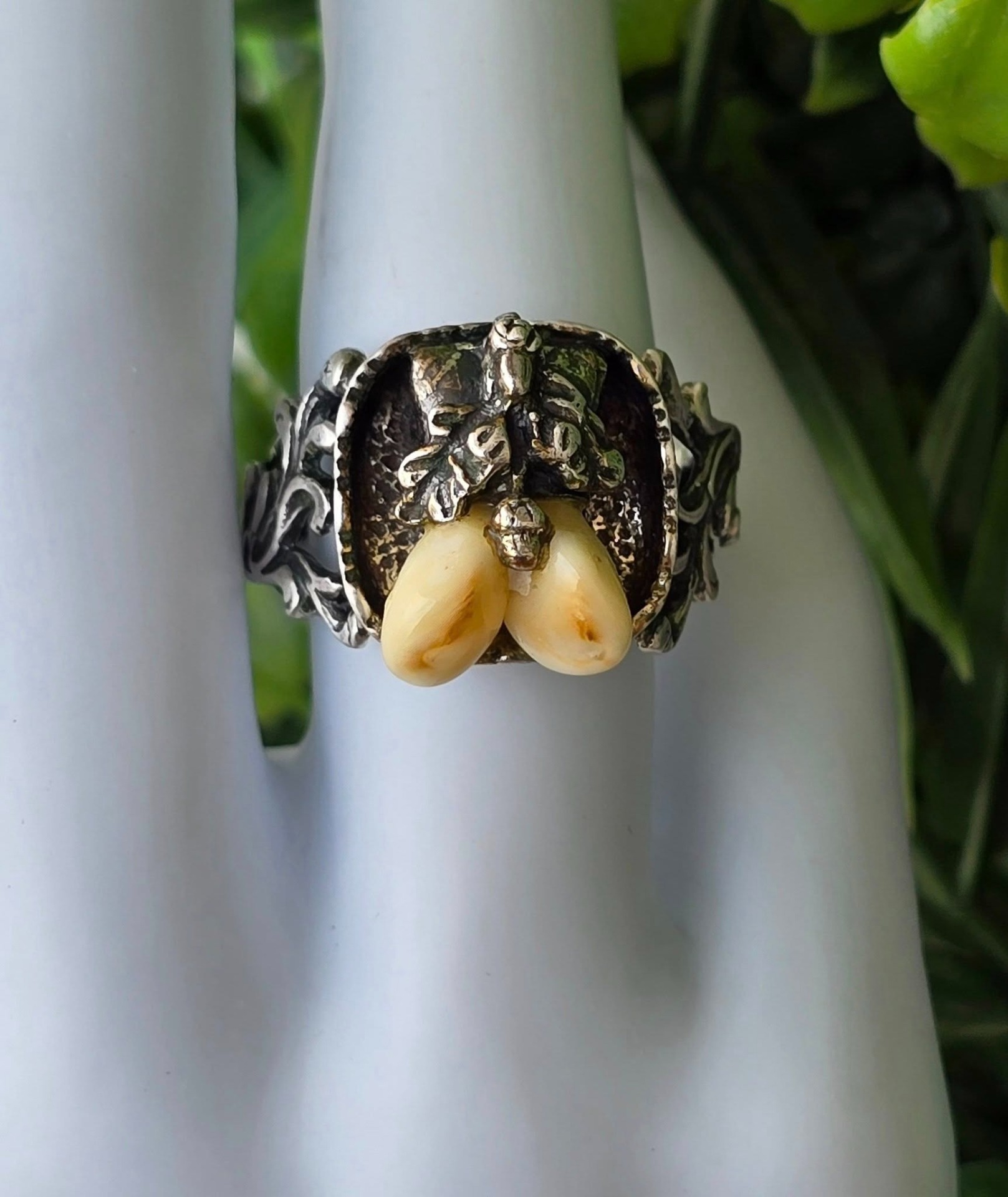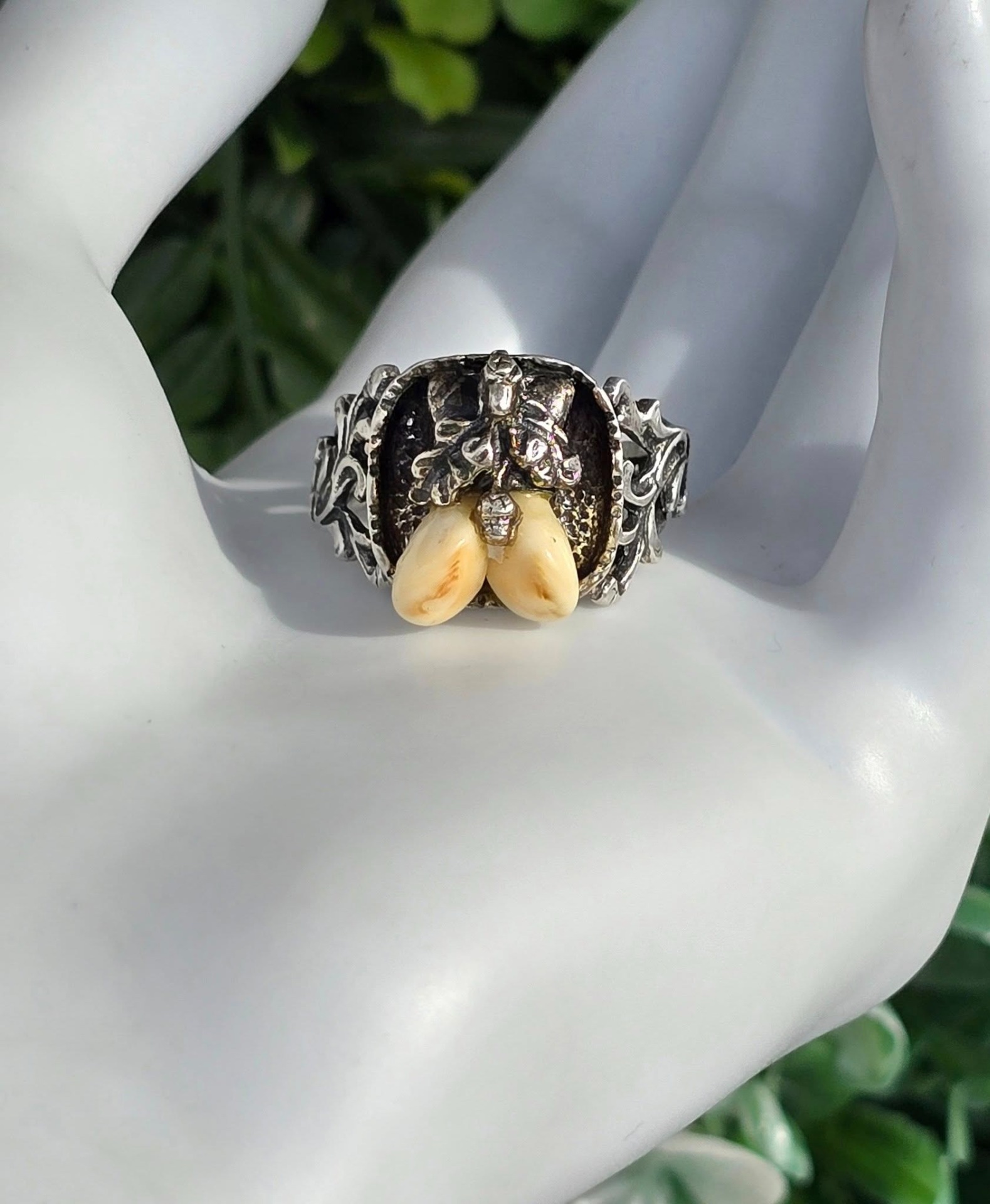 Inel vechi Grandel, tradițional bavarez, din argint, cu dinți de căprioară, frumos lucrat manual, stilizat cu frunze de stejar și ghinde (anii 1950-1960,