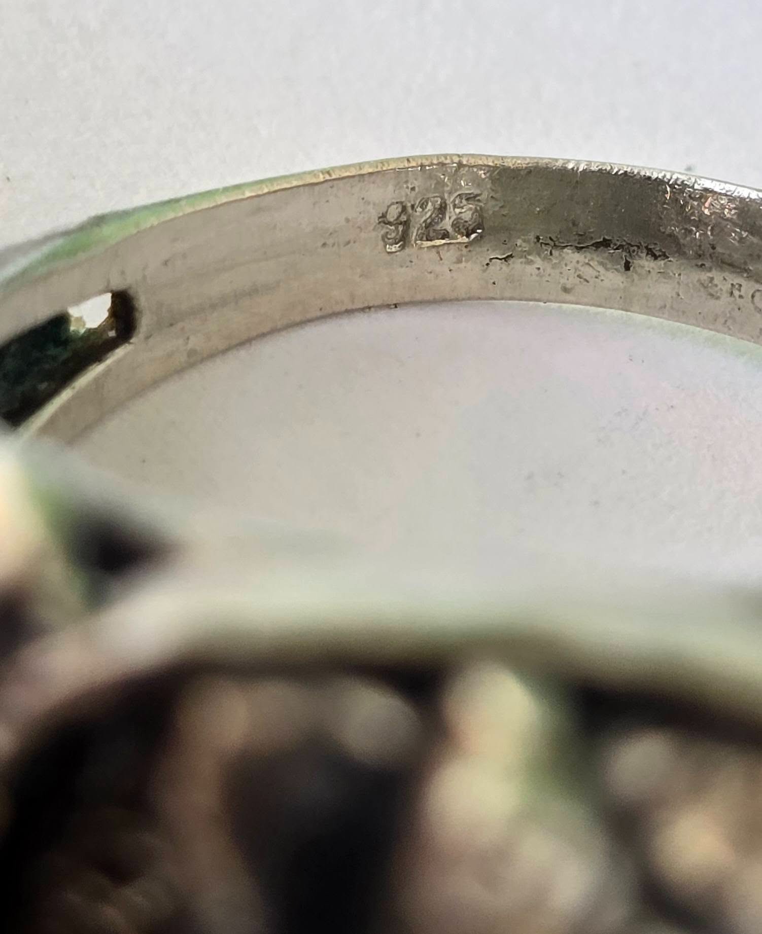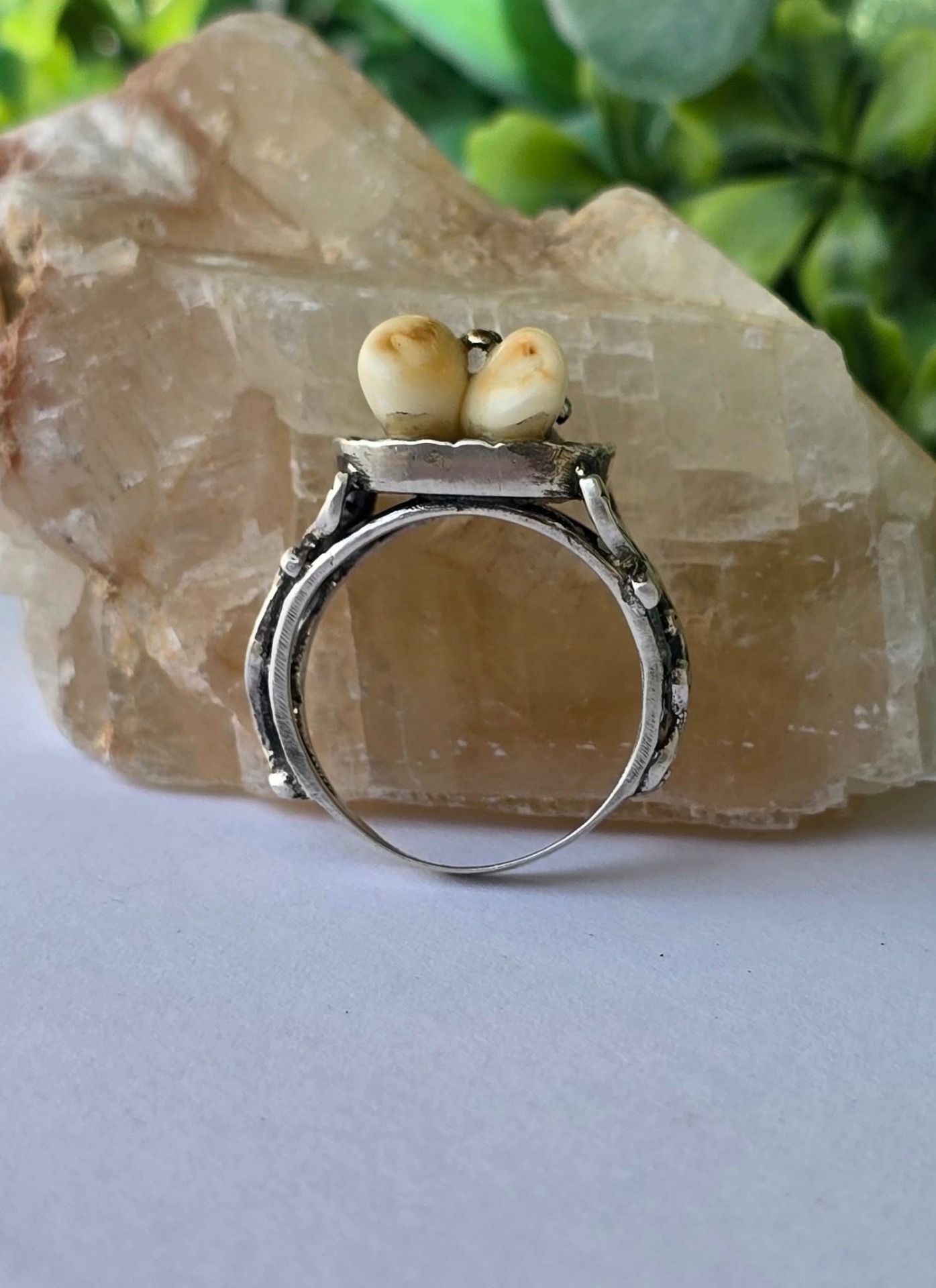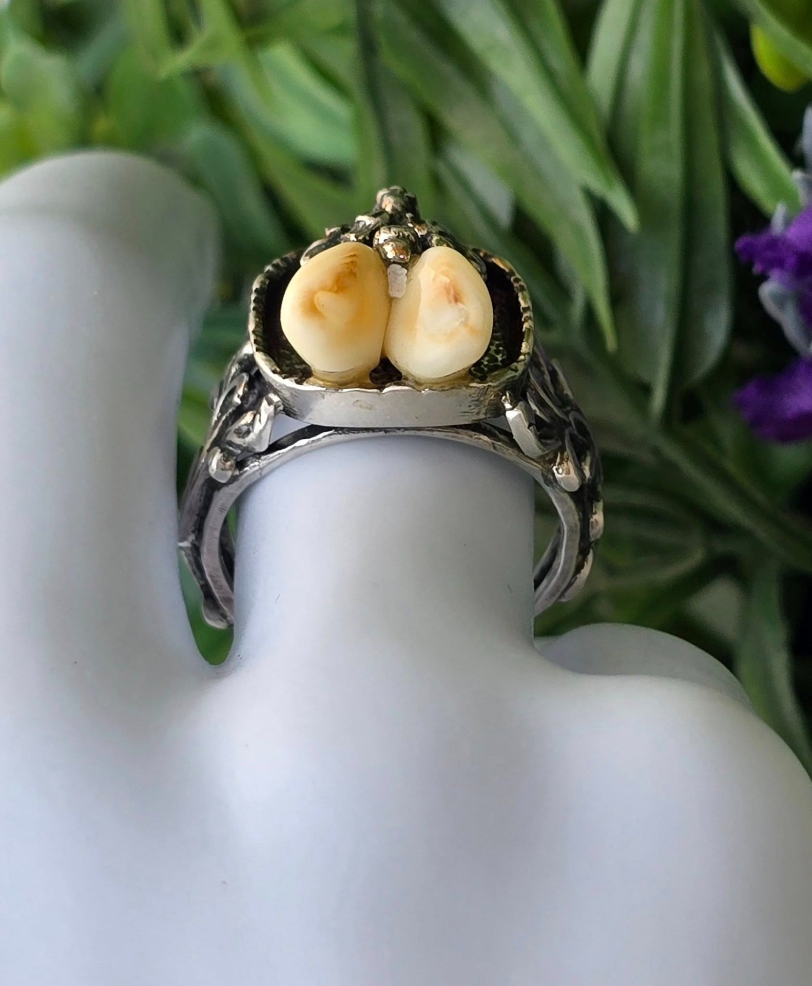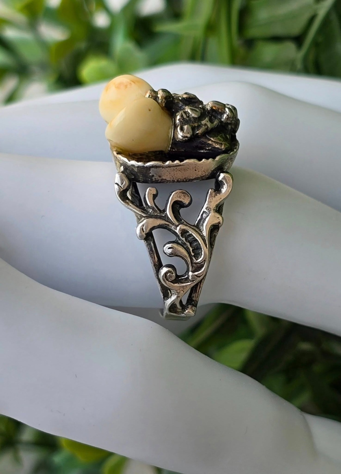 Inel vechi Grandel, tradițional bavarez, din argint, cu dinți de căprioară, frumos lucrat manual, stilizat cu frunze de stejar și ghinde (anii 1950-1960,