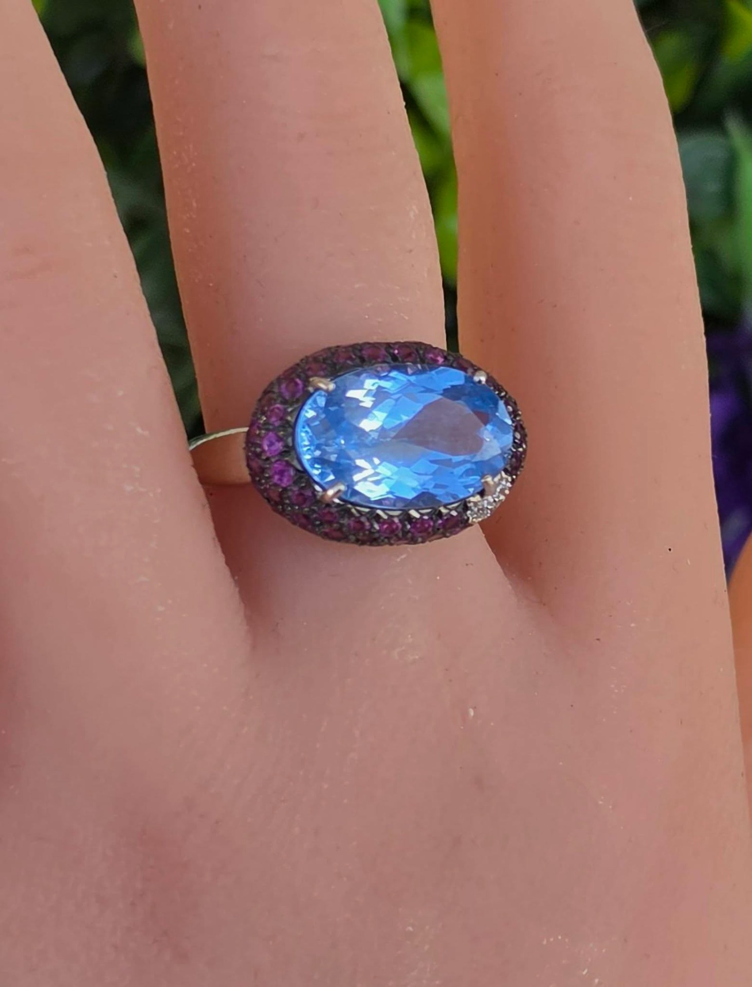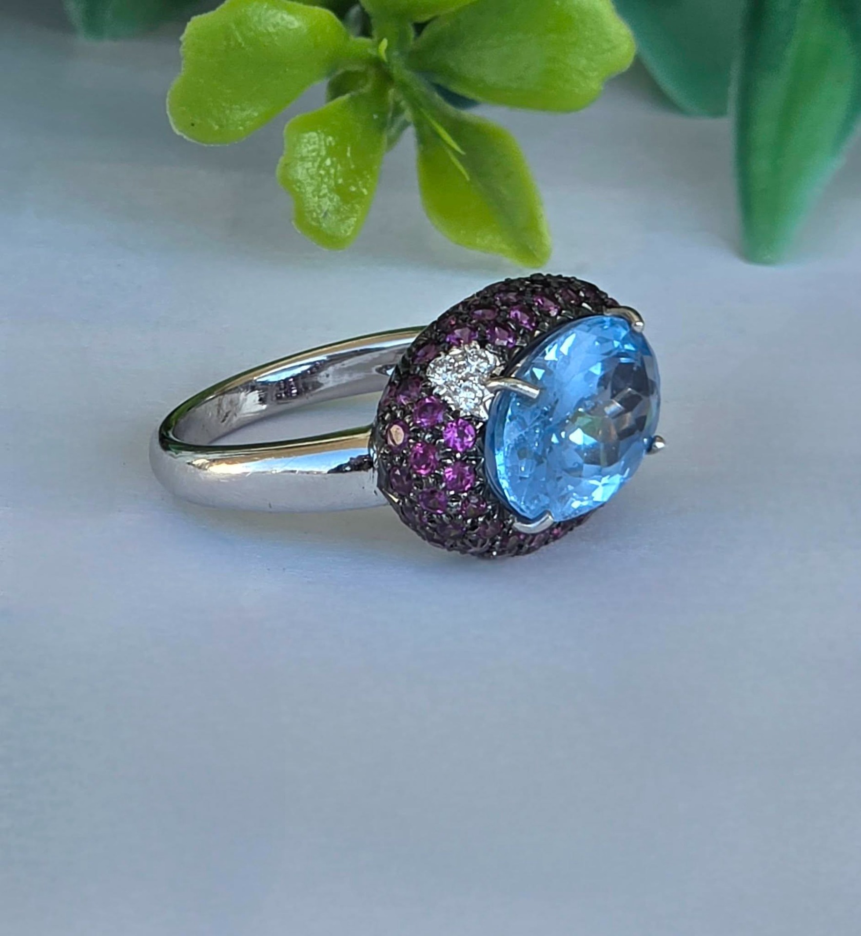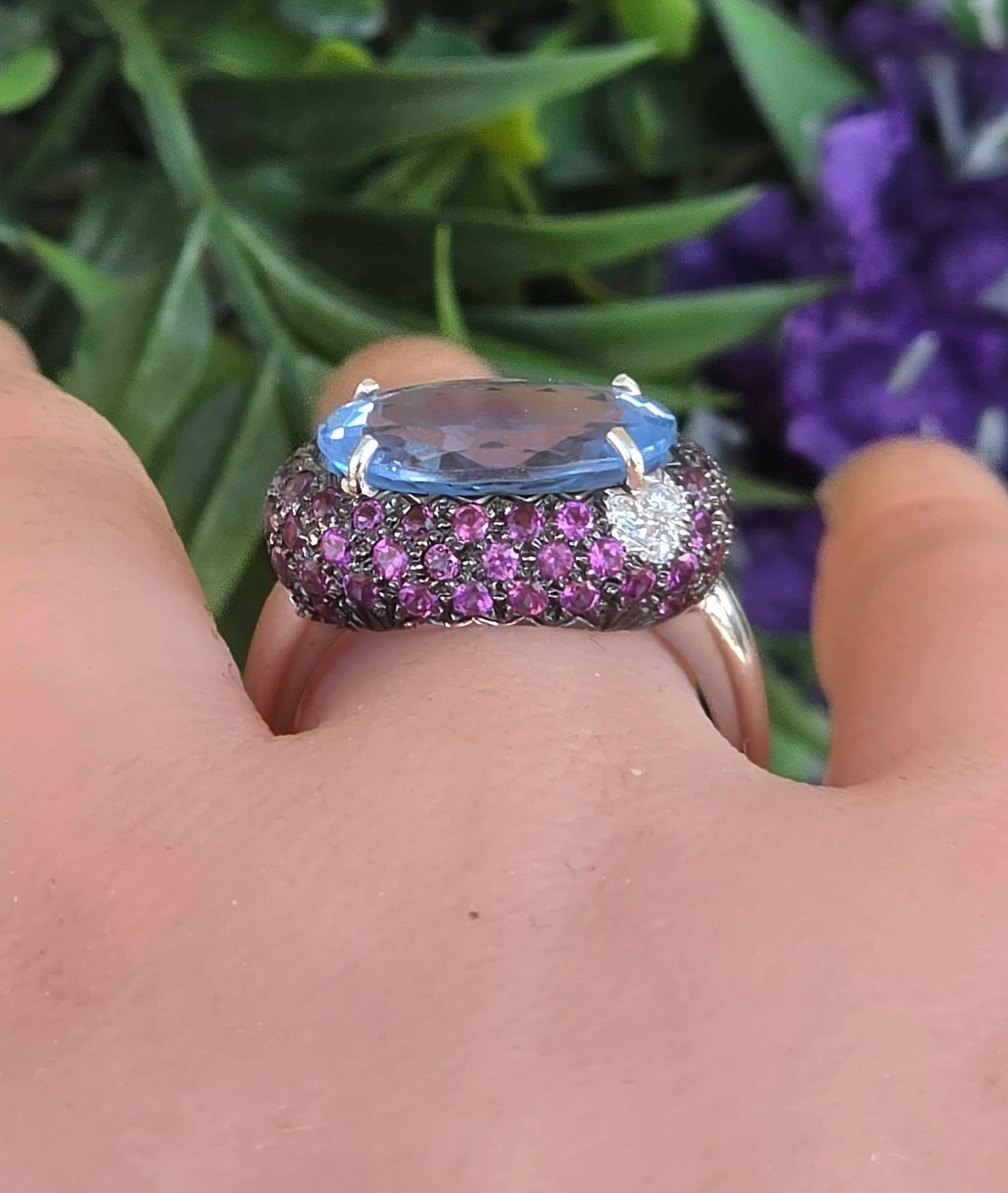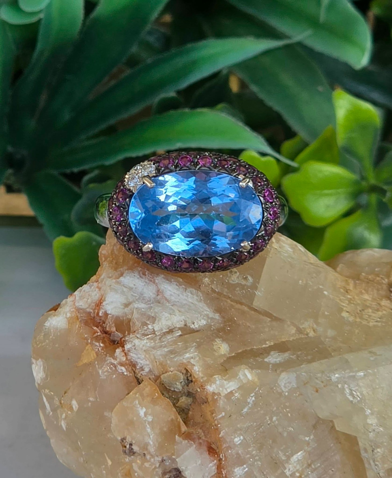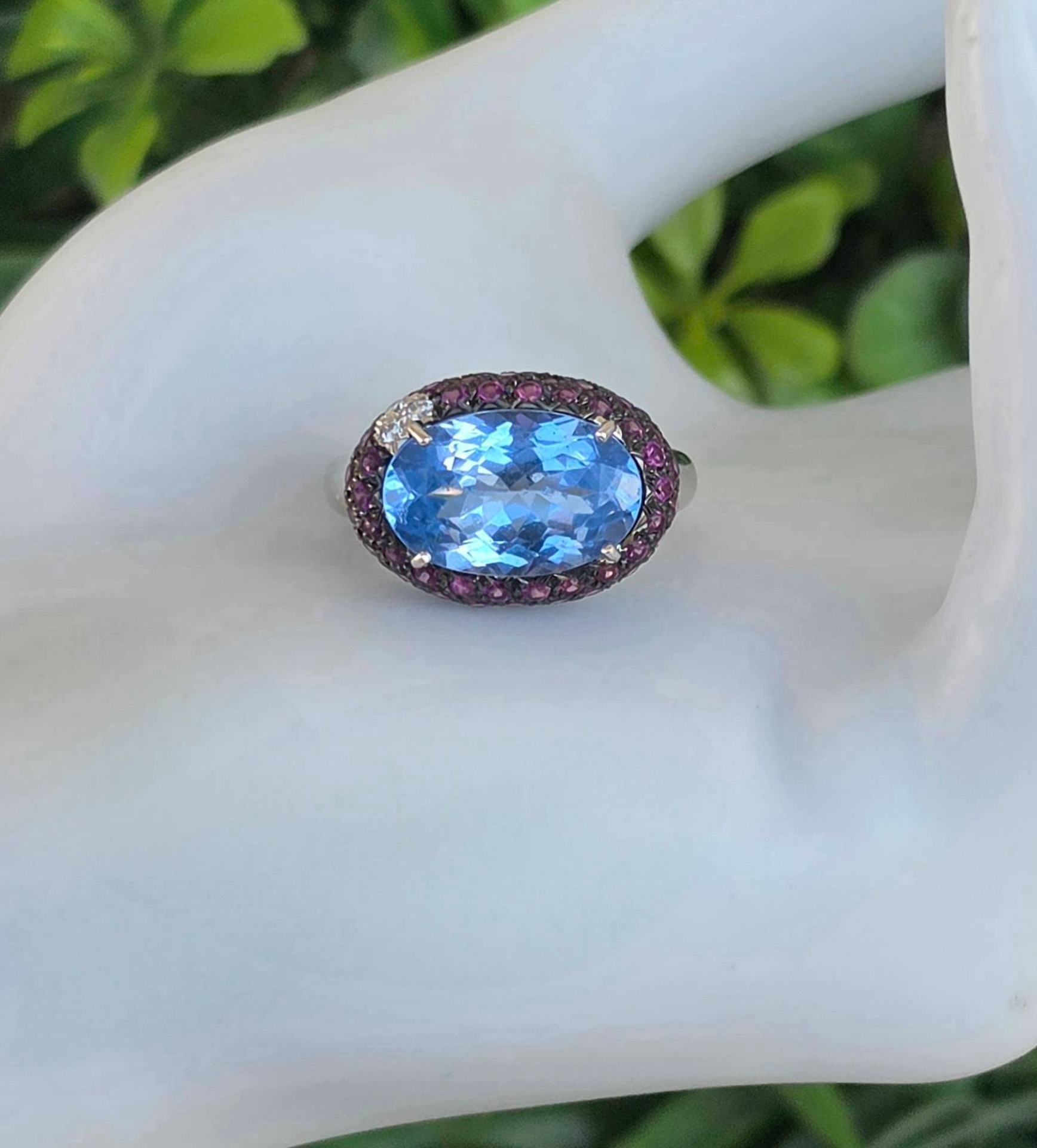 Inel vechi impresionant, din aur alb de 18K, cu un spectaculos topaz natural, 3 diamante naturale de calitate excepțională și 67 granate rodolit naturale, manufactură Goslino Filippo Giovanni, meșter genovez (anii 1980-1990, Genova, Italia).