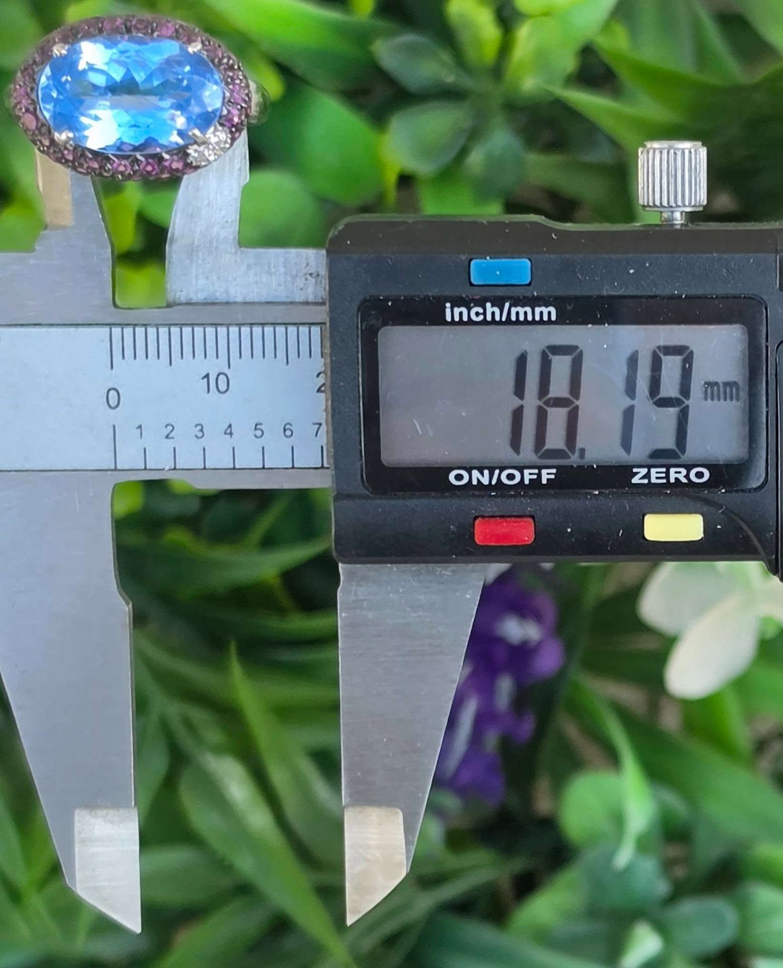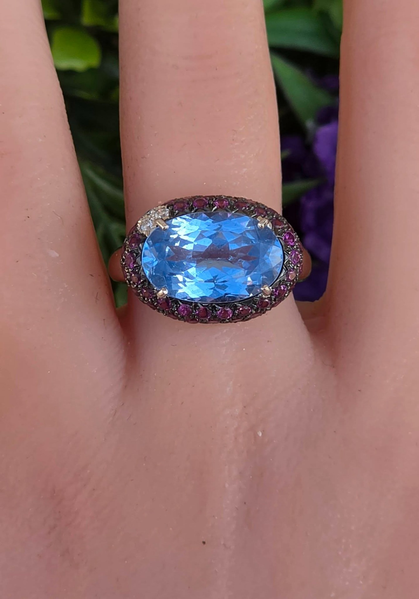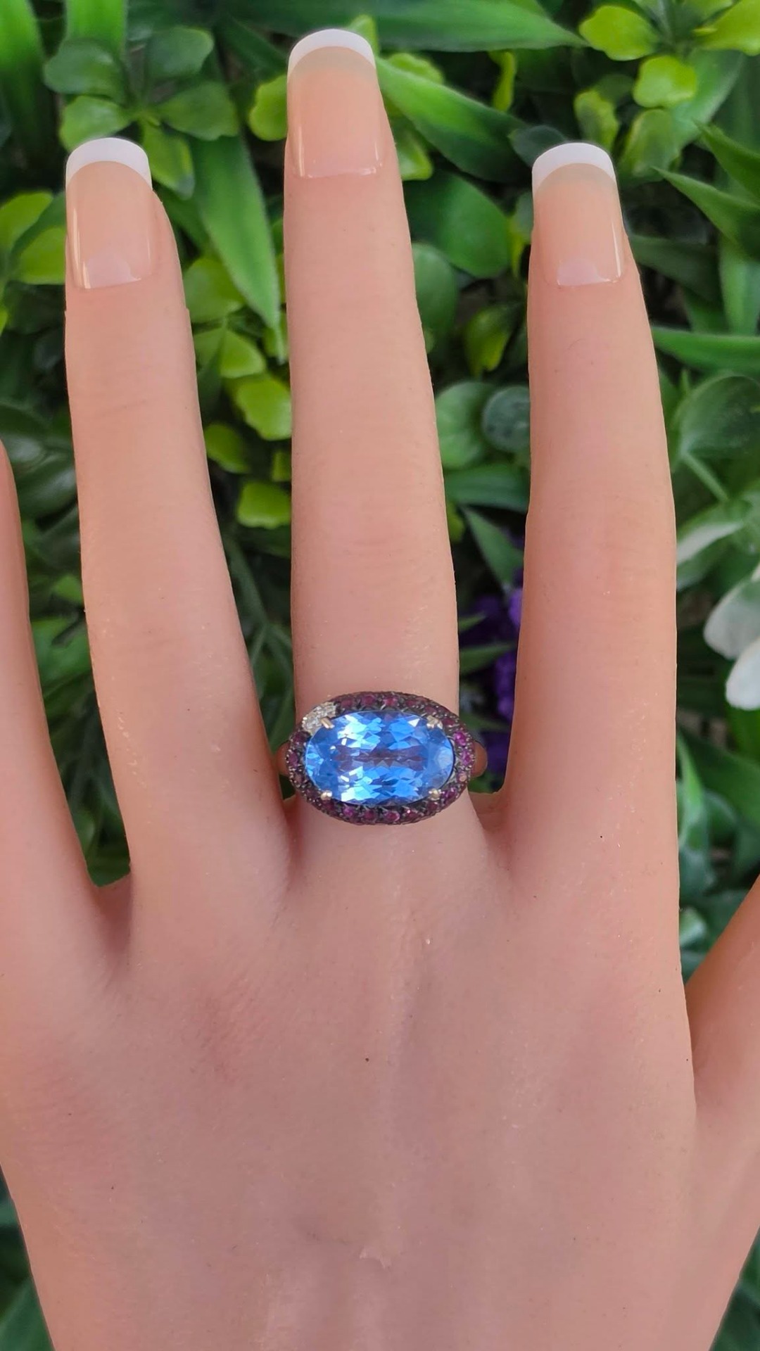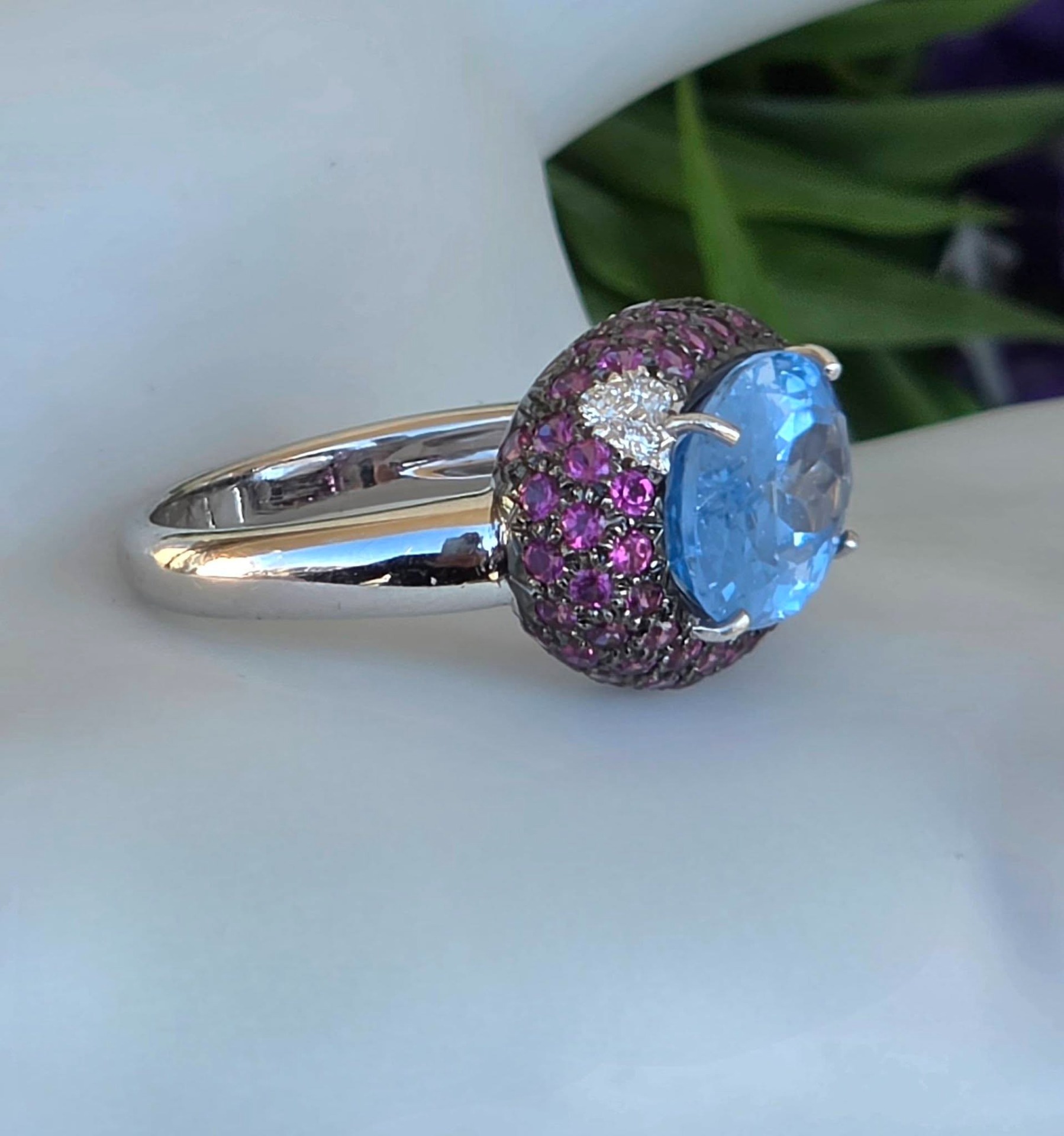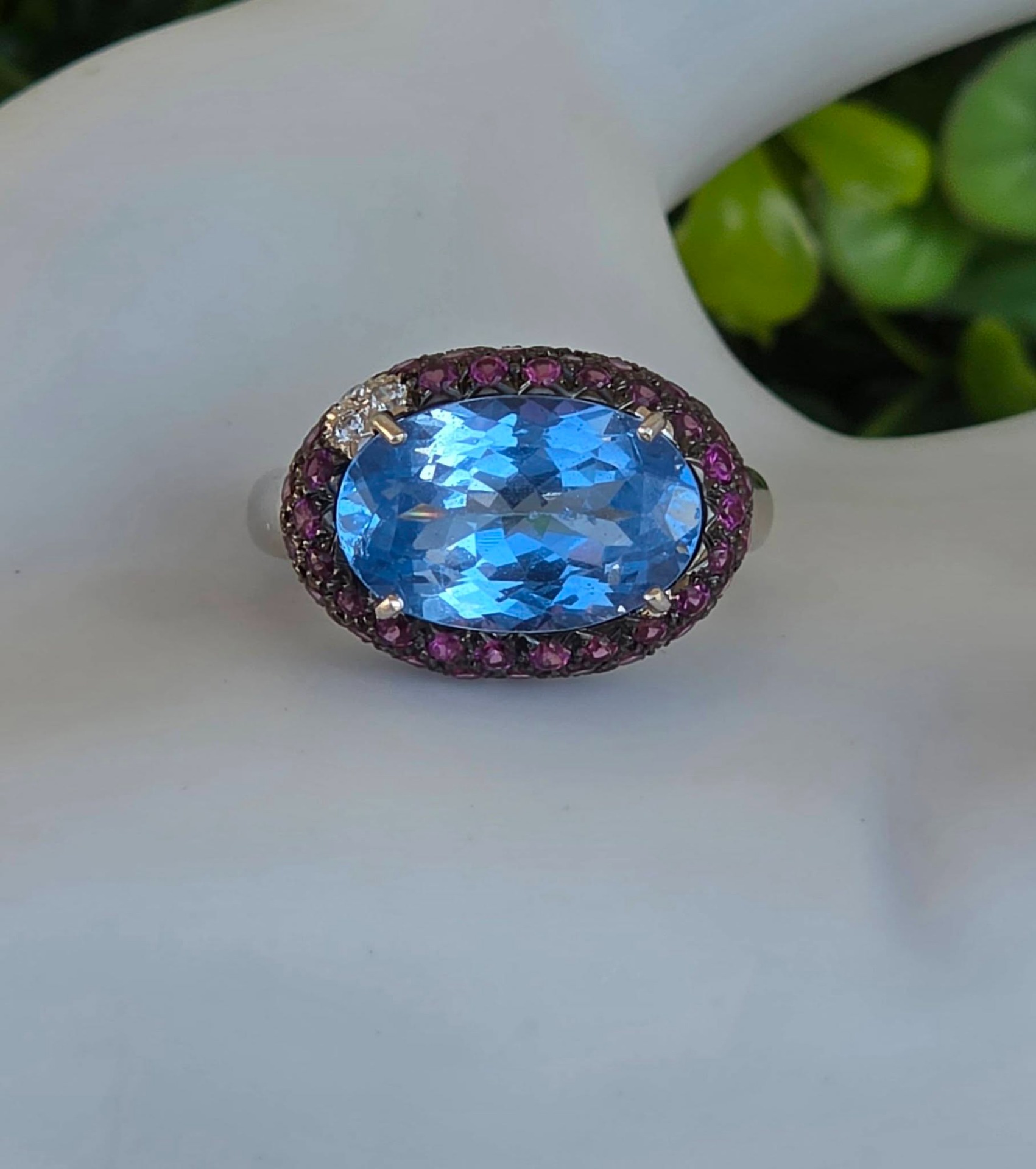 Inel vechi impresionant, din aur alb de 18K, cu un spectaculos topaz natural, 3 diamante naturale de calitate excepțională și 67 granate rodolit naturale, manufactură Goslino Filippo Giovanni, meșter genovez (anii 1980-1990, Genova, Italia).