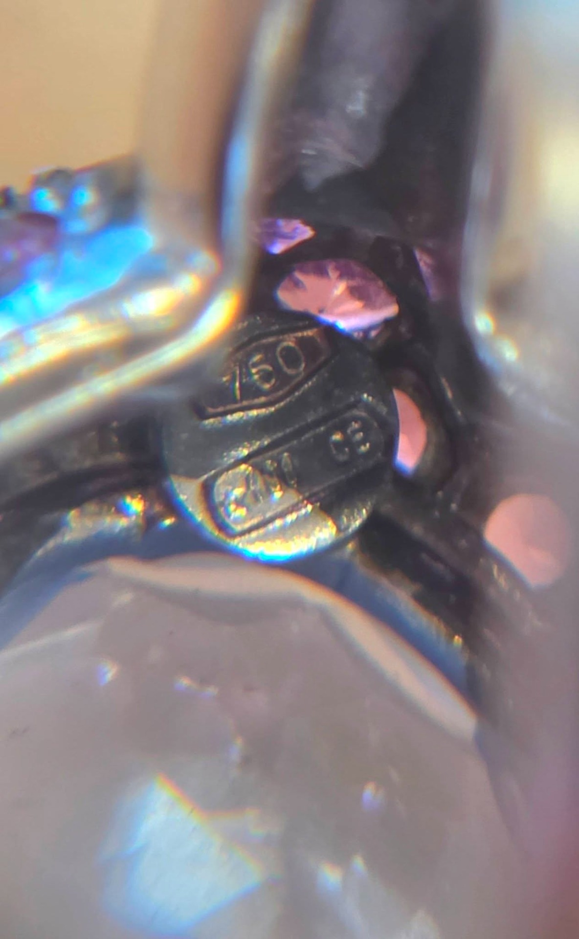 Prezintă marcaj 750 pentru puritate aur de 18K, poanson de atelier și de birou de certificare.