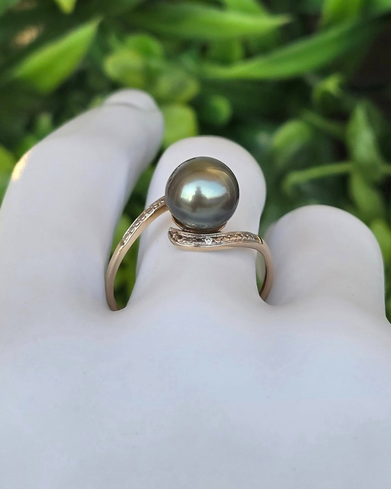 Inel vechi impresionant, din aur de 14K, cu perlă tahitiană naturală de cultură, anturată cu 2 diamante naturale.