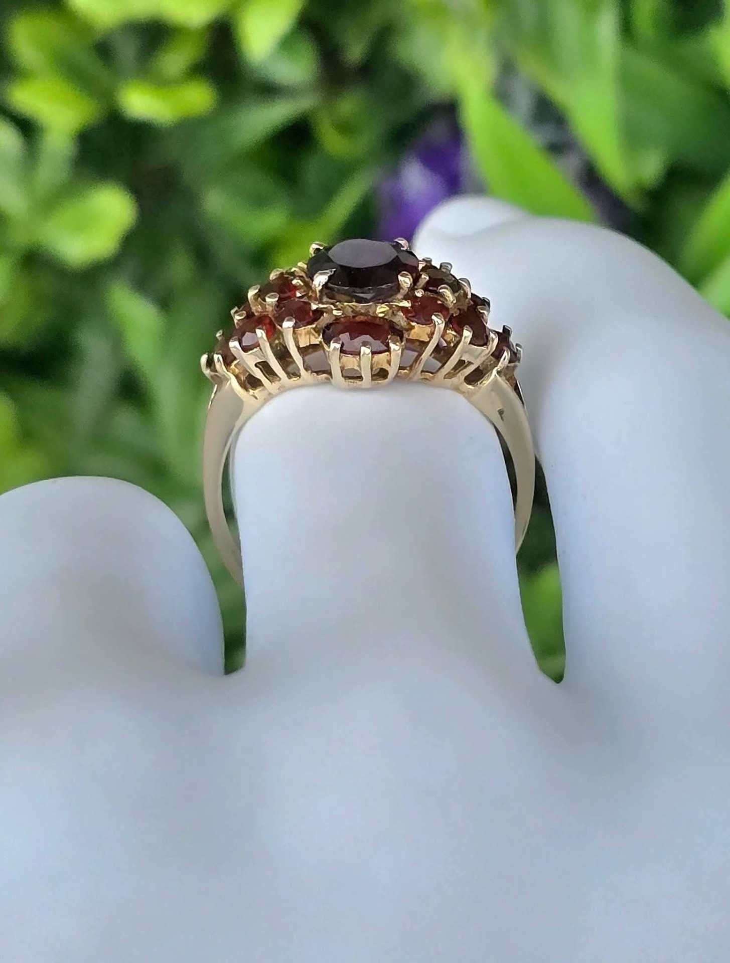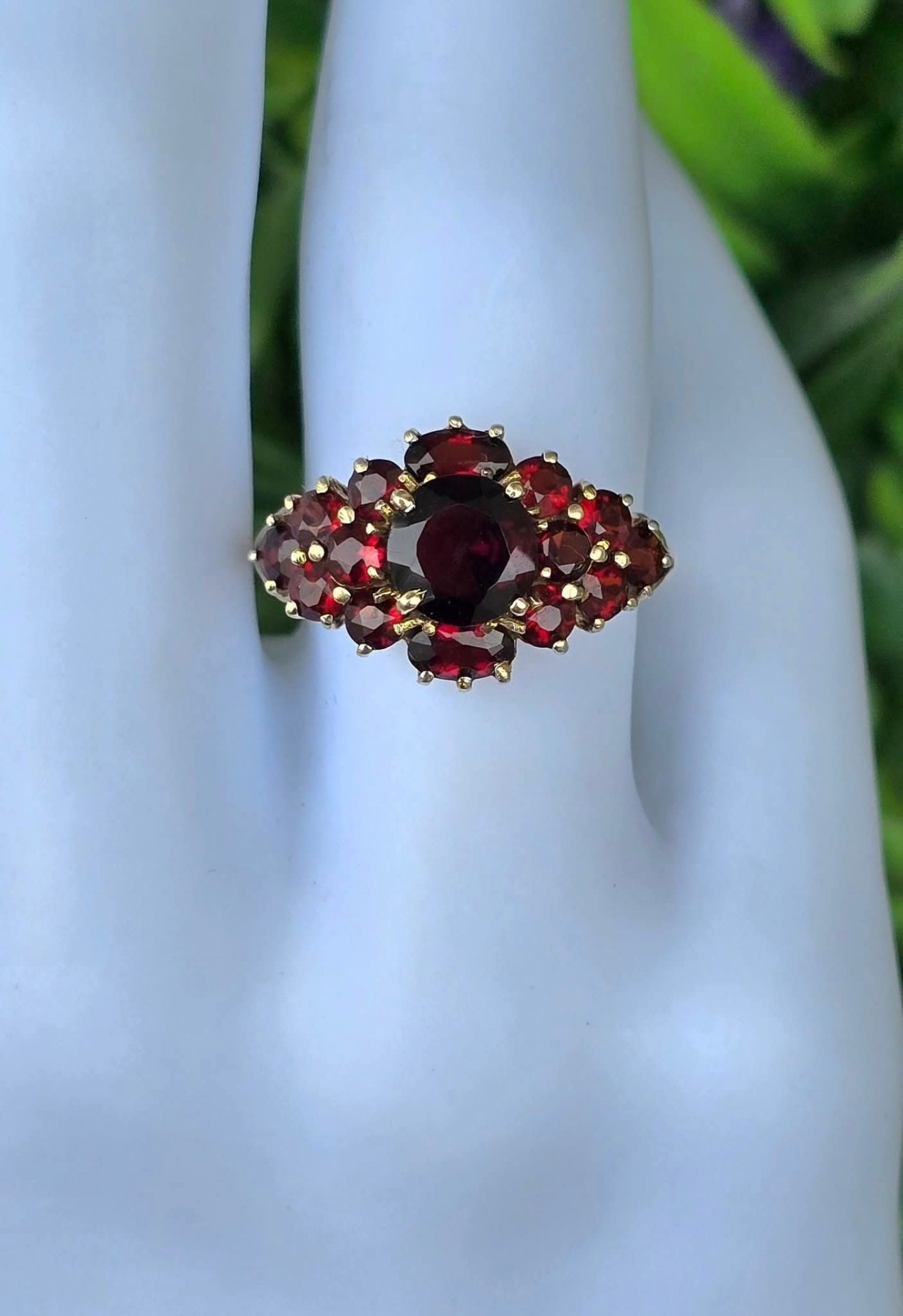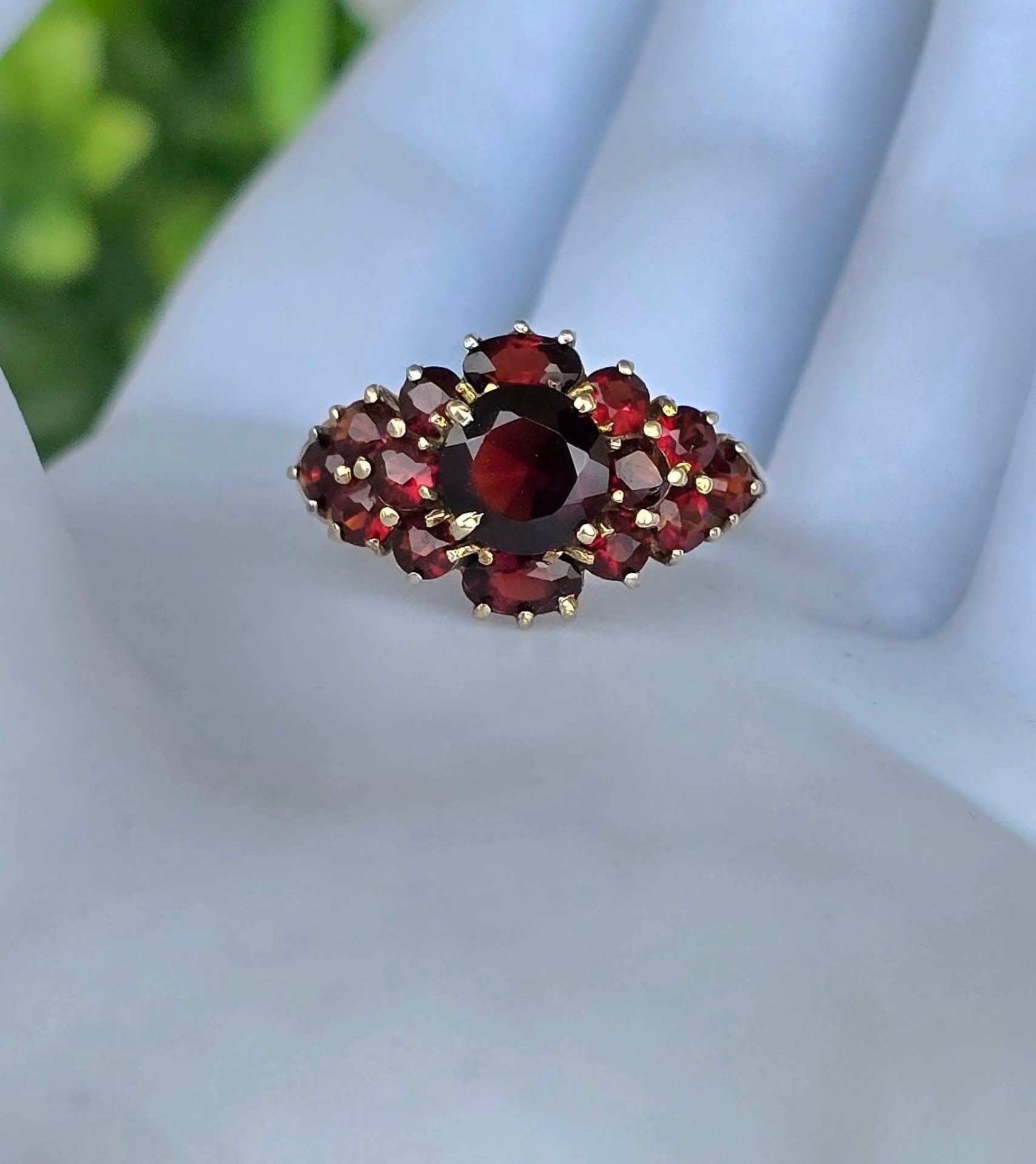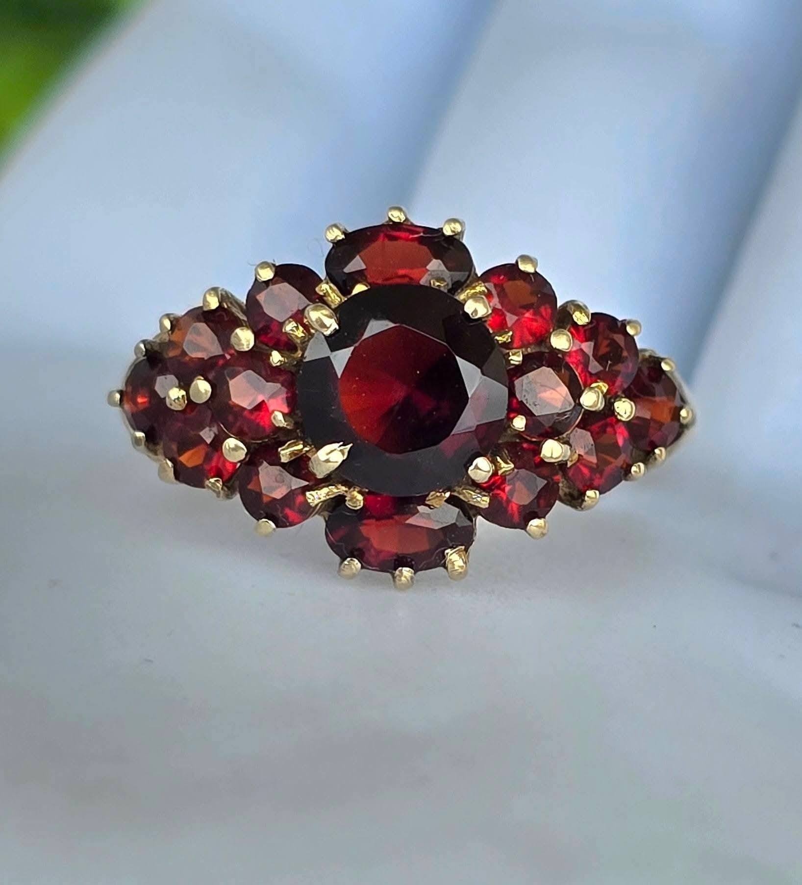 Inel vechi impresionant, din aur de 8K, cu 15 granate Bohemia naturale de calitate superioară, manufactură de excepție.