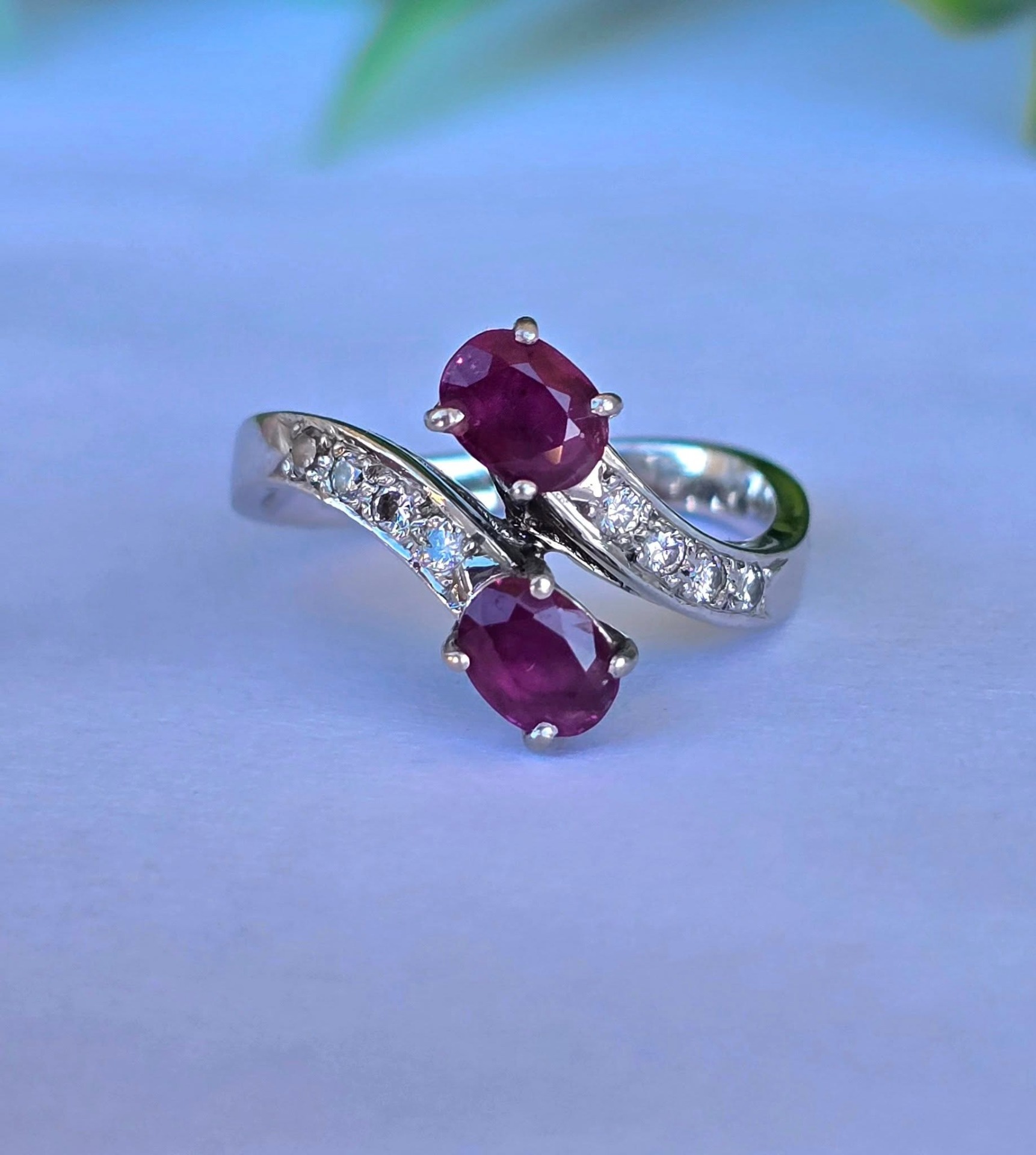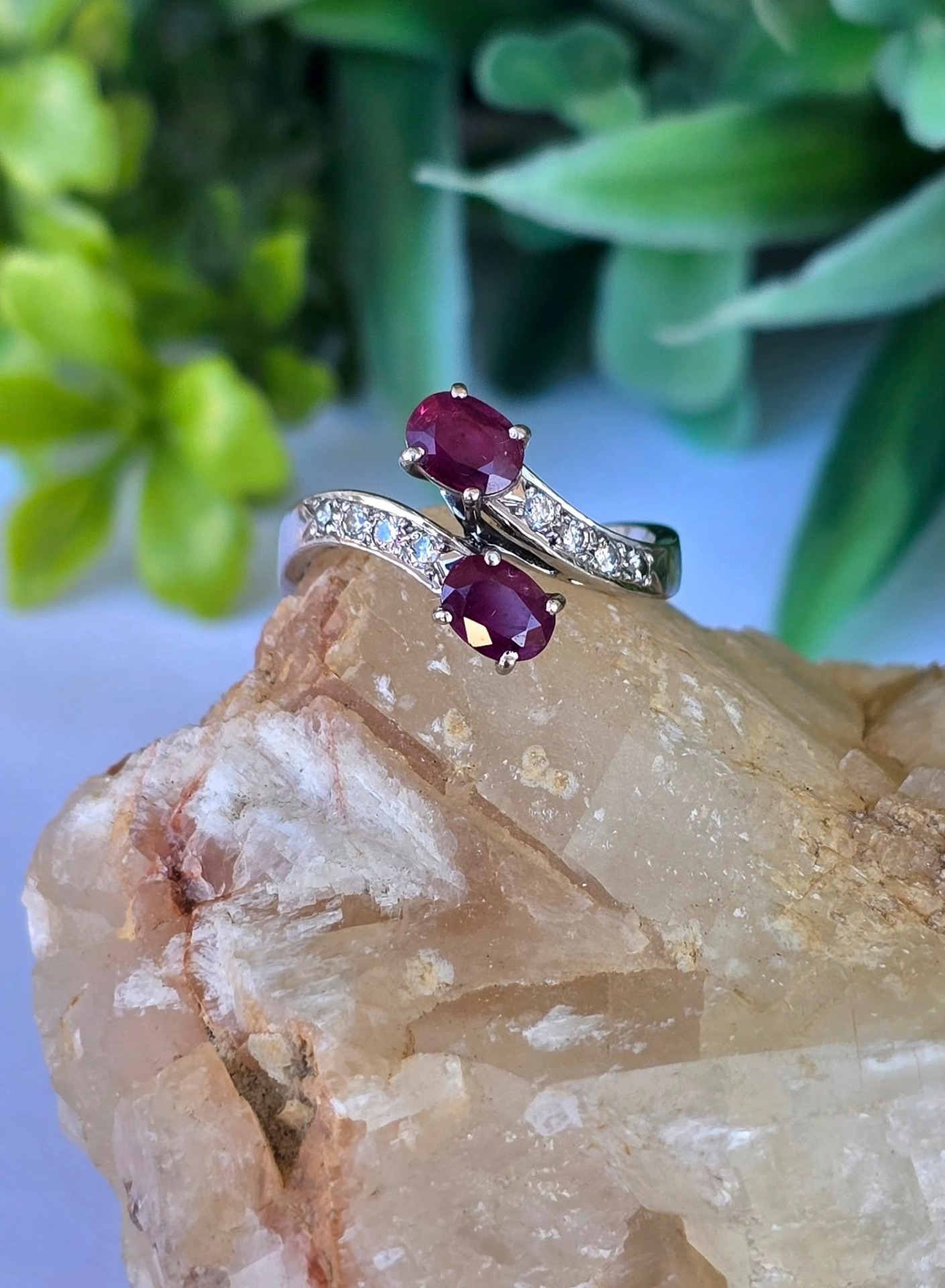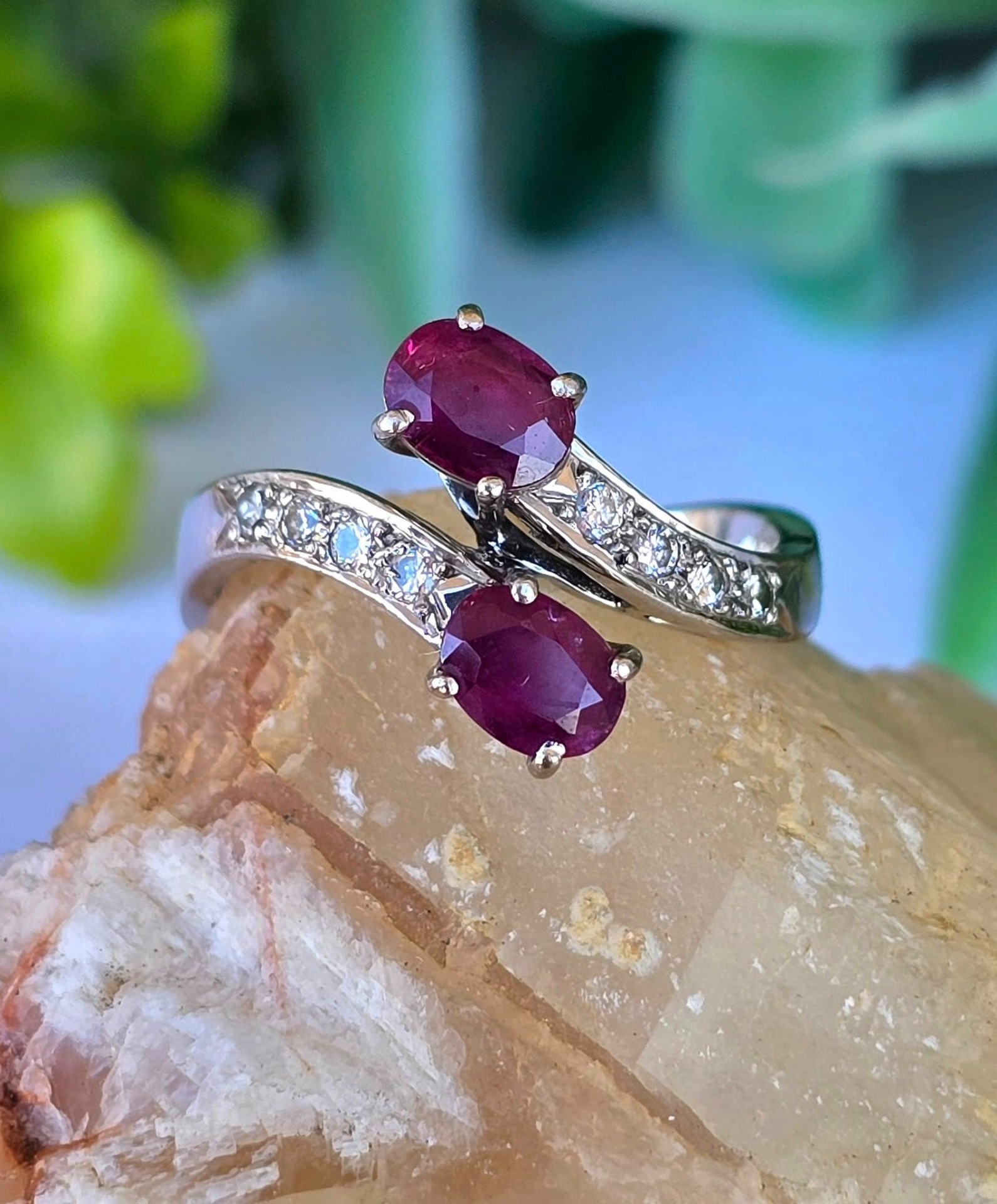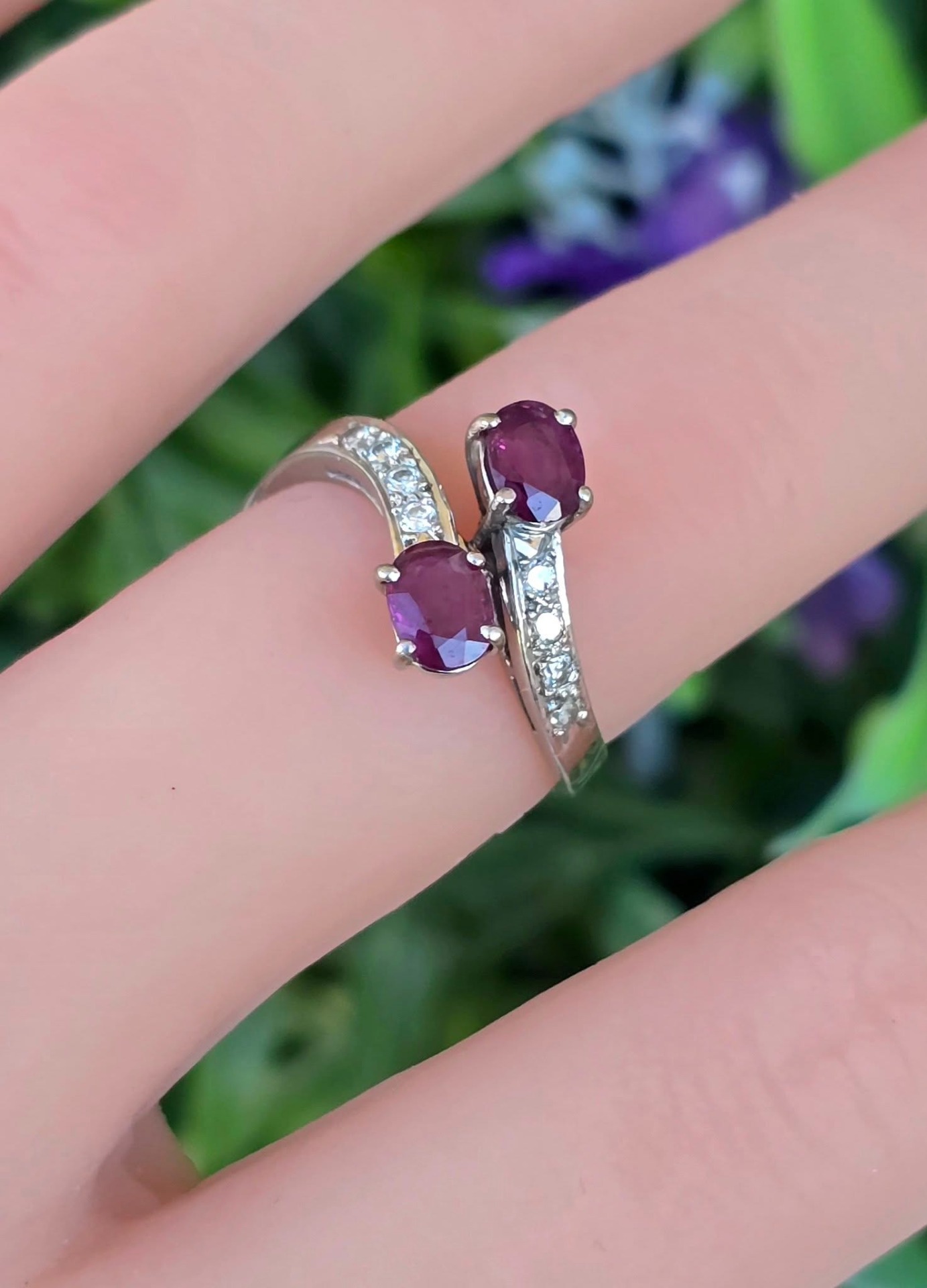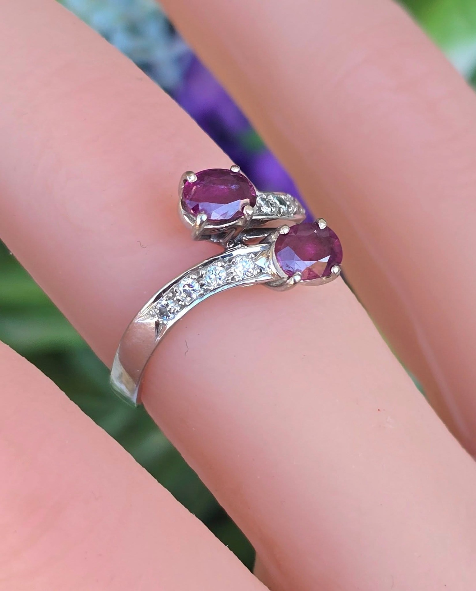 Inel vechi romantic, în stil "toi et moi", din aur de 18K, cu 2 rubine și 8 diamante naturale de calitate superioară.