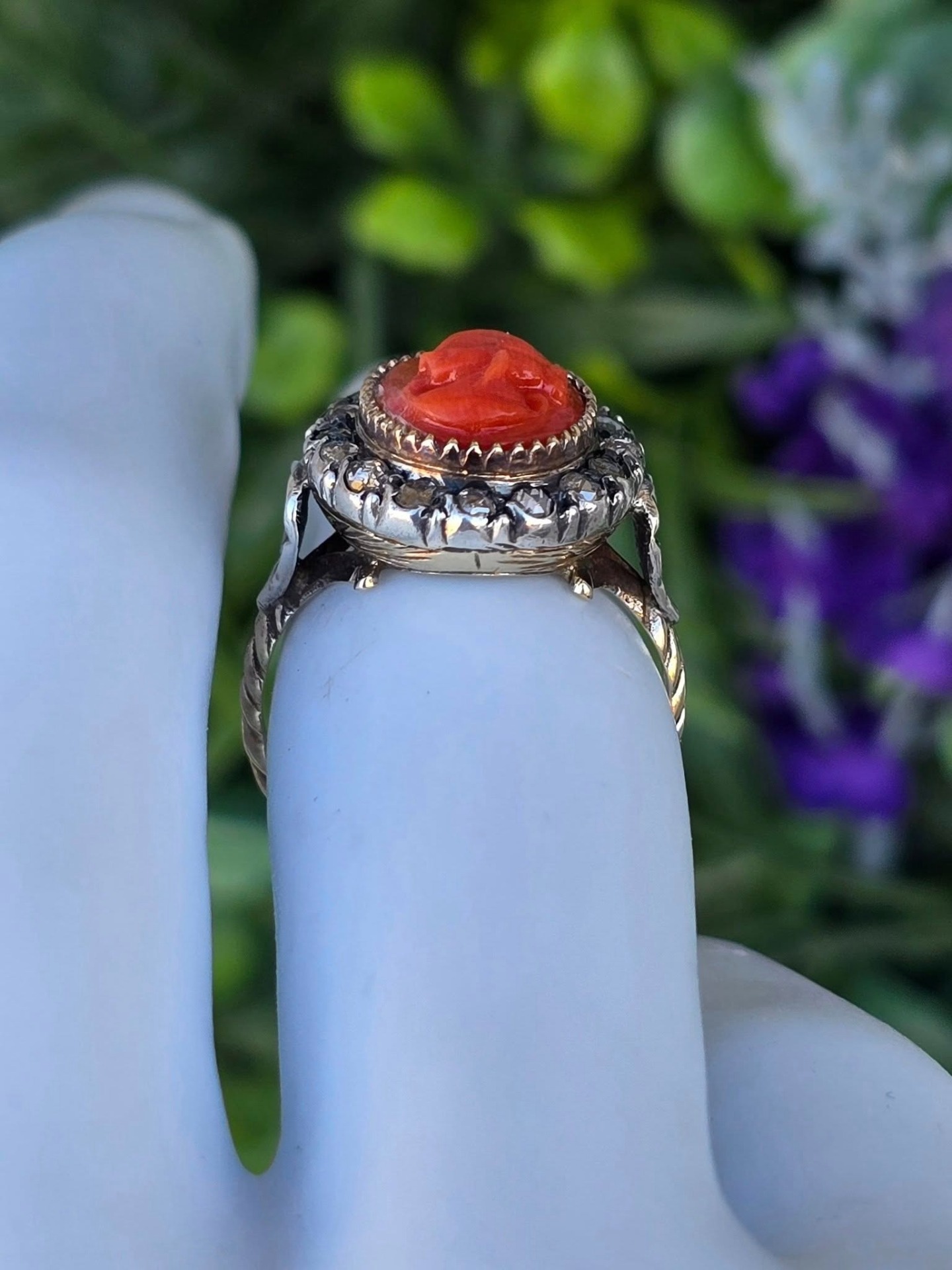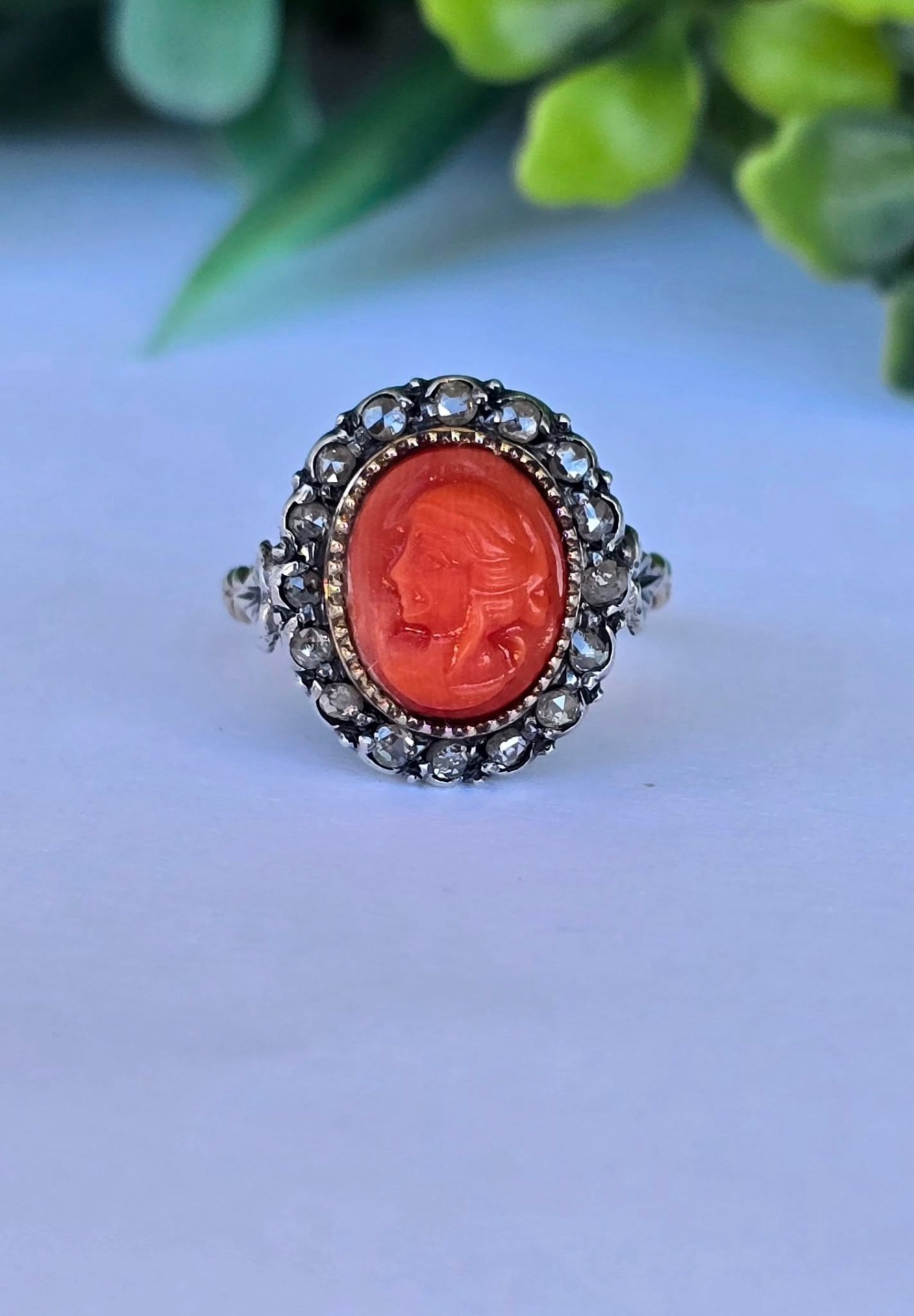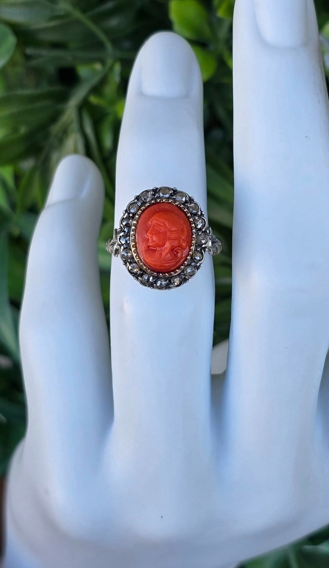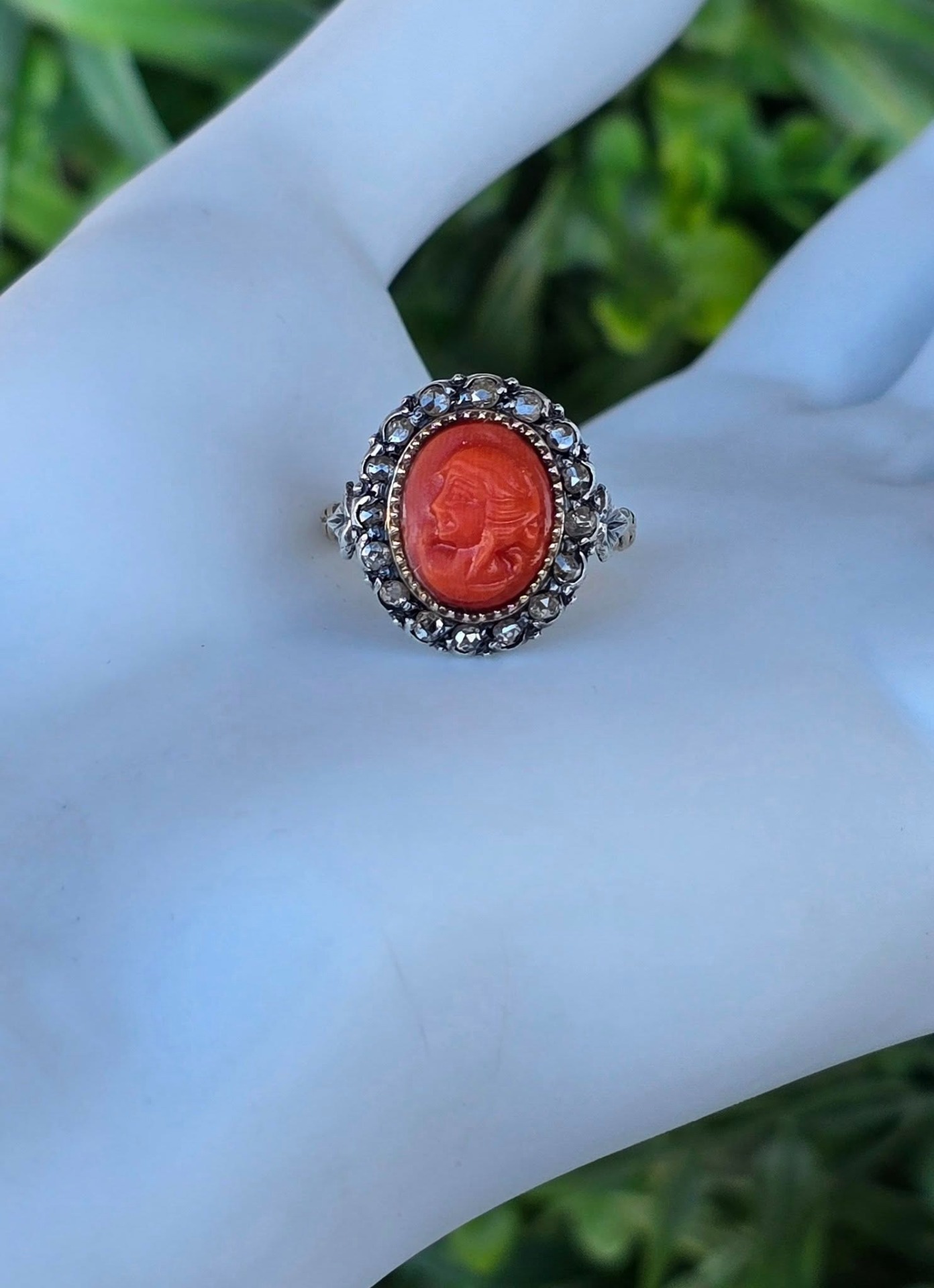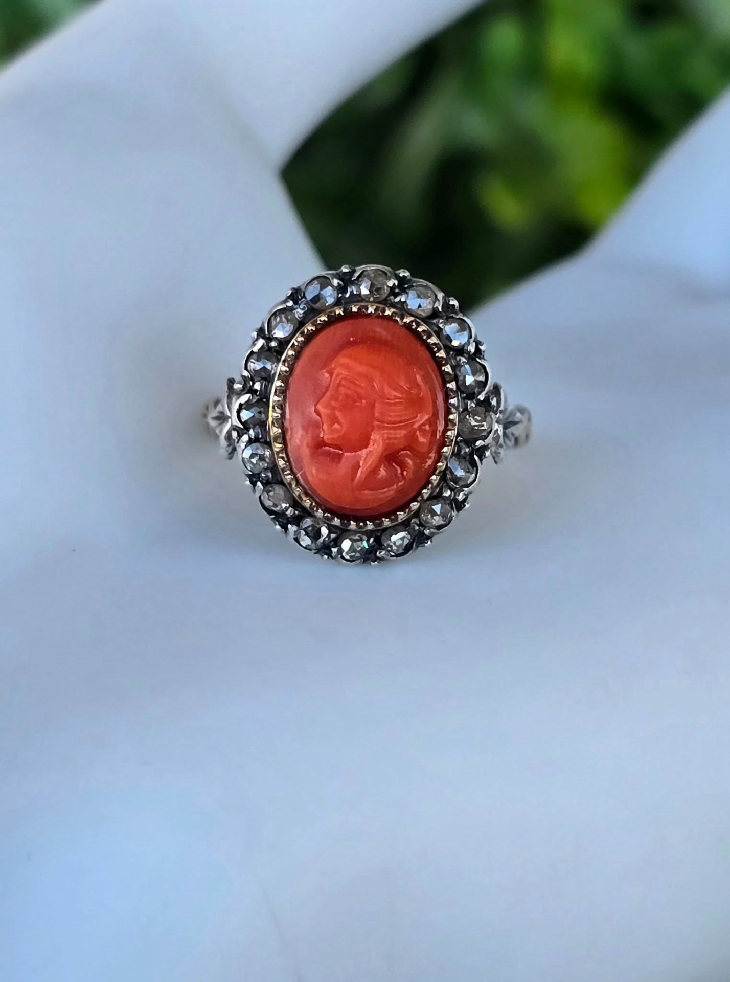 Inel vechi spectaculos, "Belle Epoque Revival", din aur de 14K, cu camee sculptată manual în coral mediteraneean natural și 16 diamante naturale "rose-cut"