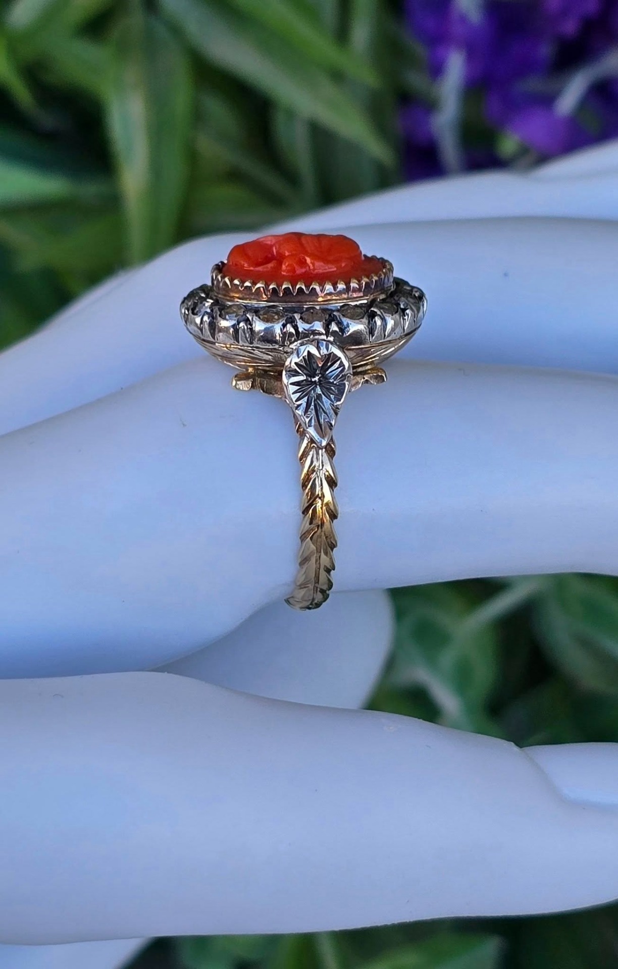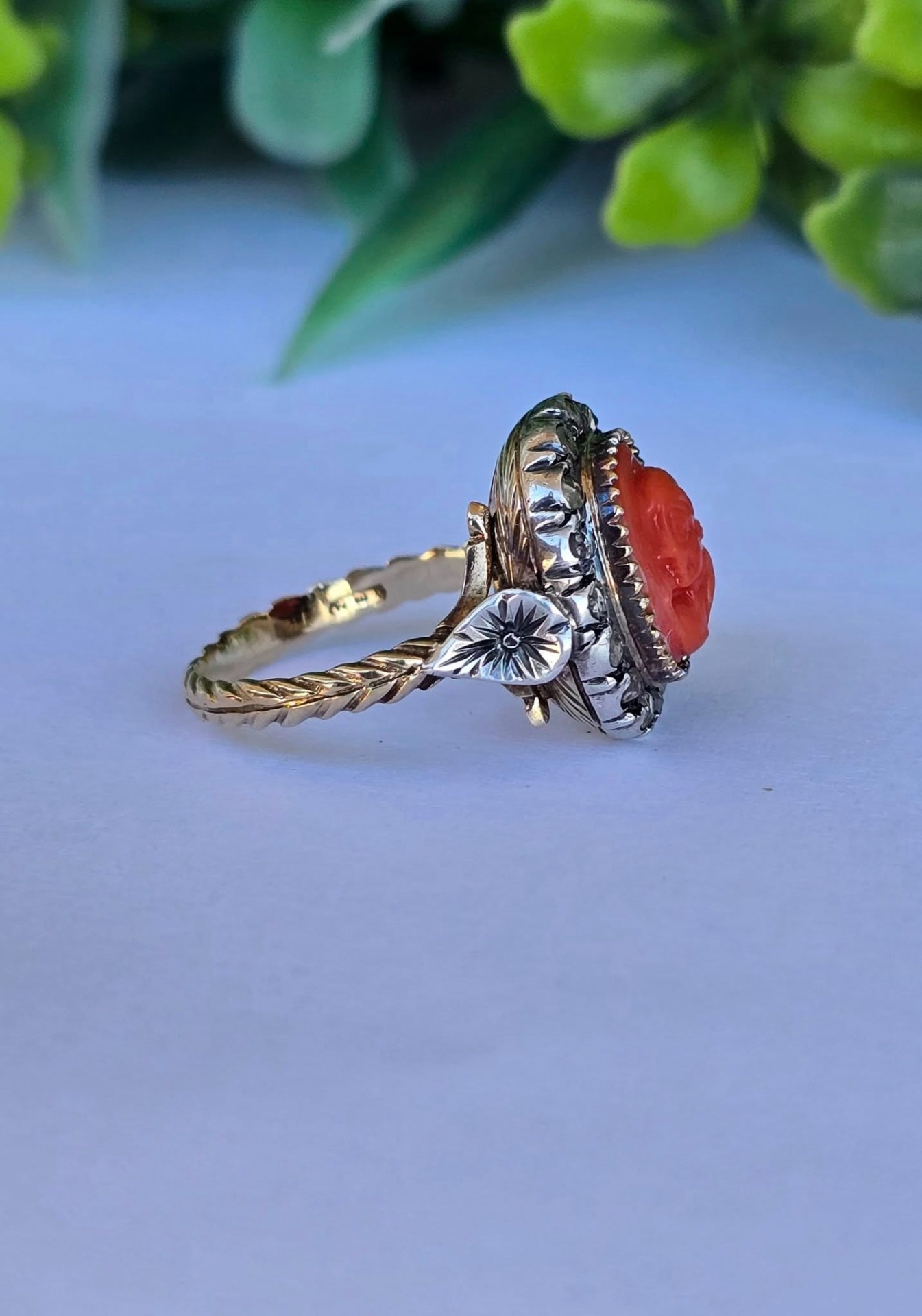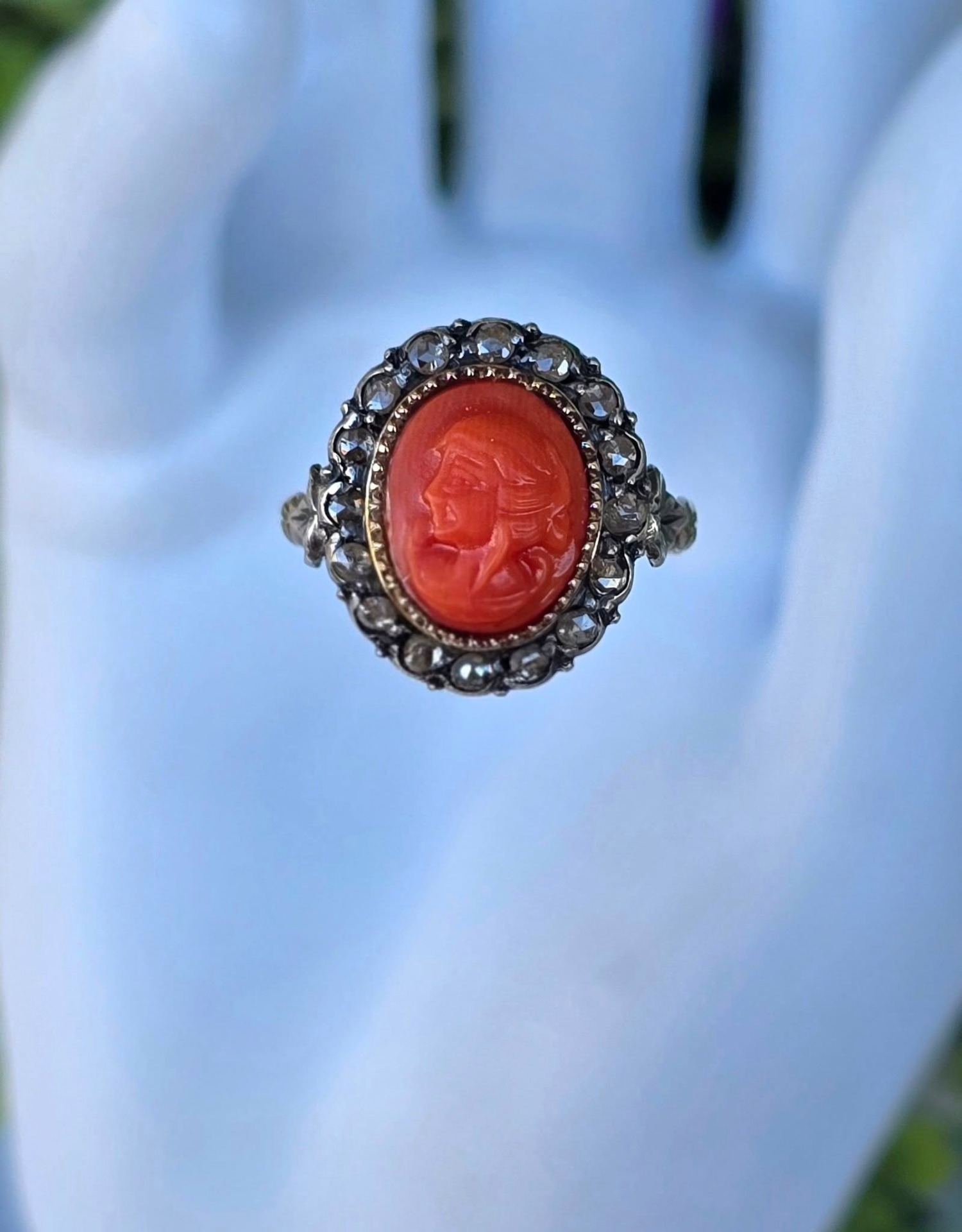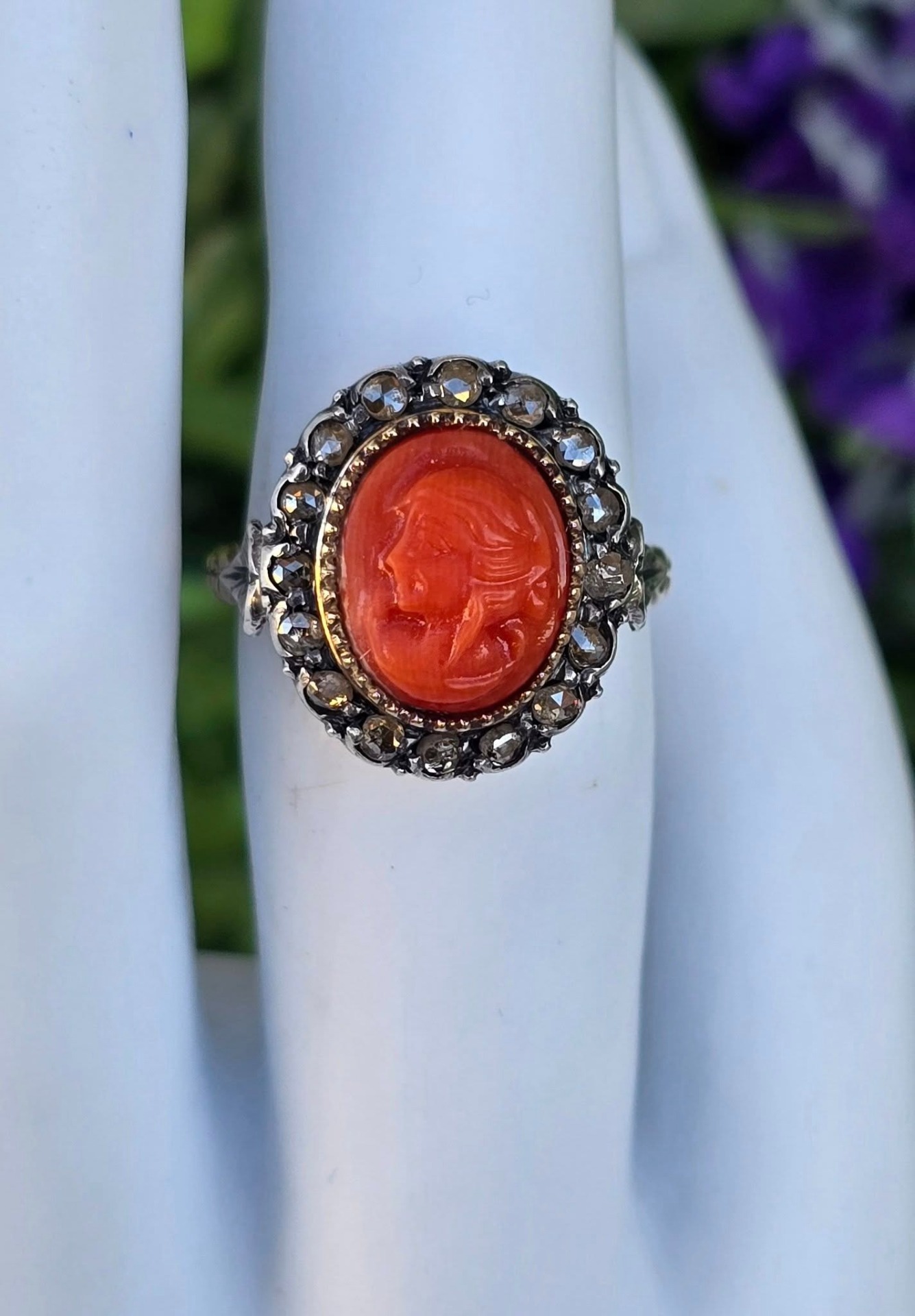 Inel vechi spectaculos, "Belle Epoque Revival", din aur de 14K, cu camee sculptată manual în coral mediteraneean natural și 16 diamante naturale "rose-cut"