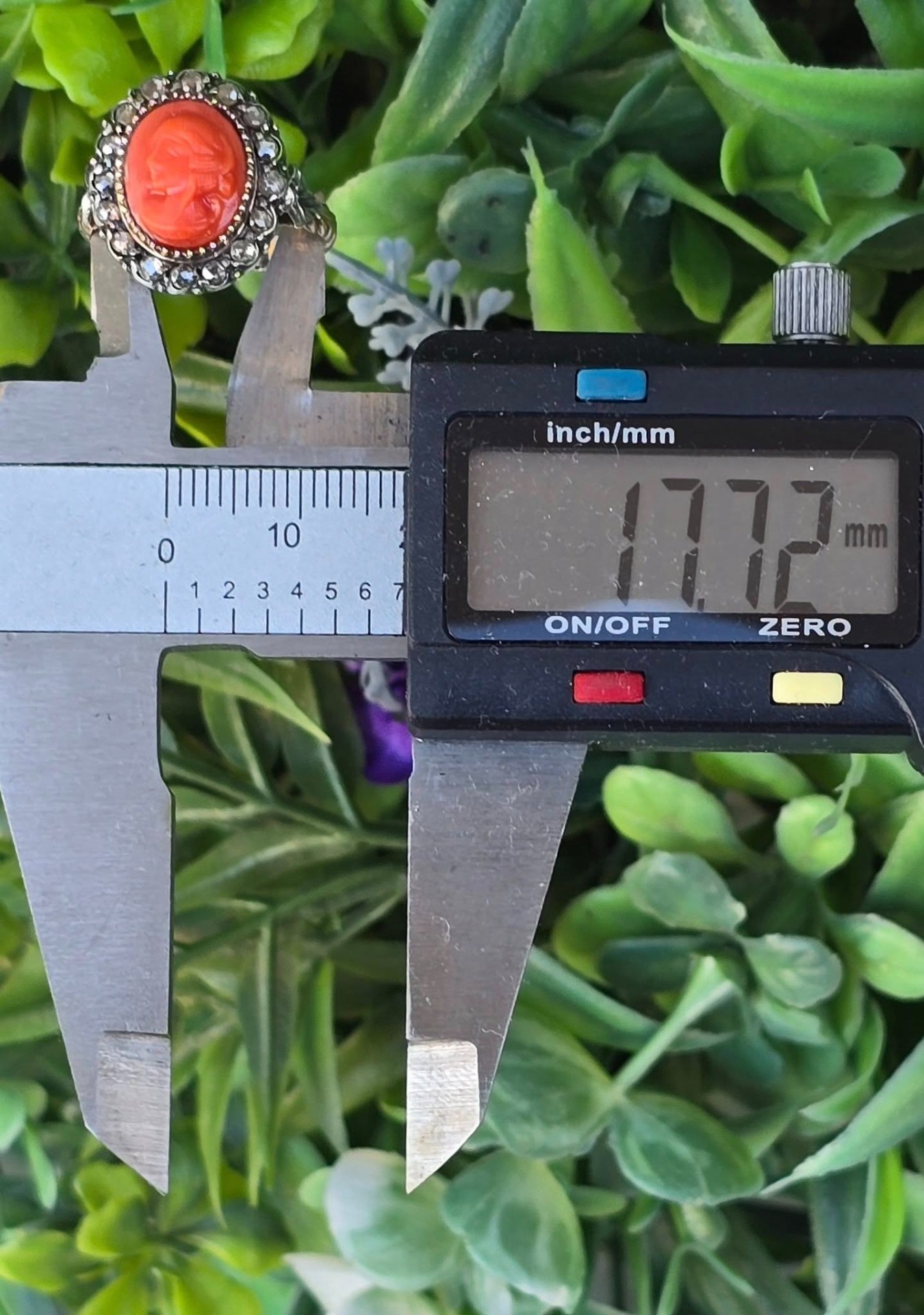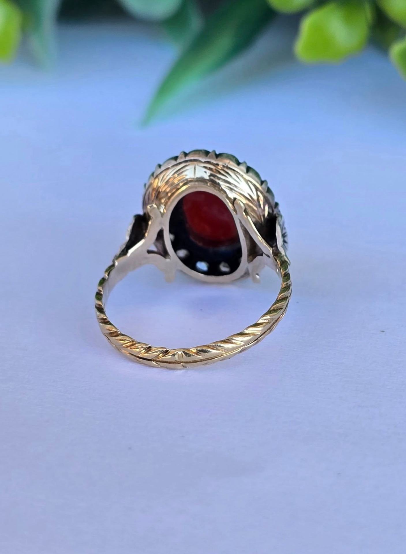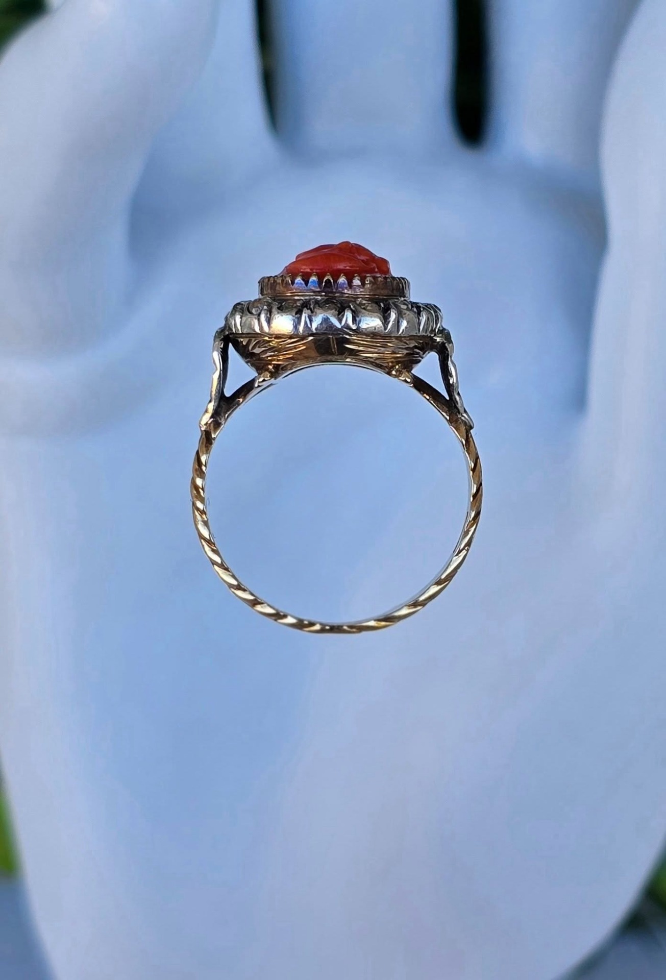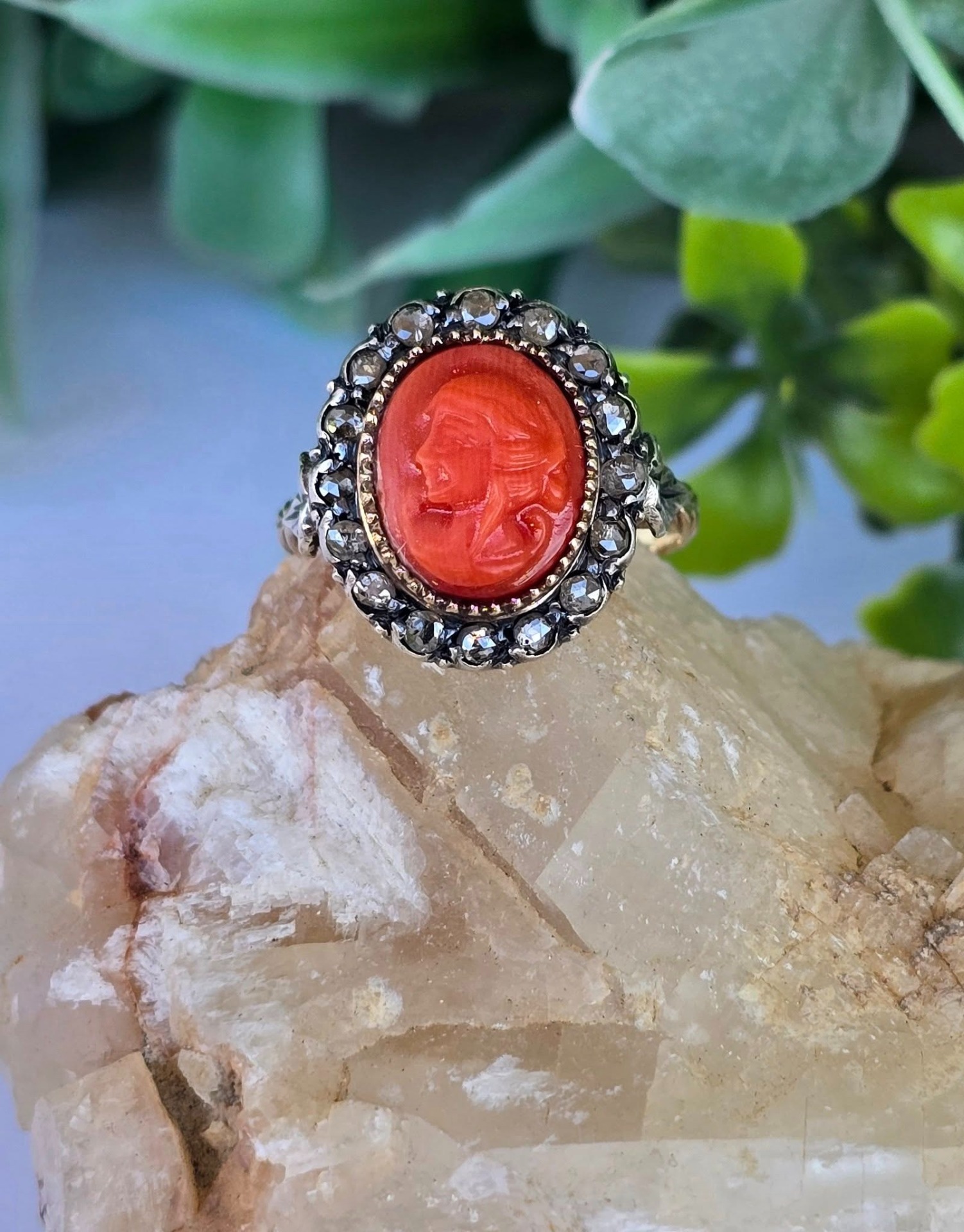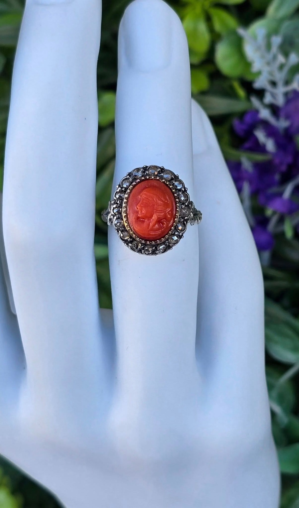 Inel vechi spectaculos, "Belle Epoque Revival", din aur de 14K, cu camee sculptată manual în coral mediteraneean natural și 16 diamante naturale "rose-cut"