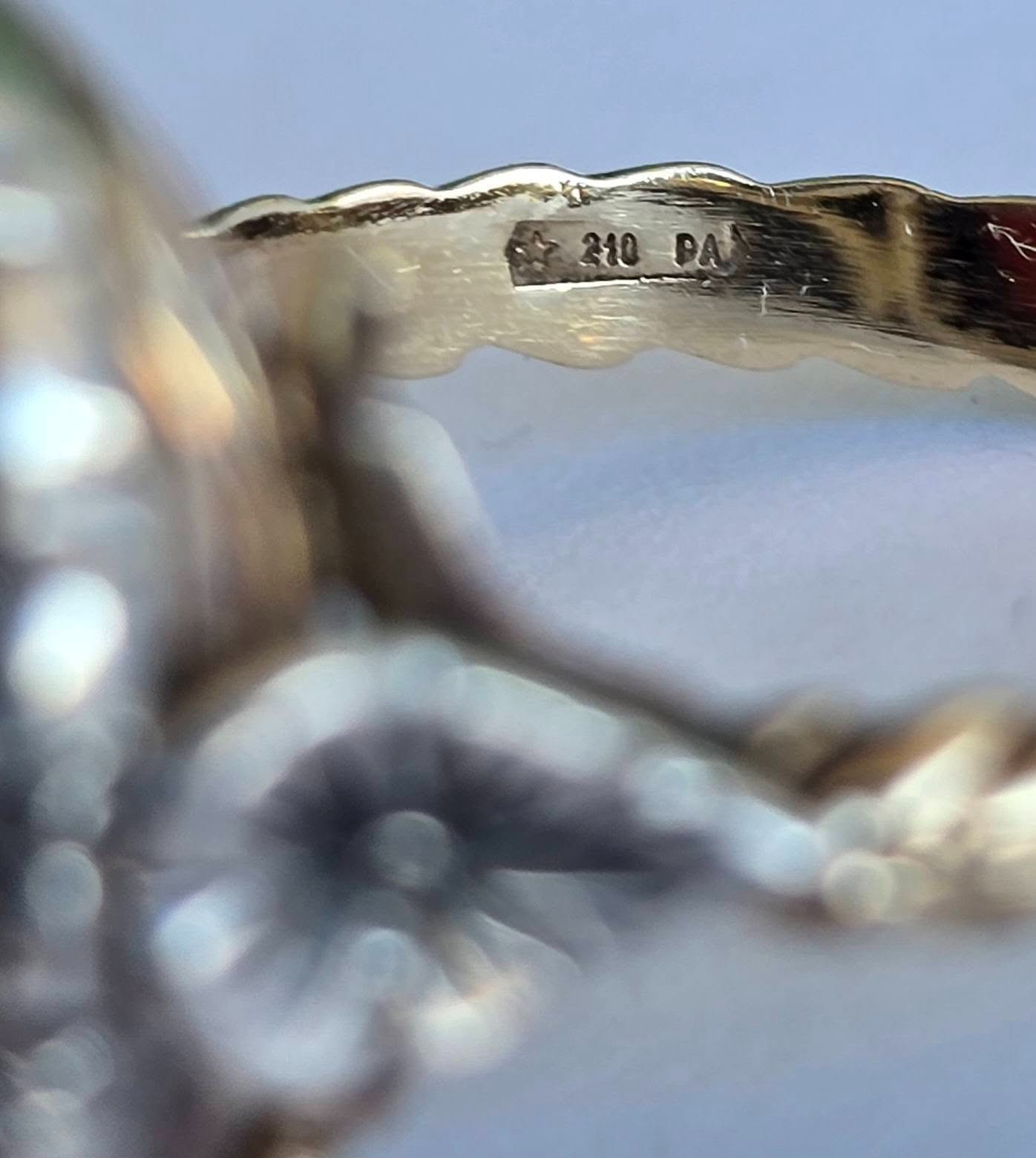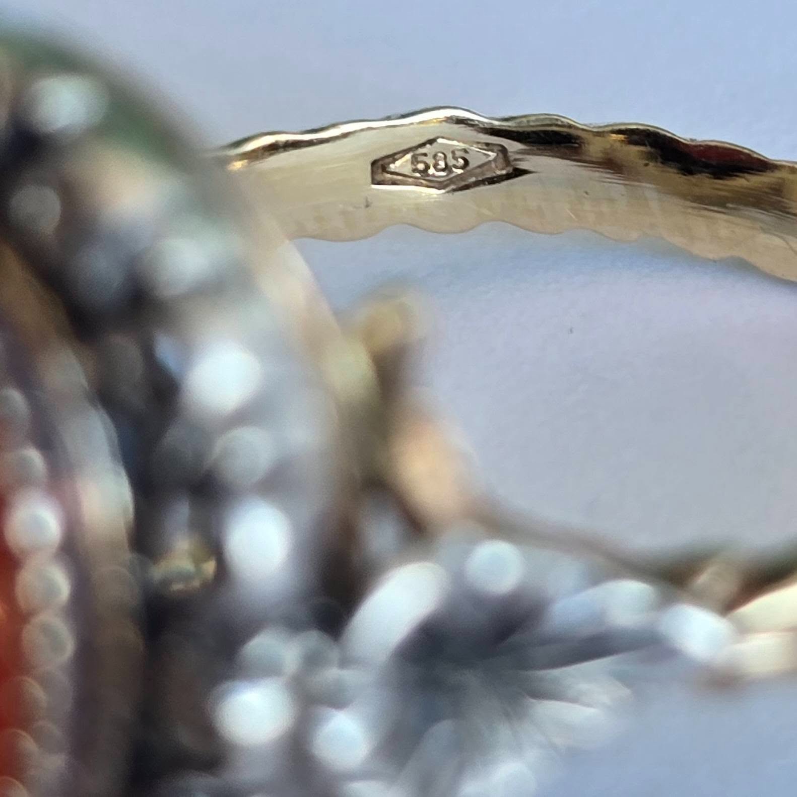 Prezintă marcaj 585 pentru puritate aur de 14K, marcaj de atelier și de provincie de certificare.