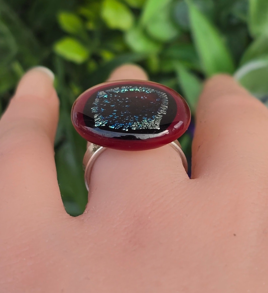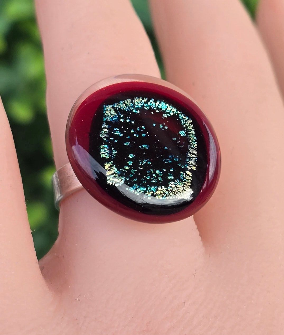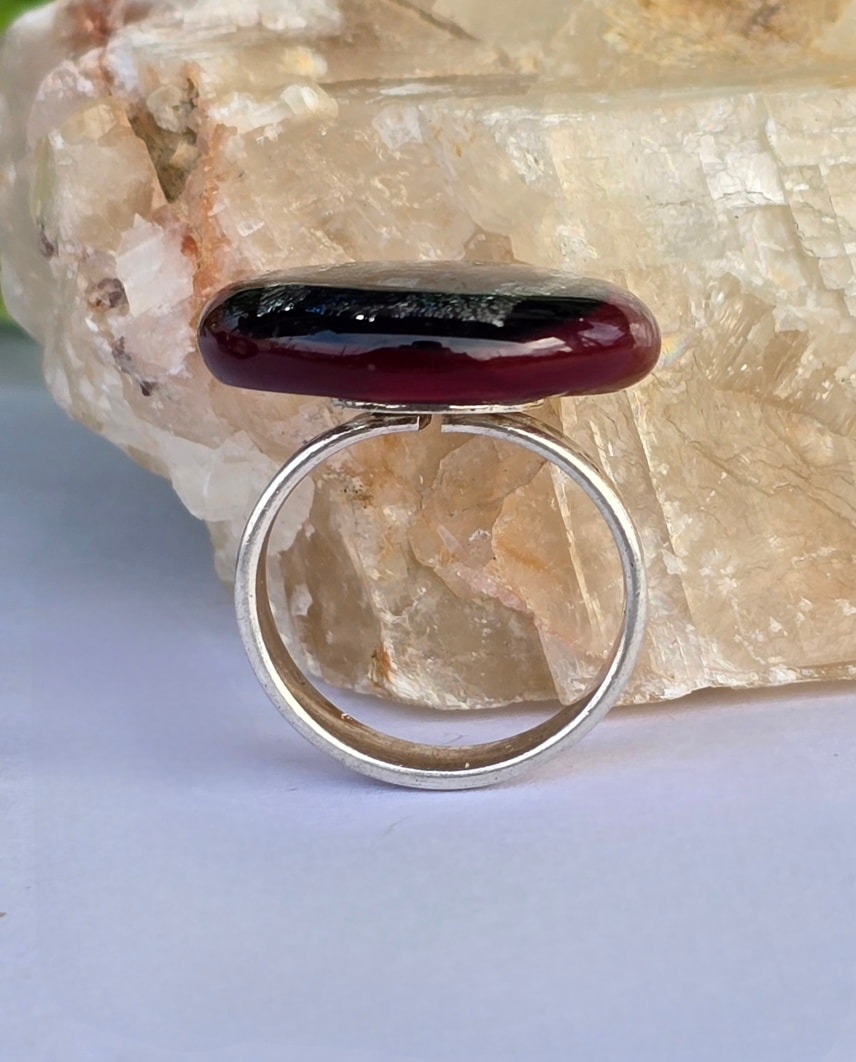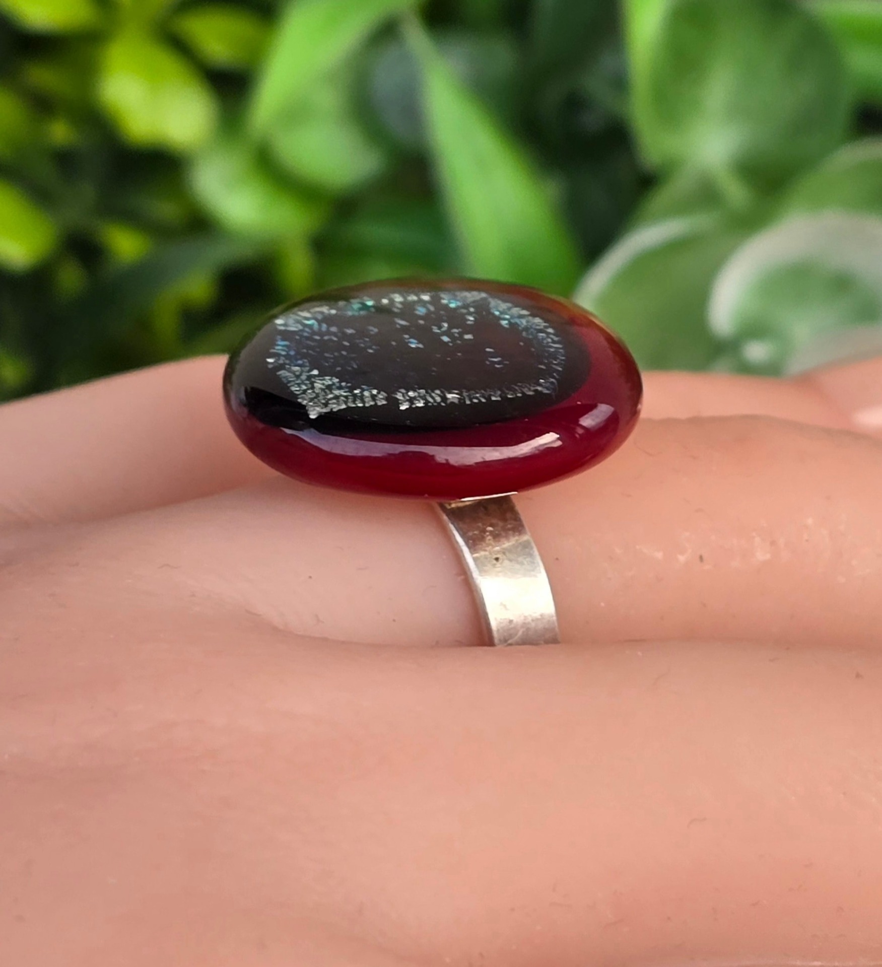 Inel vechi spectaculos din argint, cu "fused glass" (sticlă dicroică), manufactură deosebită.