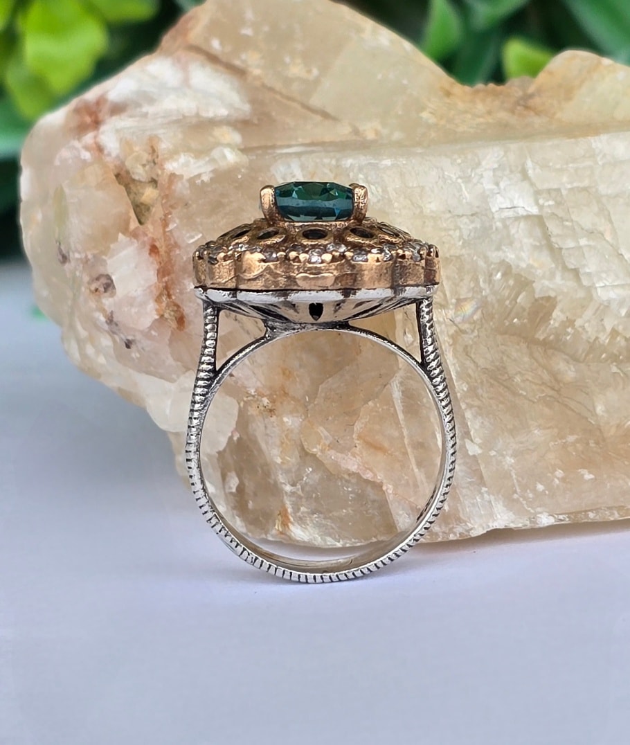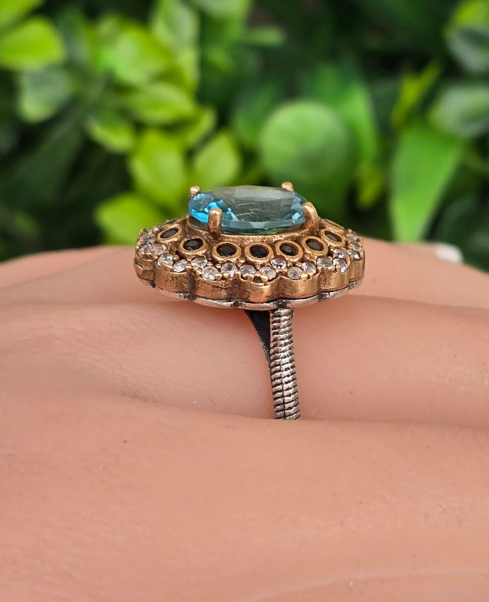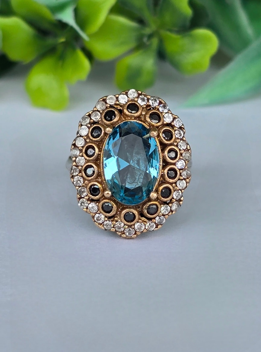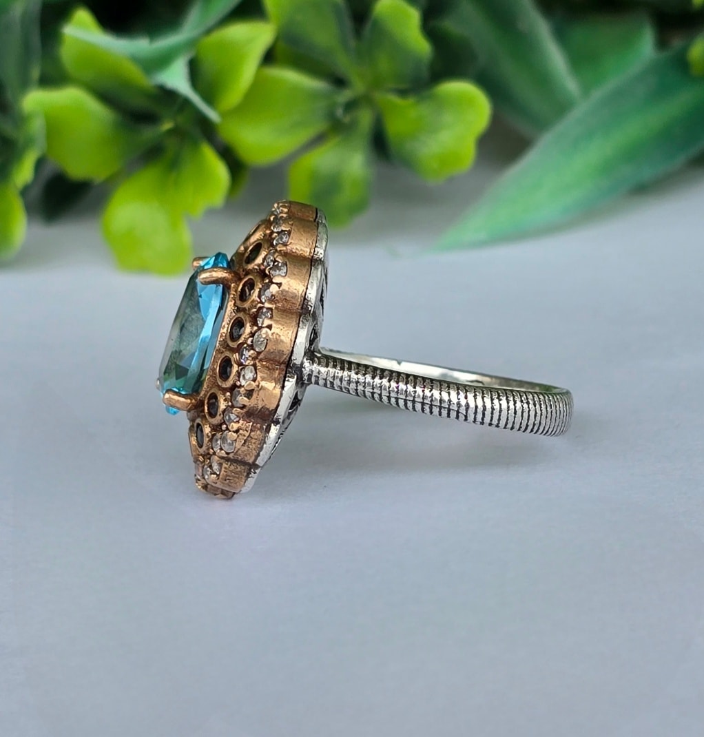Inel vechi spectaculos, din argint, cu pietre cubic zirconia în montură din bronz.