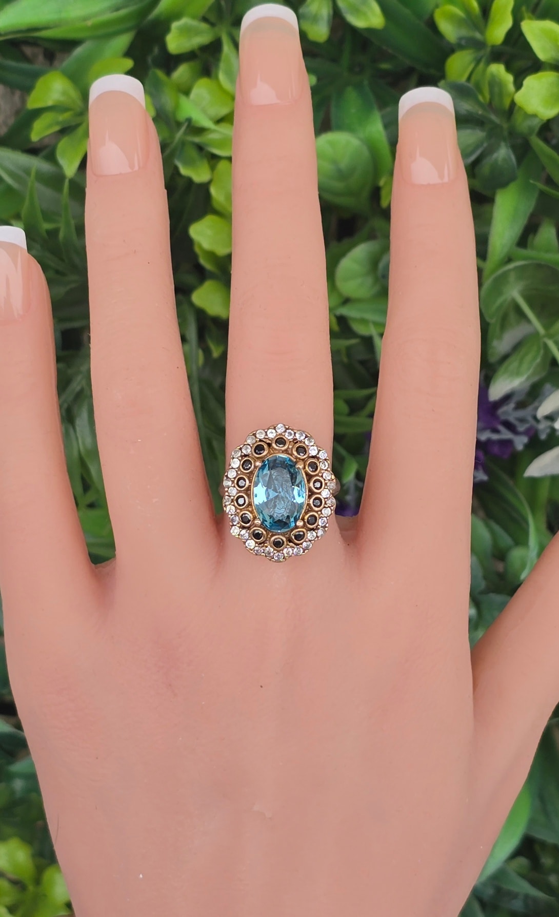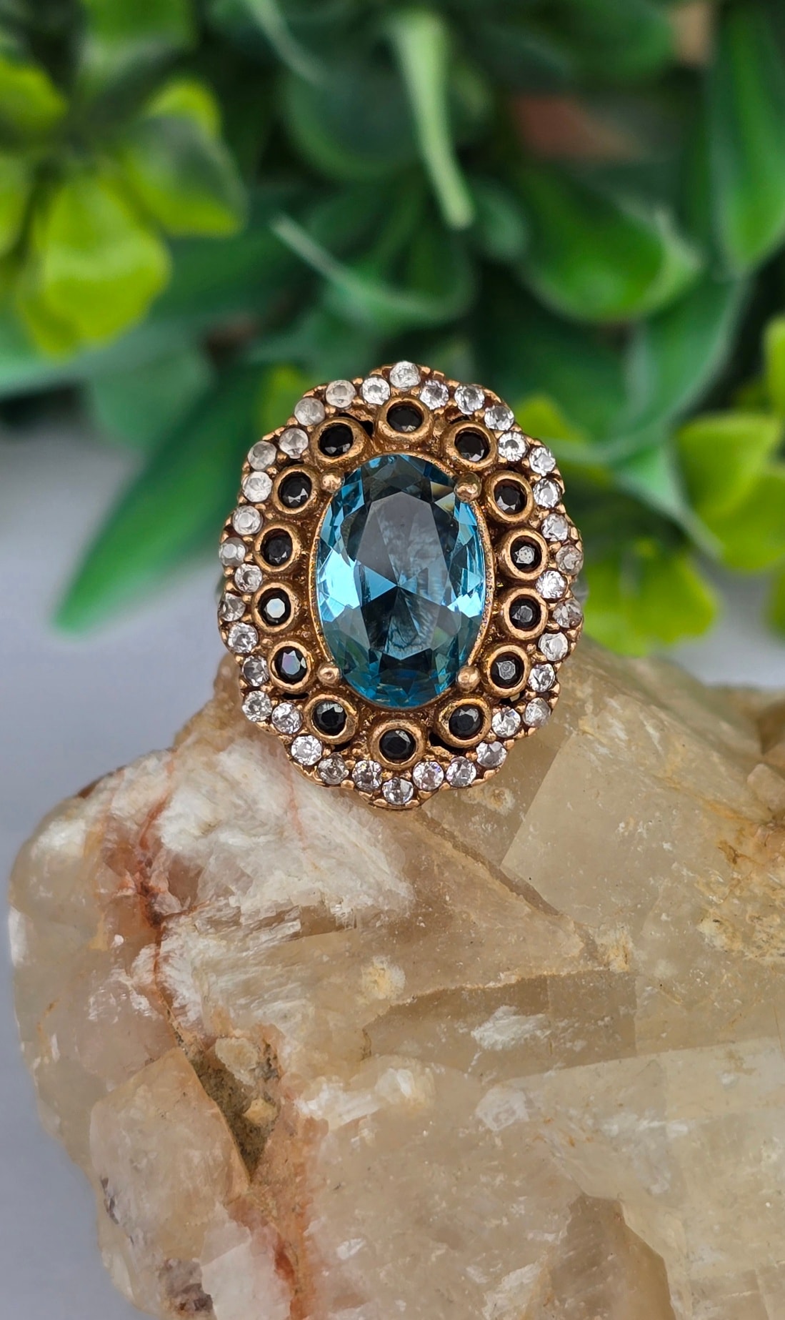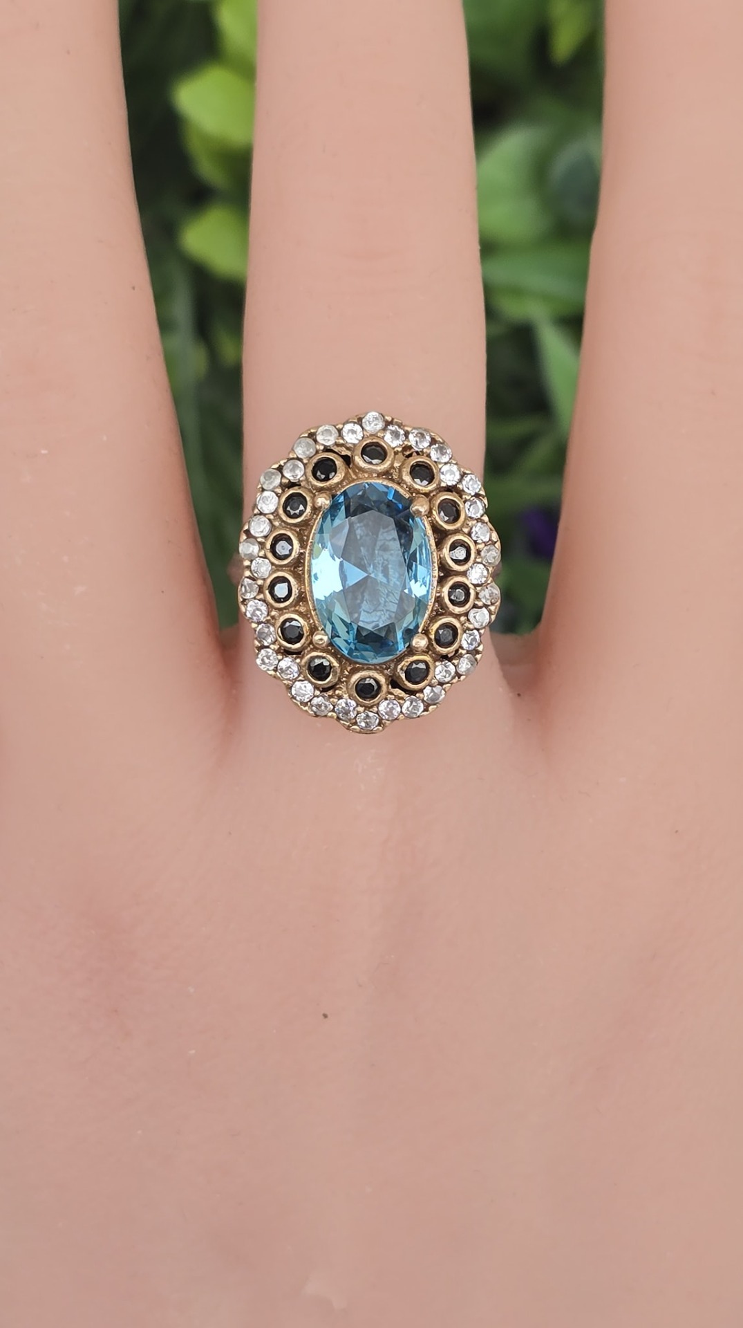 Inel vechi spectaculos, din argint, cu pietre cubic zirconia în montură din bronz.