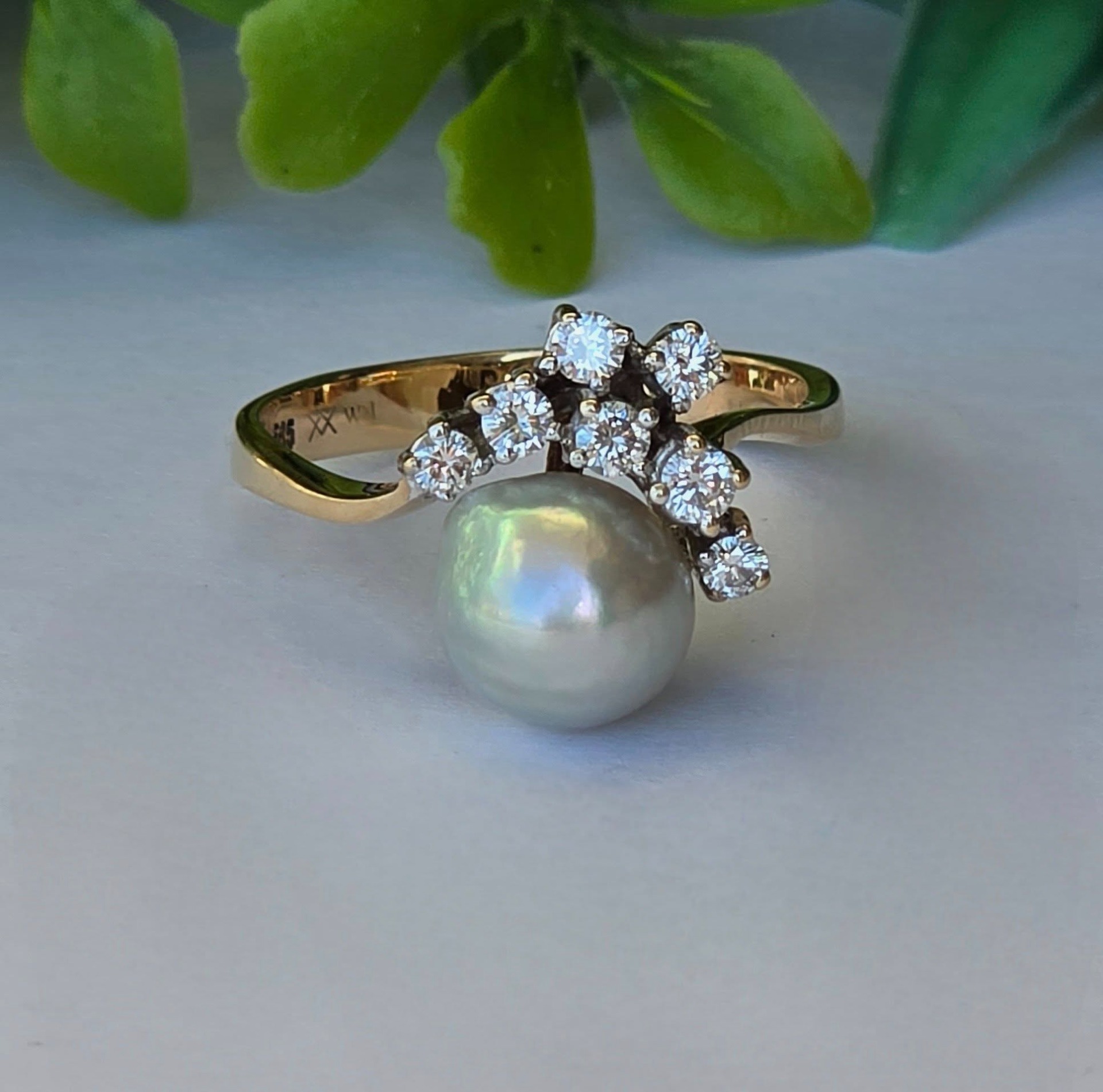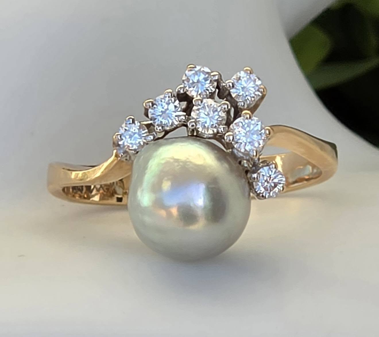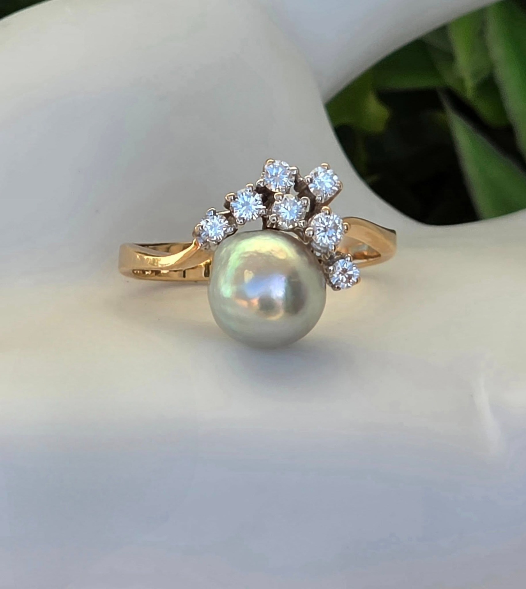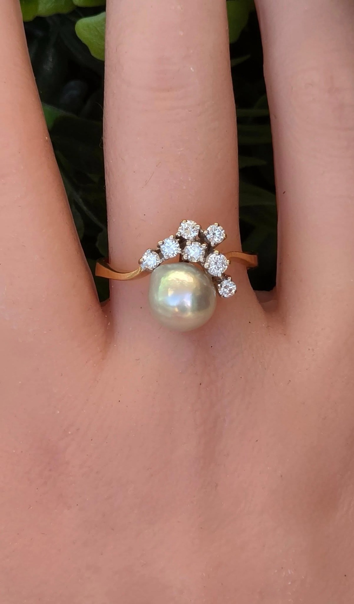 Inel vechi spectaculos, din aur de 14K, cu perlă naturală de cultură, cu lustru deosebit, în nuanțe de gri-argintiu cu ușoare irizații verzui-rozalii, specifice perlelor de înaltă calitate, și 7 diamante naturale (0.36ct) de calitate excelentă.