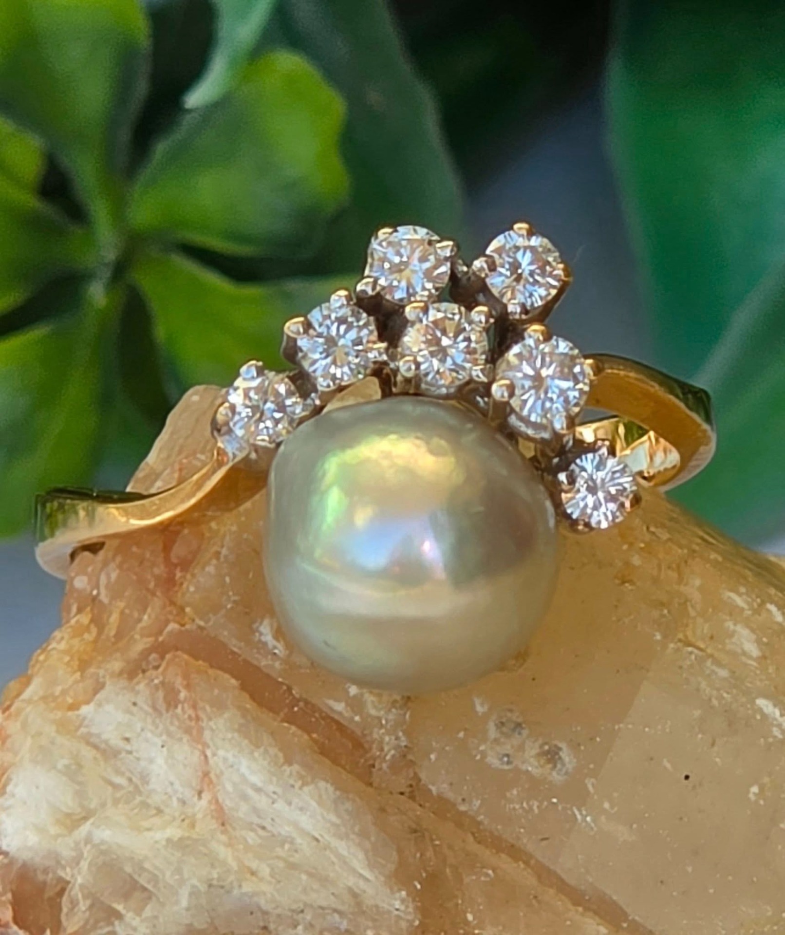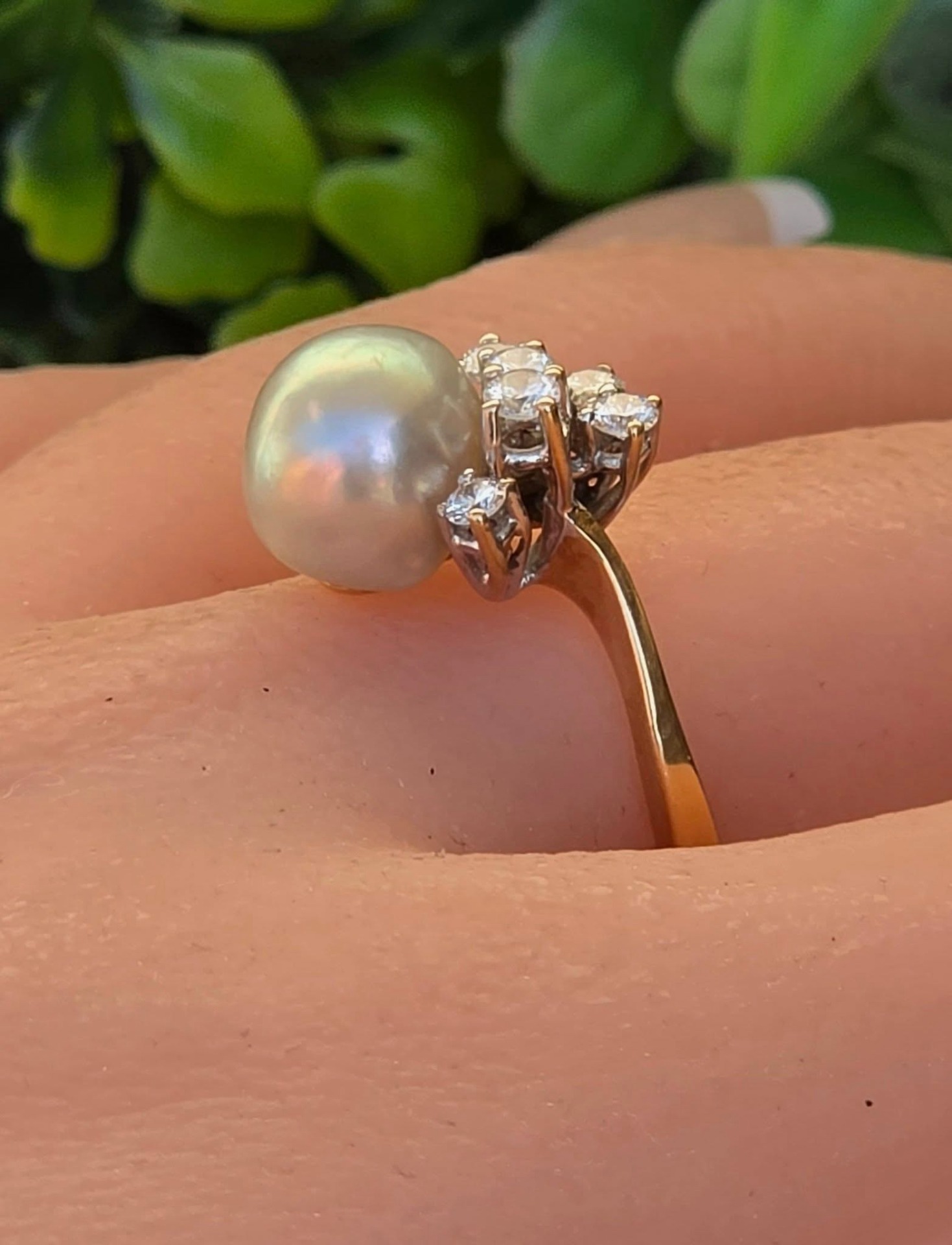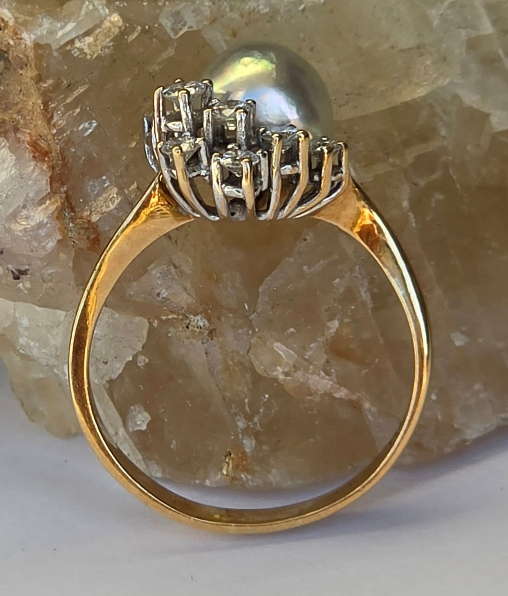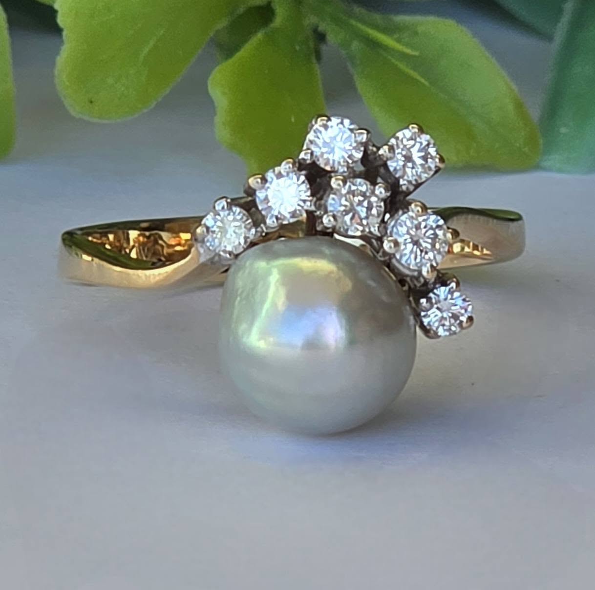 Inel vechi spectaculos, din aur de 14K, cu perlă naturală de cultură, cu lustru deosebit, în nuanțe de gri-argintiu cu ușoare irizații verzui-rozalii, specifice perlelor de înaltă calitate, și 7 diamante naturale (0.36ct) de calitate excelentă.