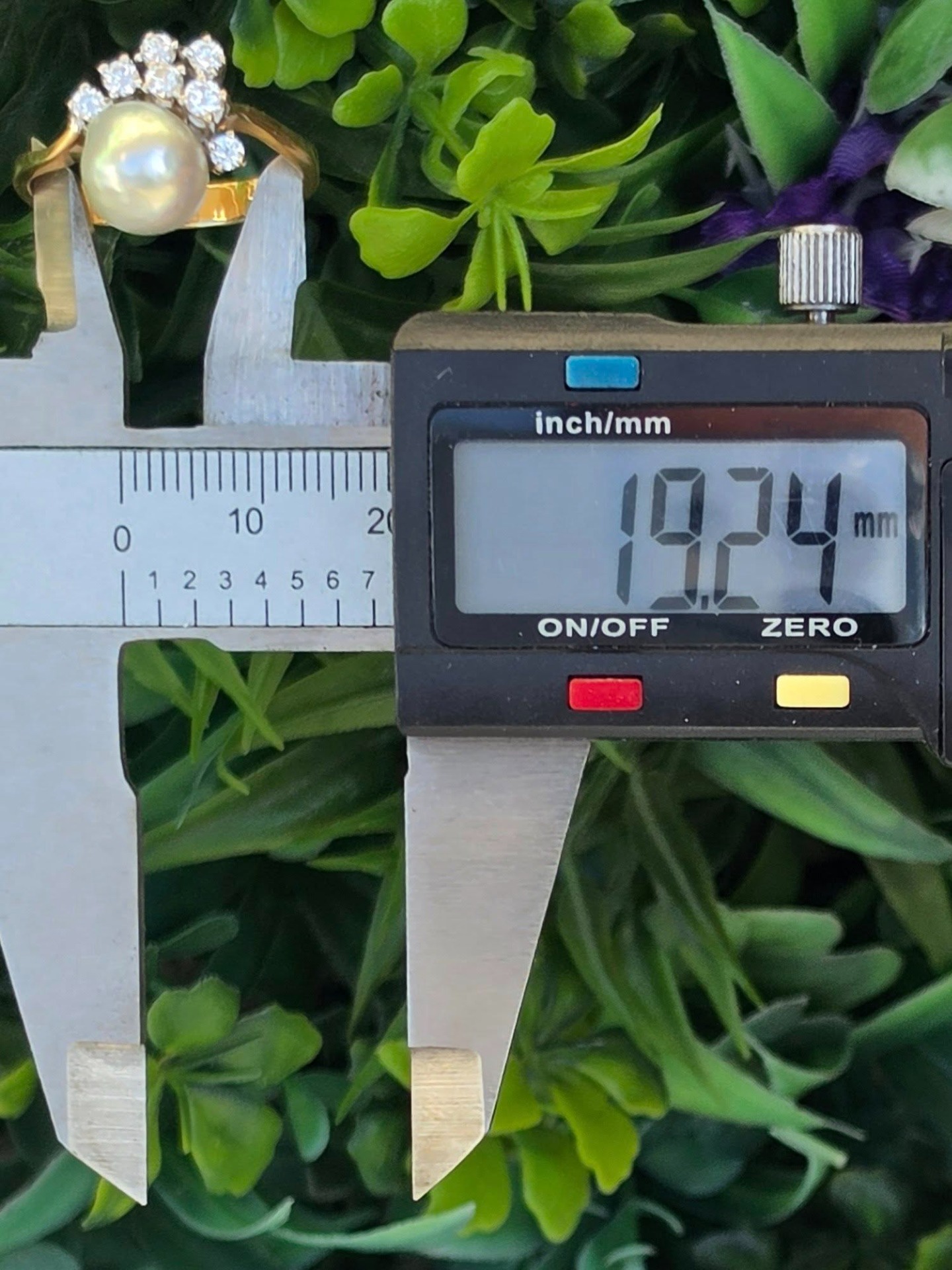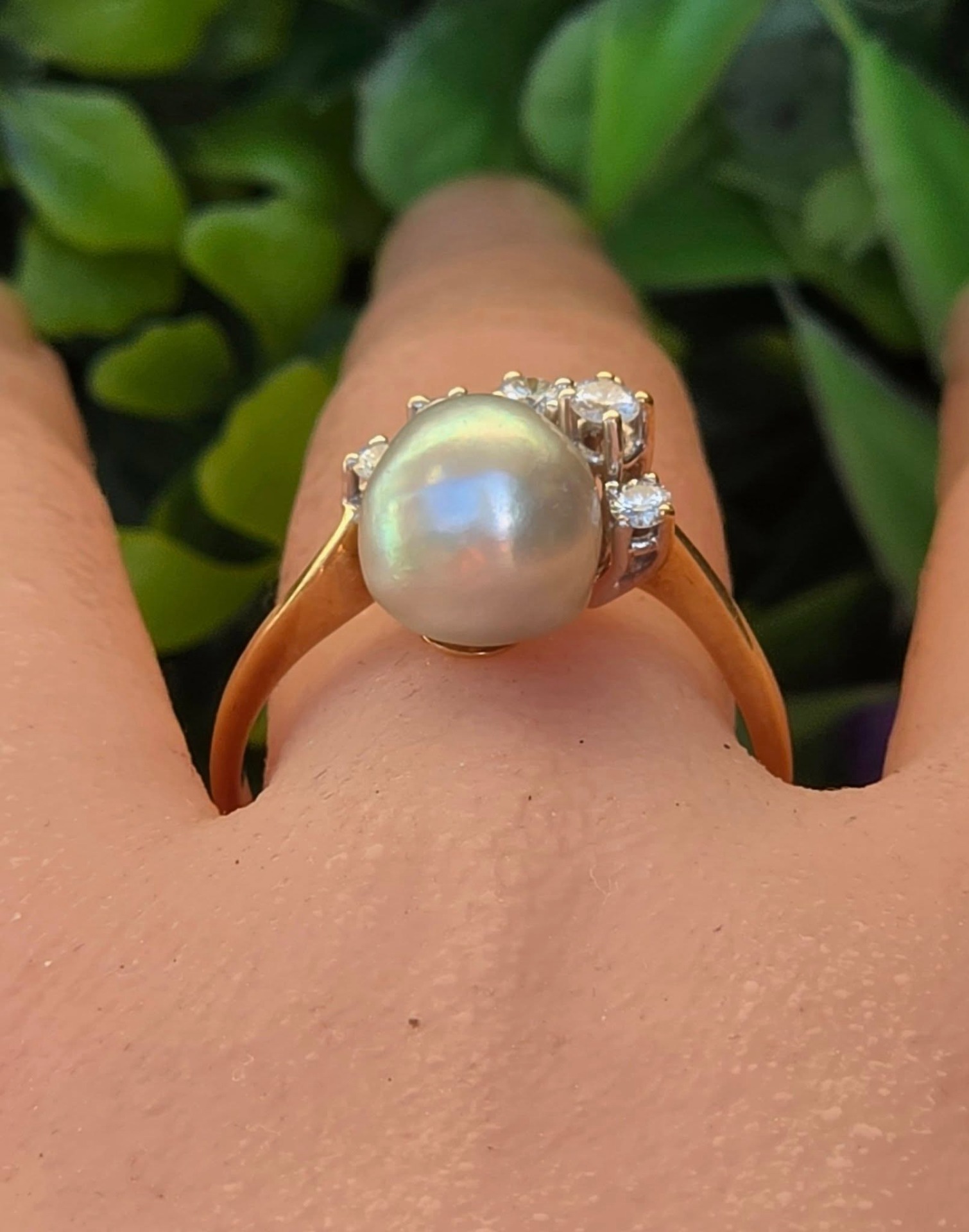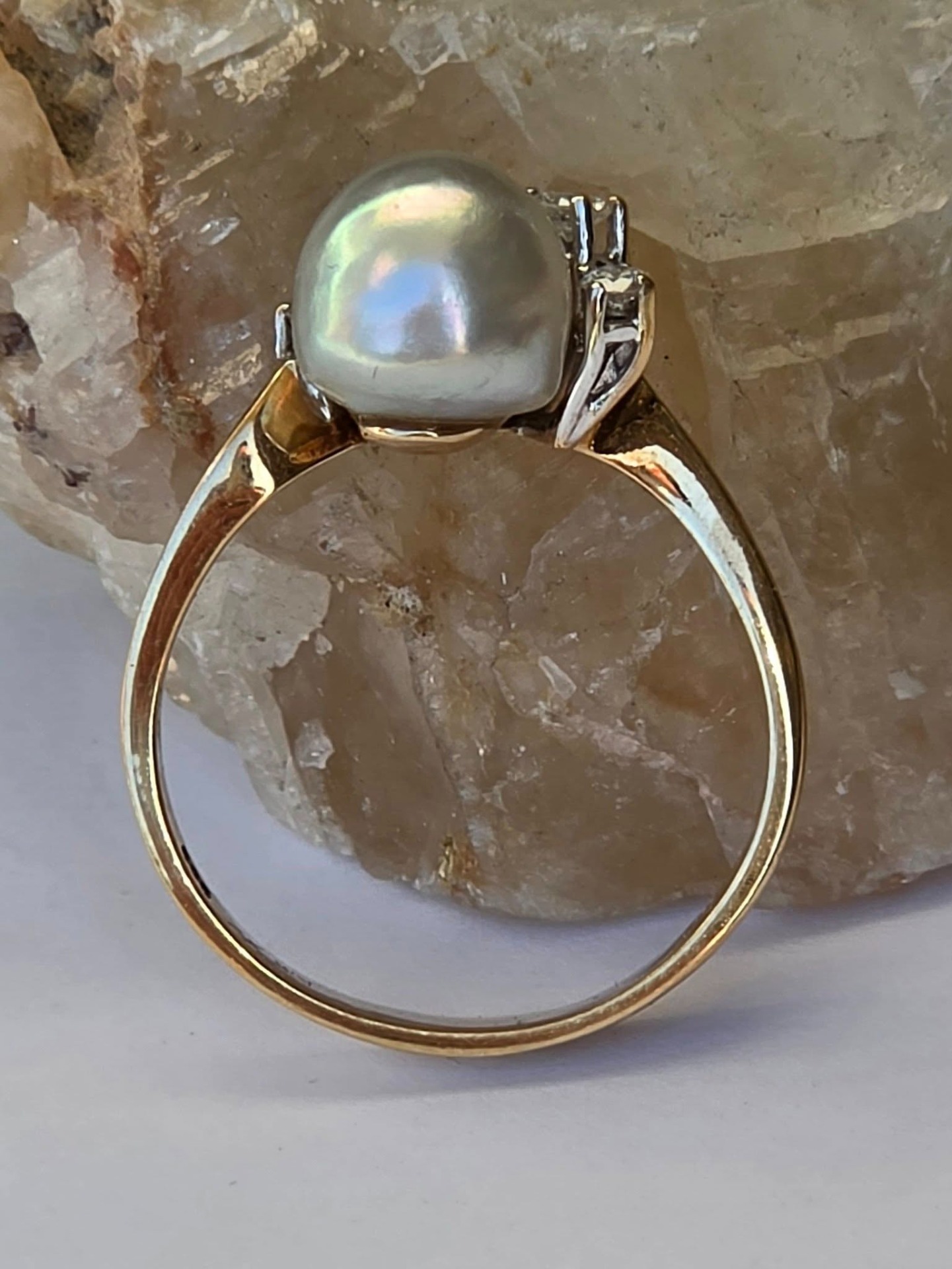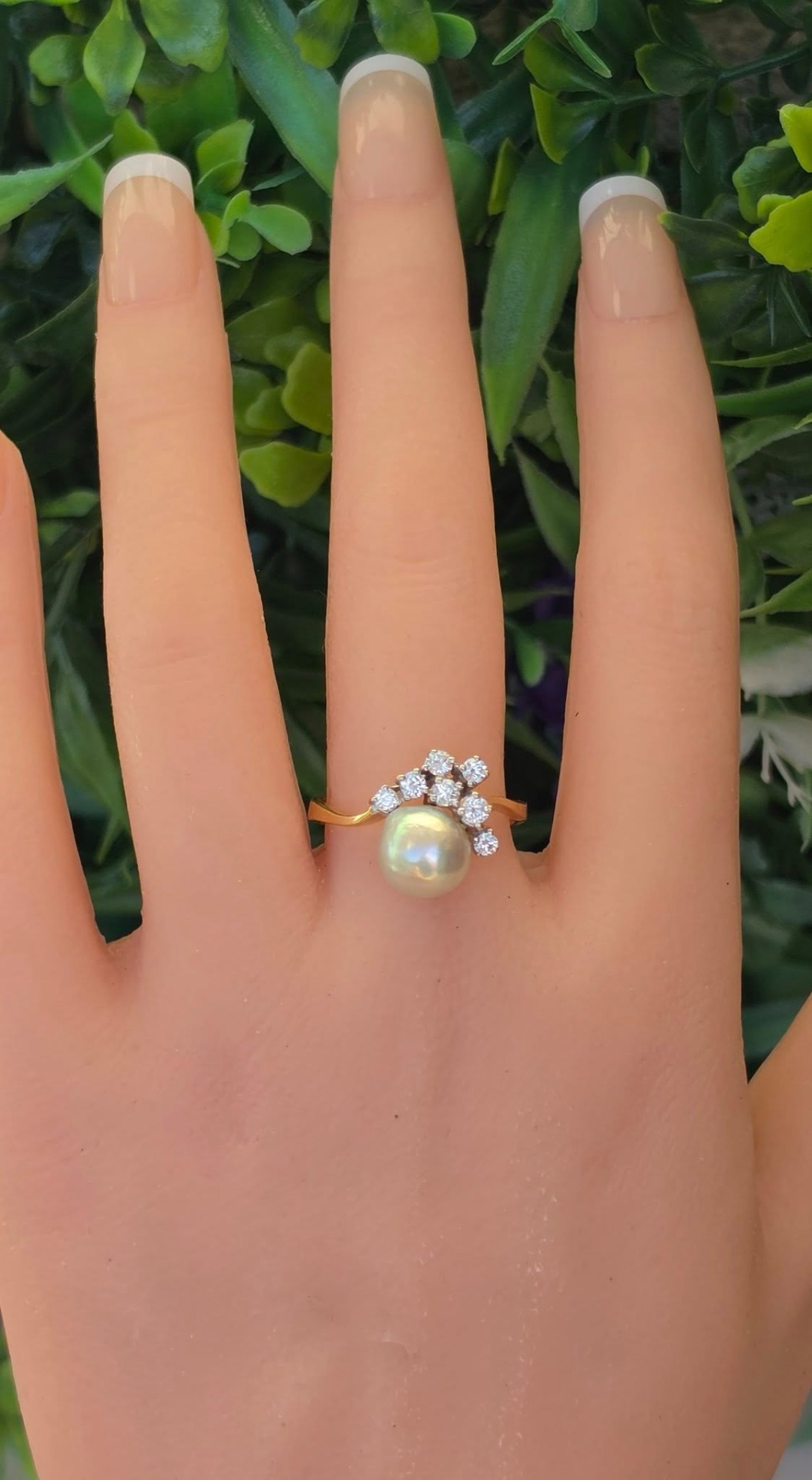 Inel vechi spectaculos, din aur de 14K, cu perlă naturală de cultură, cu lustru deosebit, în nuanțe de gri-argintiu cu ușoare irizații verzui-rozalii, specifice perlelor de înaltă calitate, și 7 diamante naturale (0.36ct) de calitate excelentă.