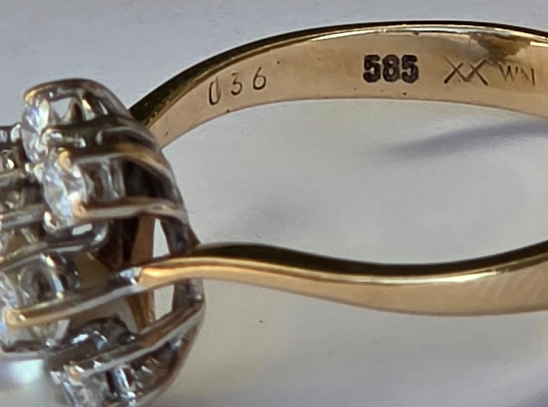 Prezintă marcaj 585 pentru puritate aur de 14K, marcaj "0.36" pentru caratajul diamantelor și marcaj de meșter.