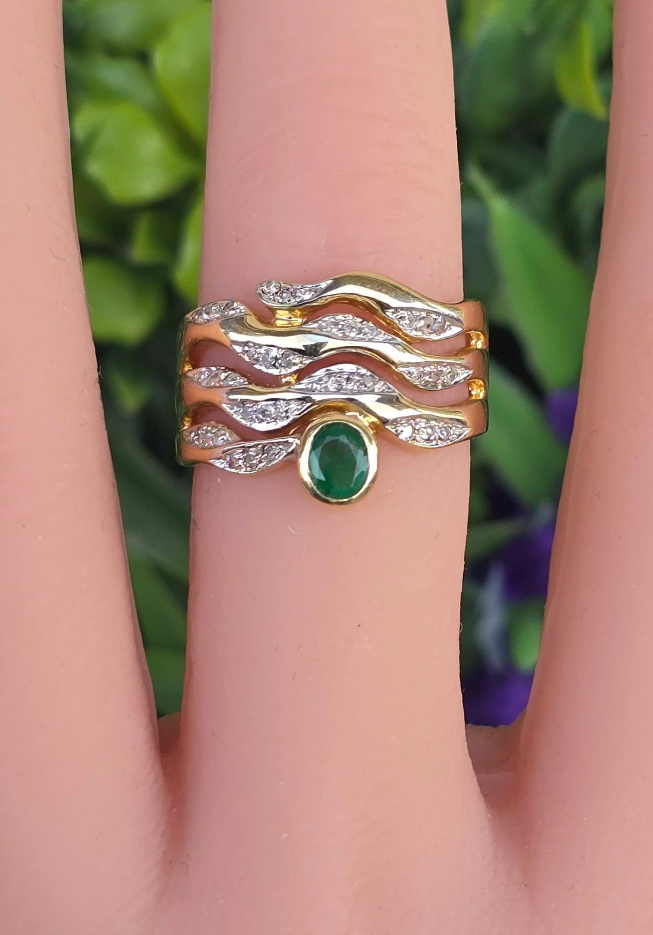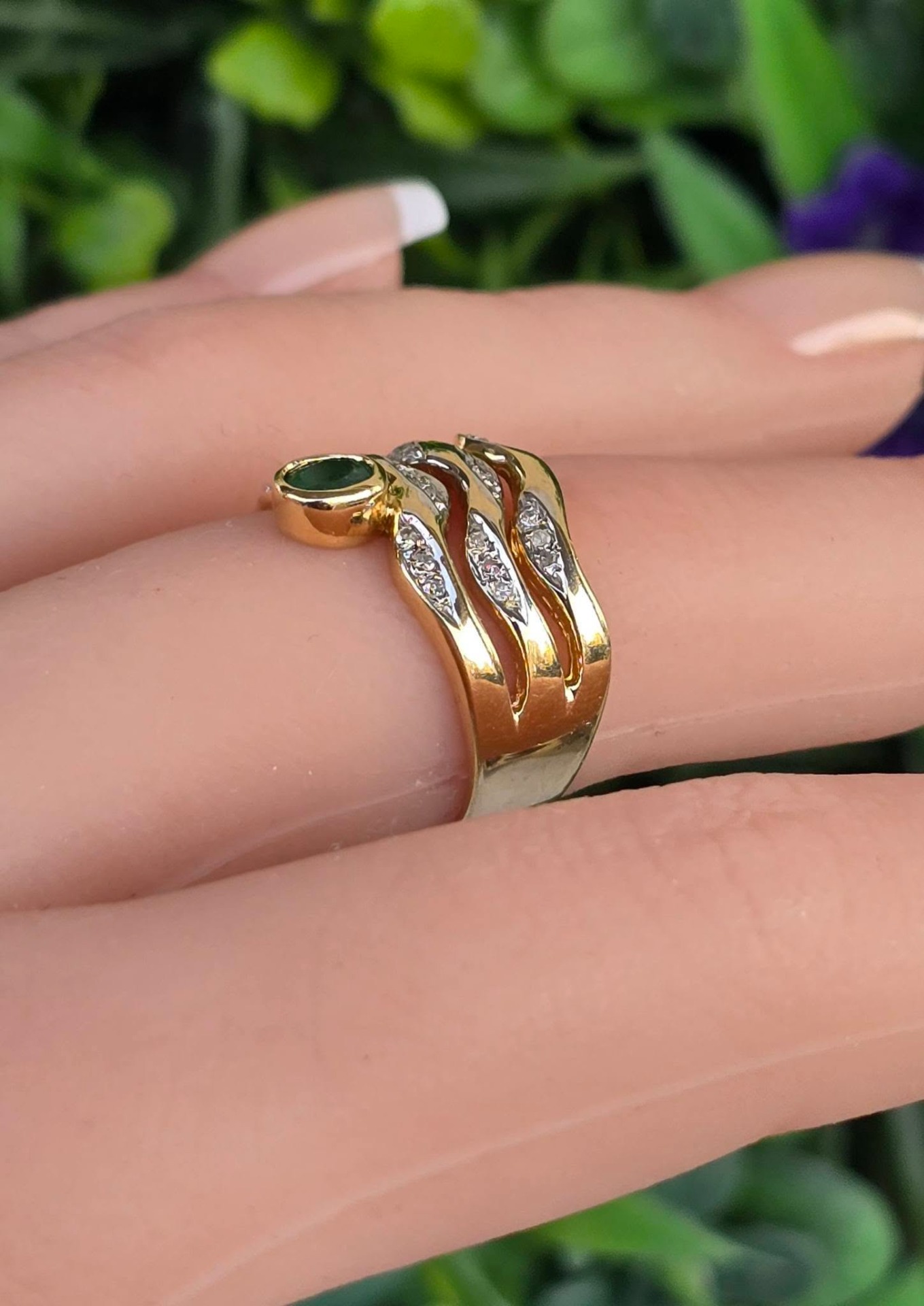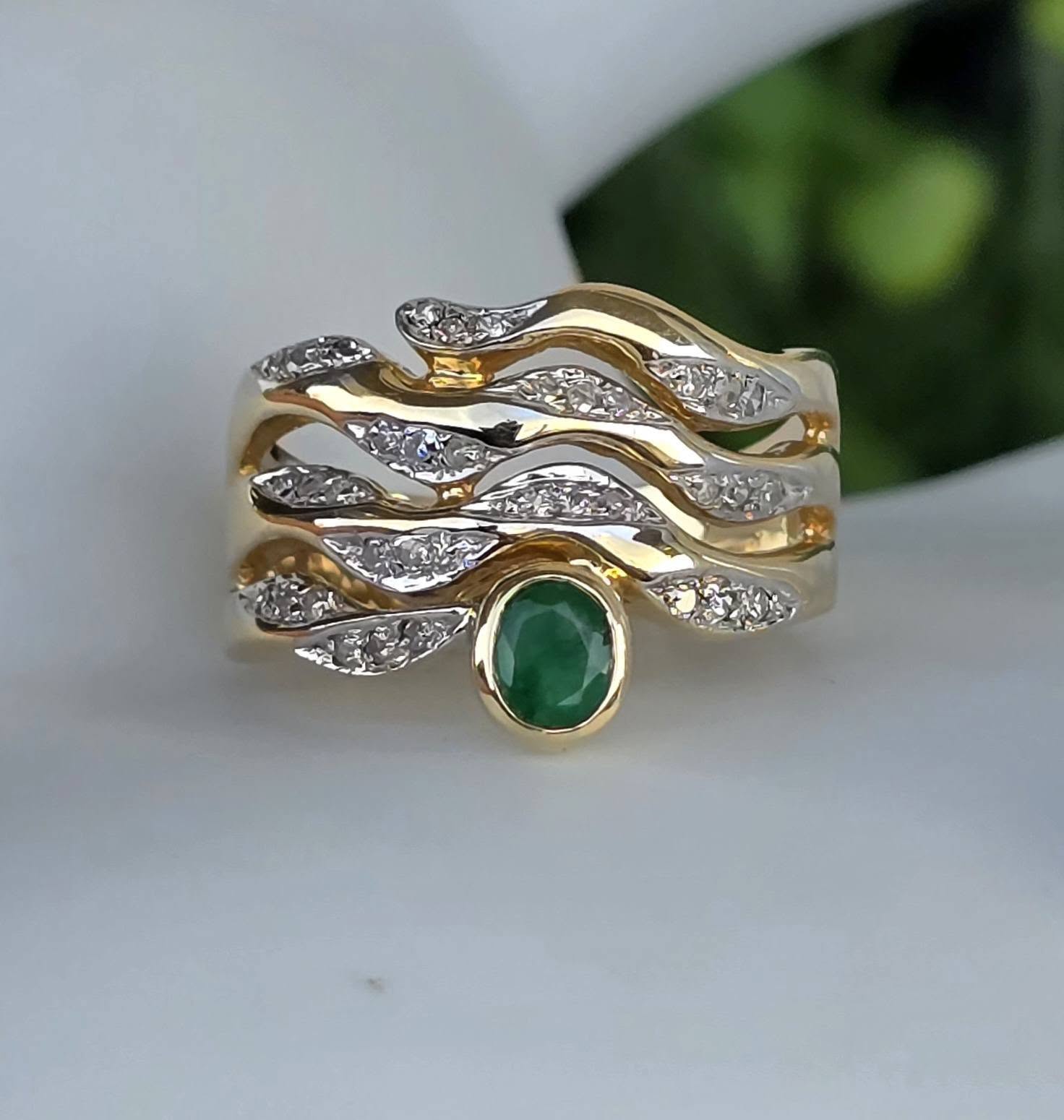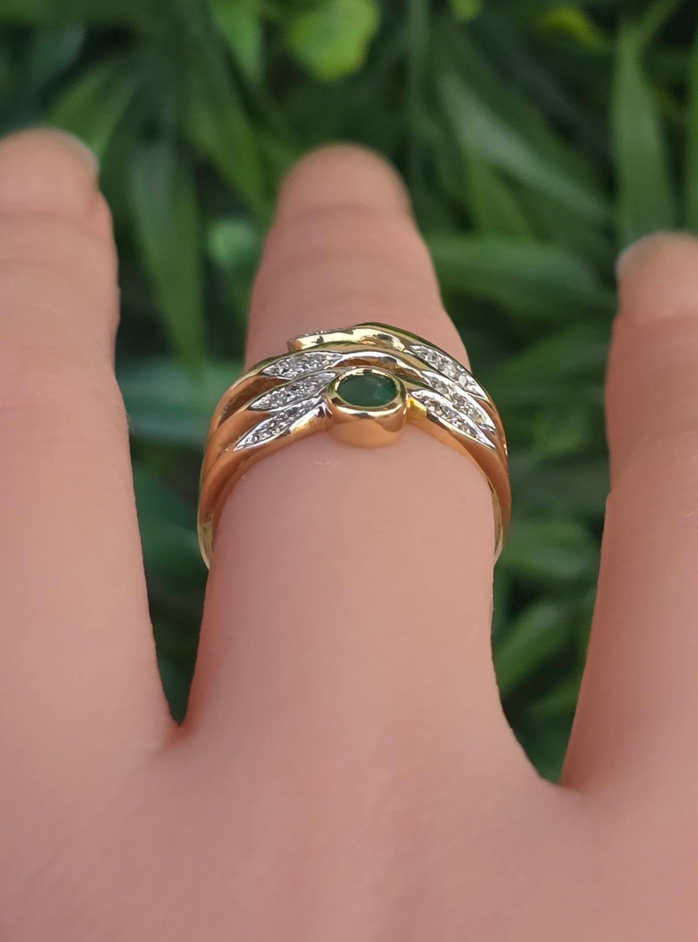 Inel vechi spectaculos, din aur de 14K, cu smarald și 36 diamante naturale.