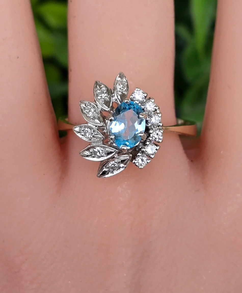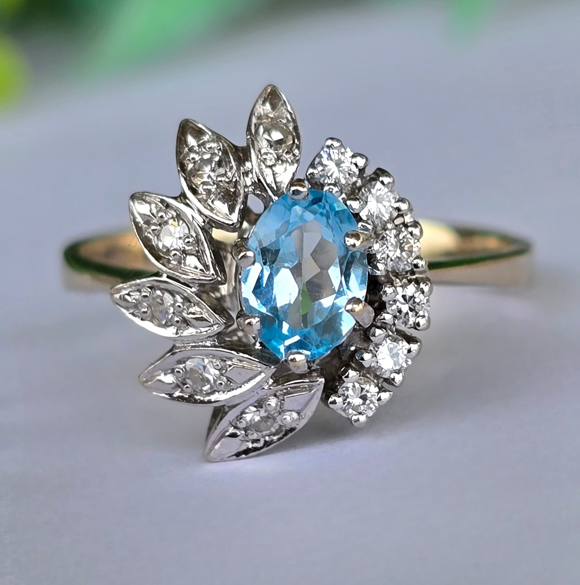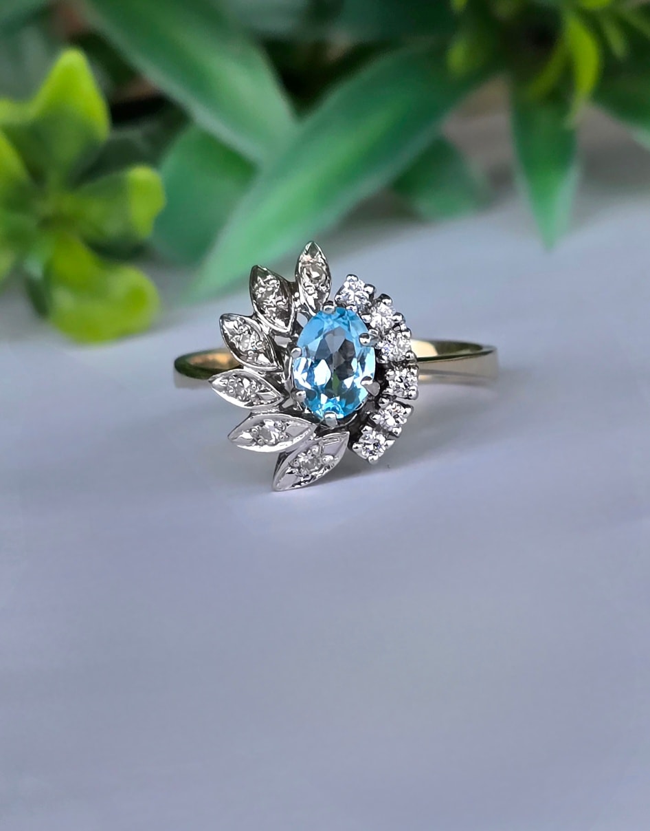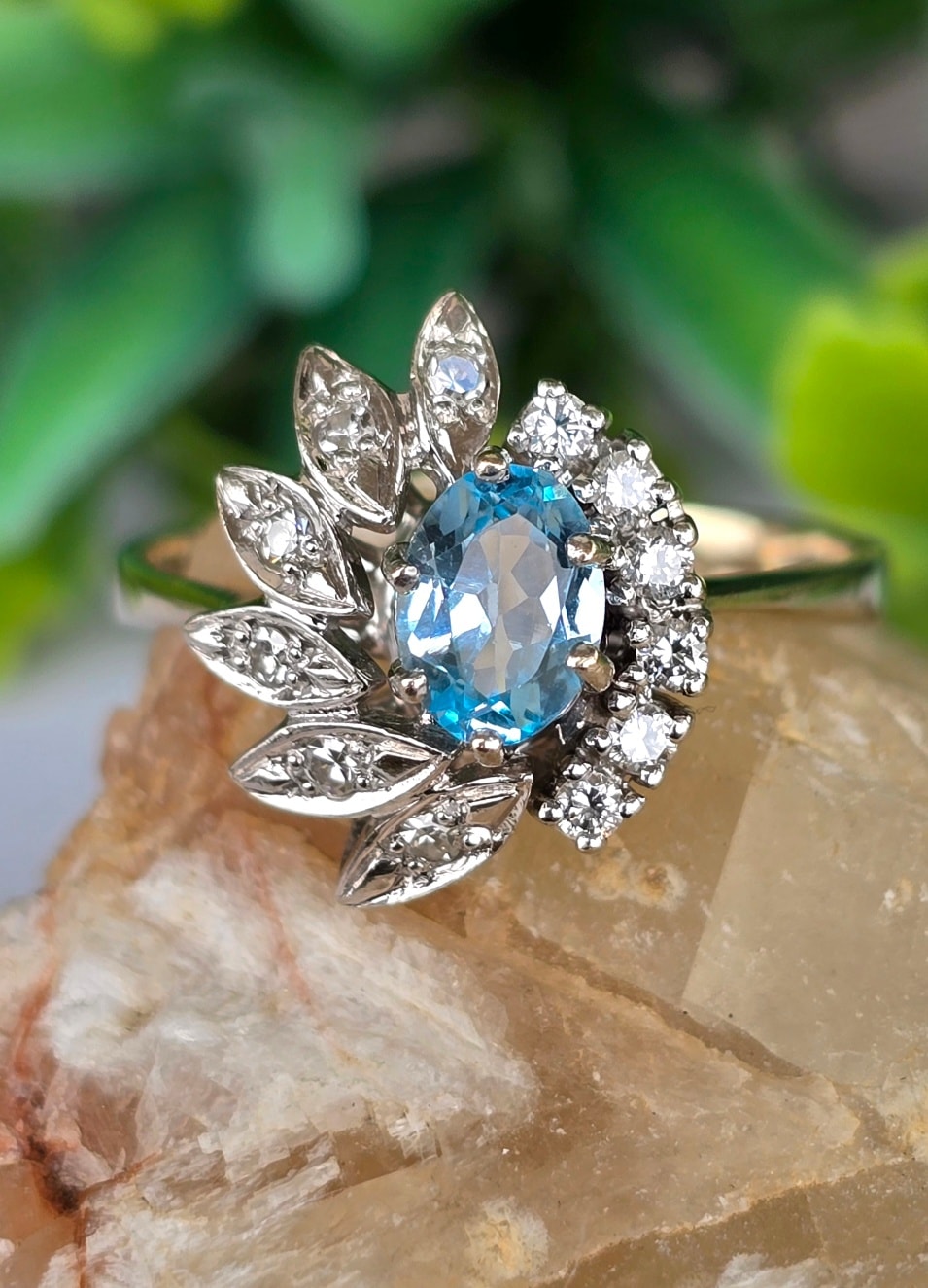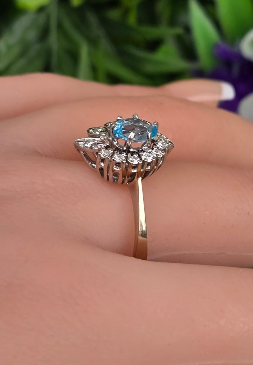 Inel vechi spectaculos, din aur de 14K, cu topaz și 12 diamante naturale de calitate superioară.