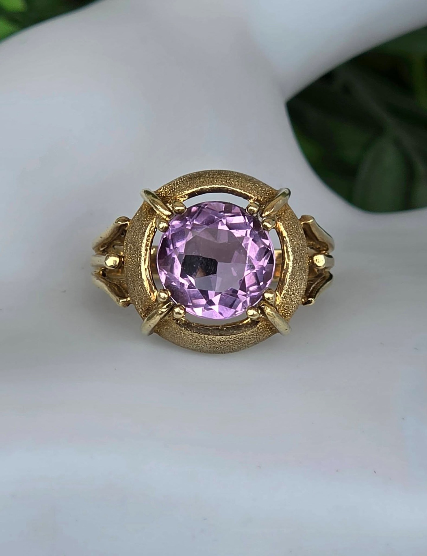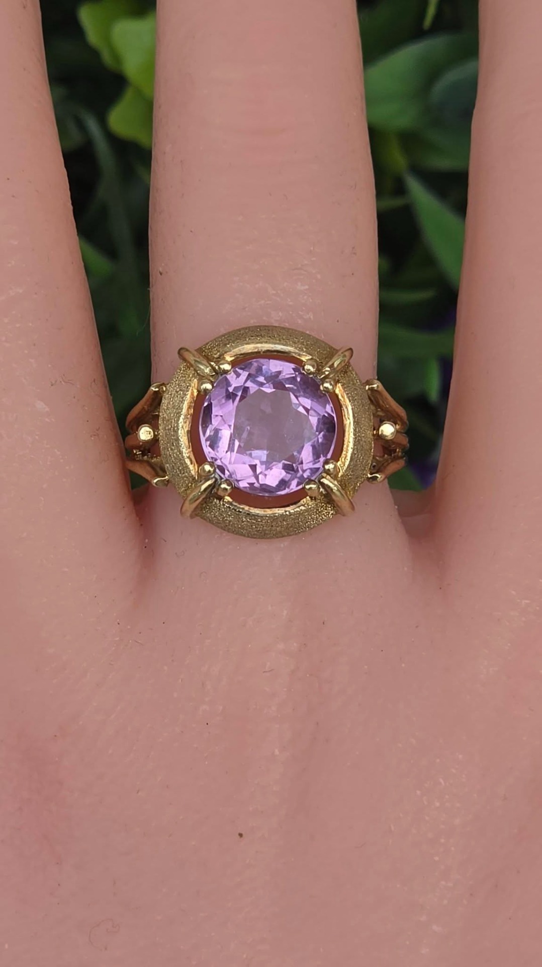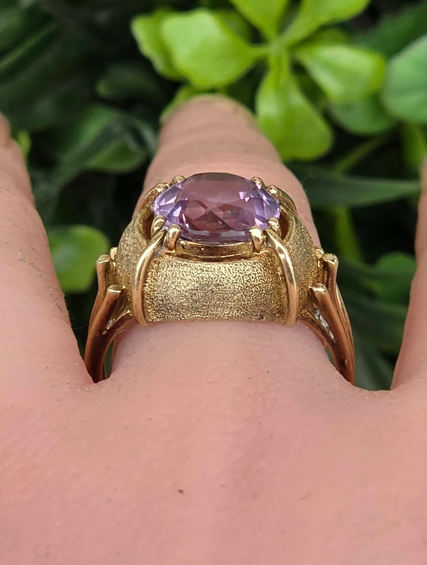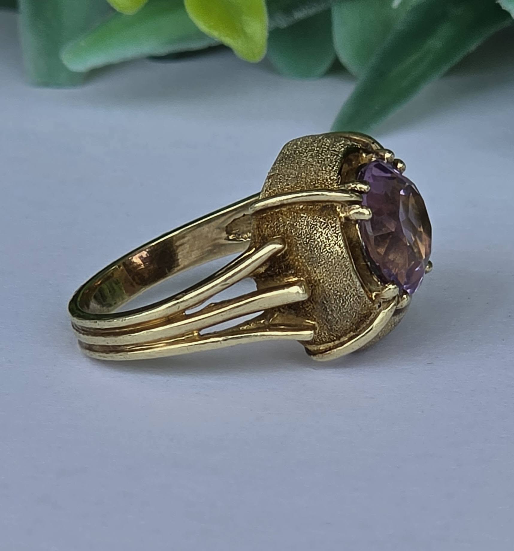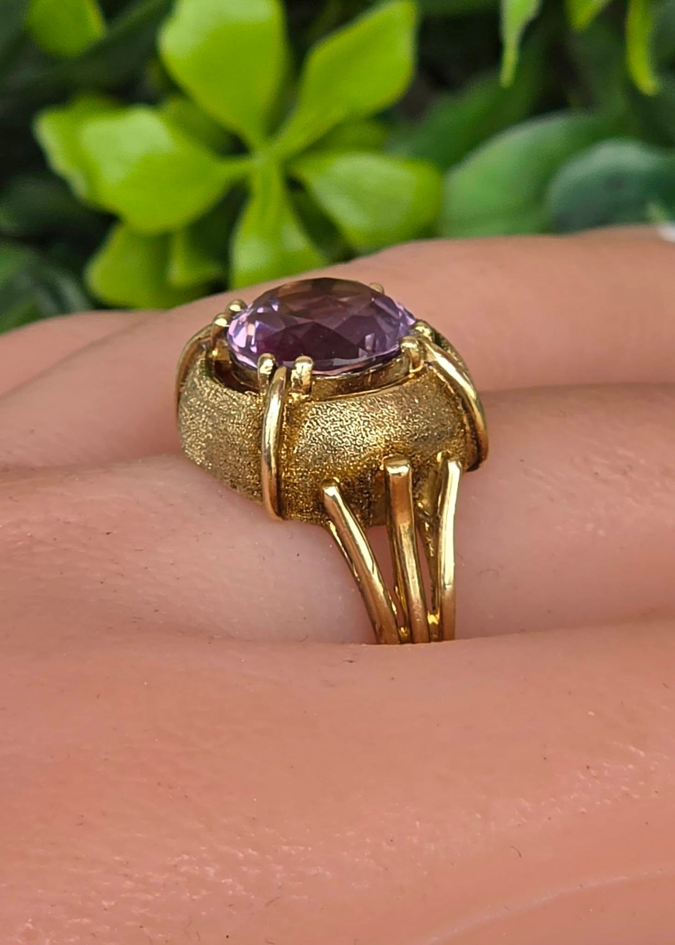 Inel vechi spectaculos, din aur de 14K, cu un superb ametist natural, manufactură cu elemente cu finisaj texturat, care contrastează cu părțile lucioase.
