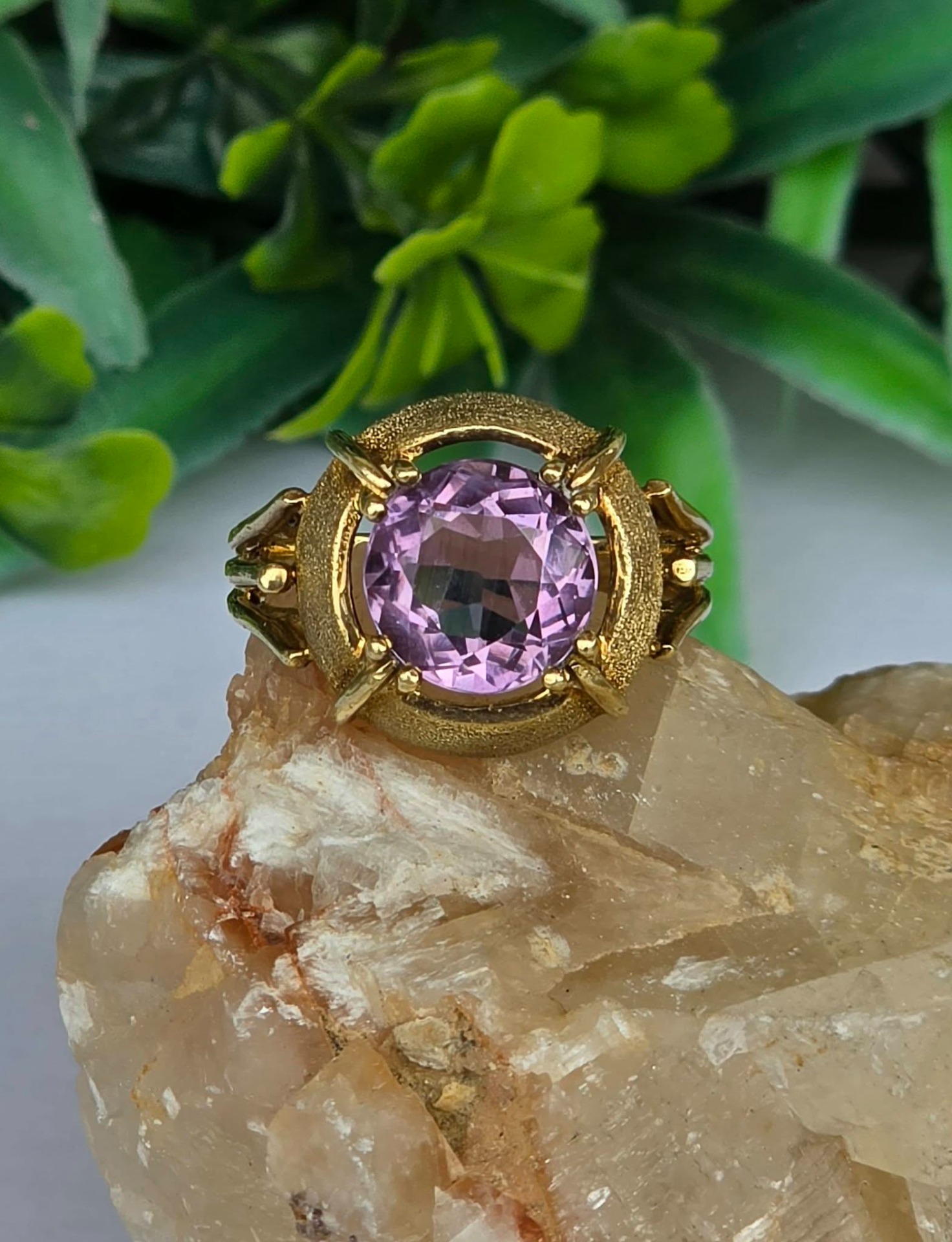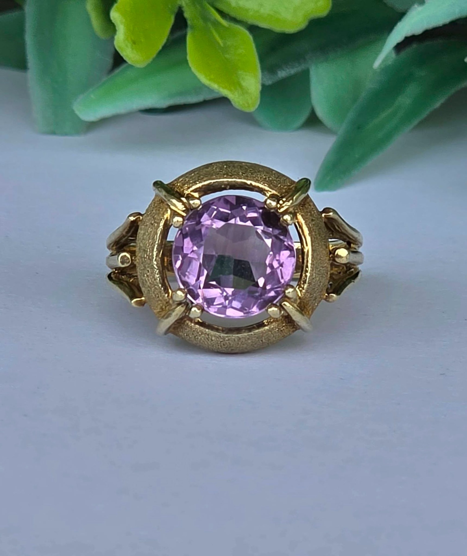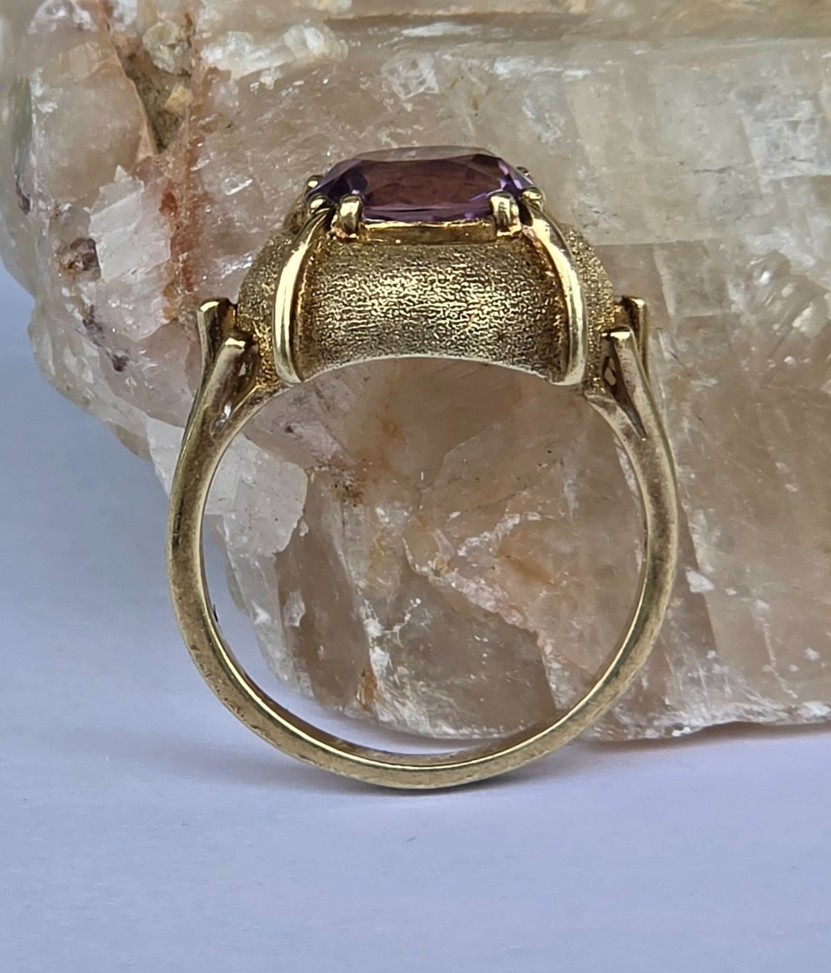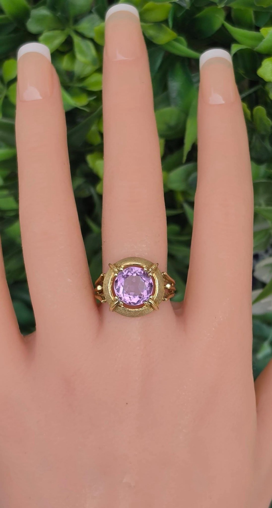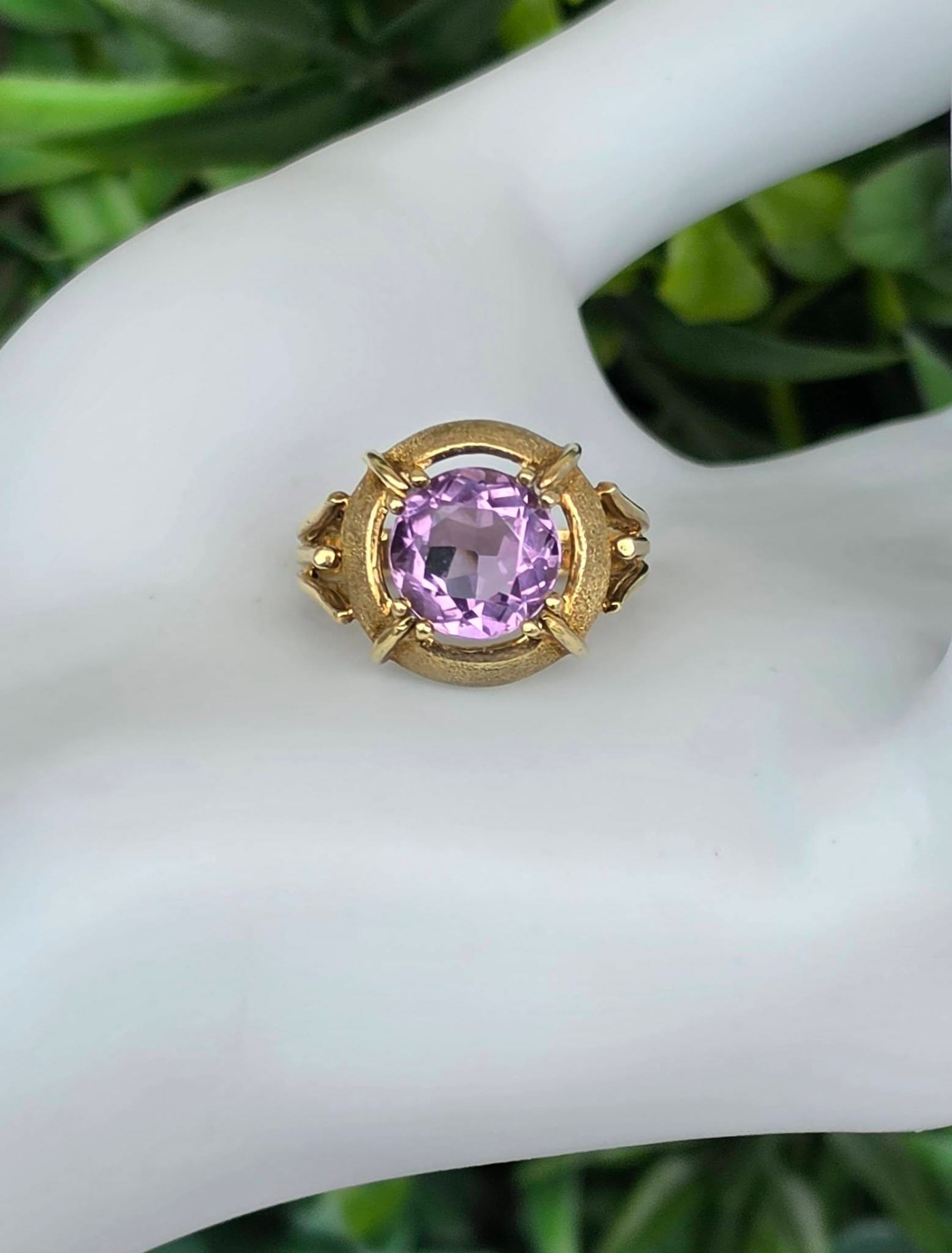 Inel vechi spectaculos, din aur de 14K, cu un superb ametist natural, manufactură cu elemente cu finisaj texturat, care contrastează cu părțile lucioase.