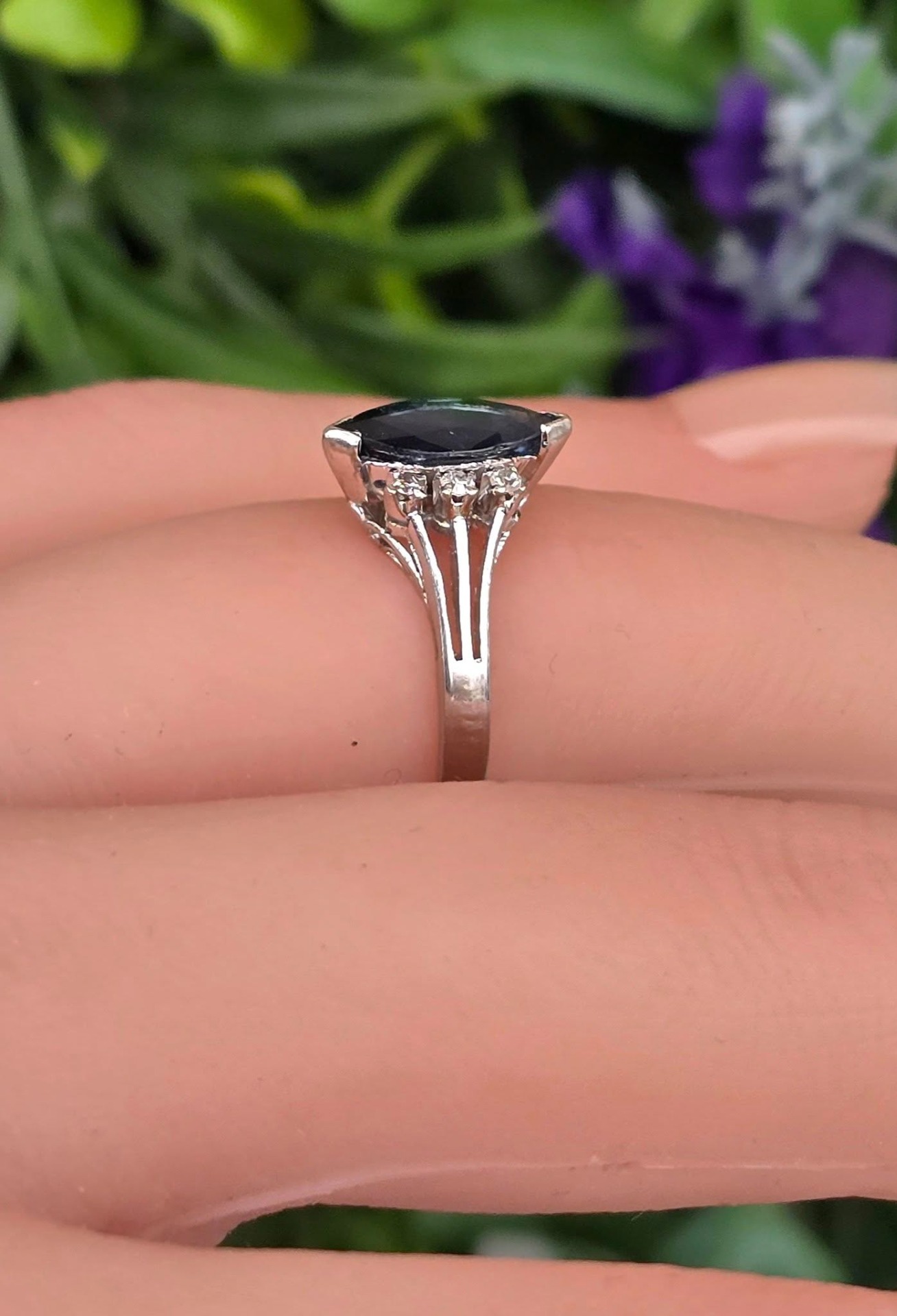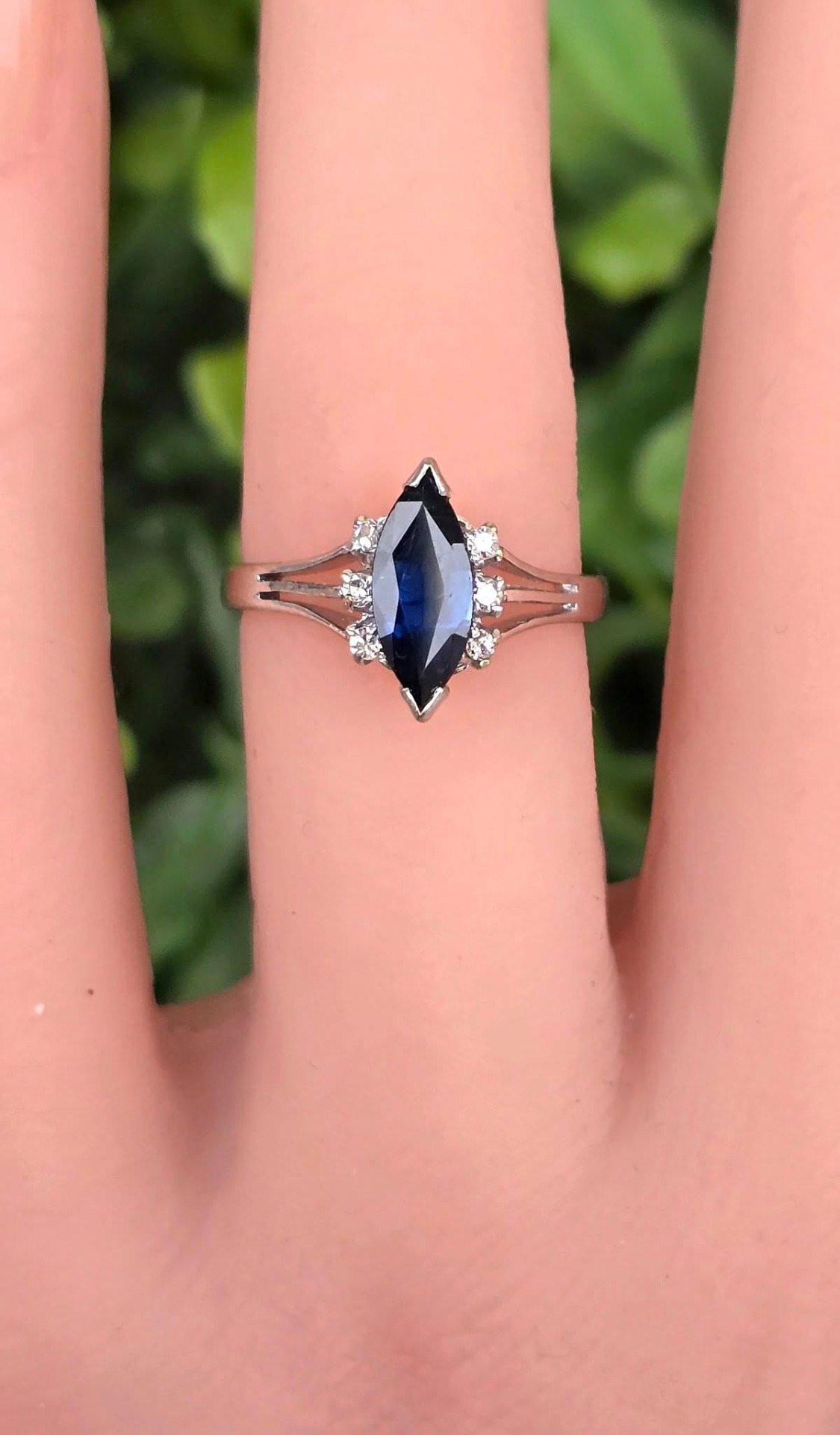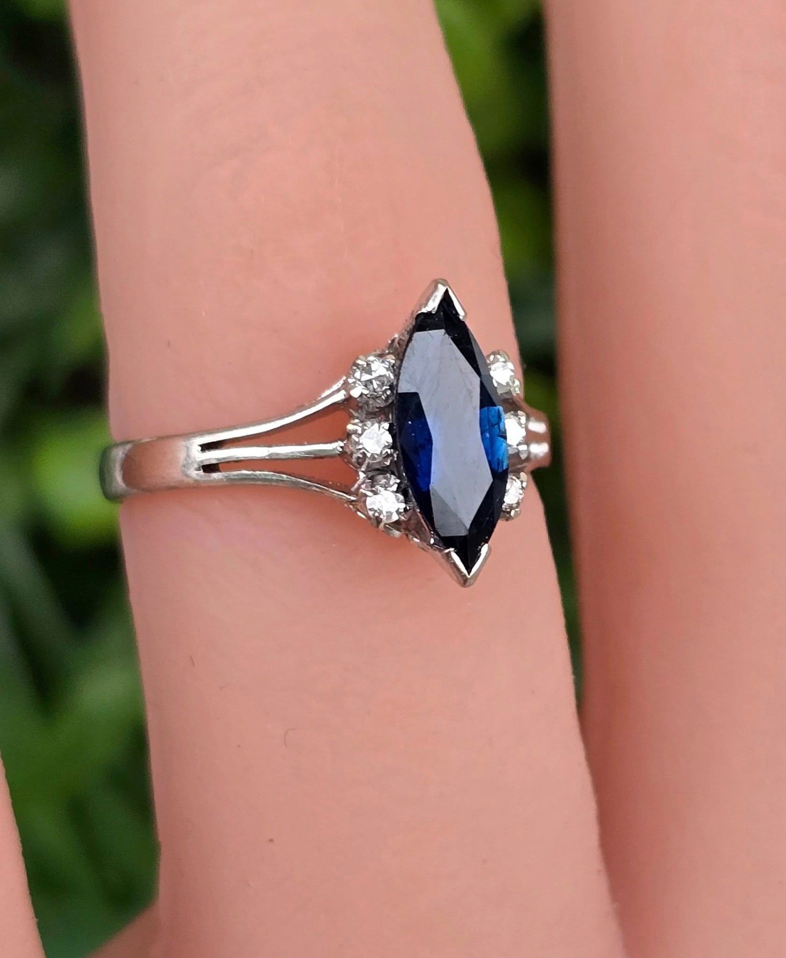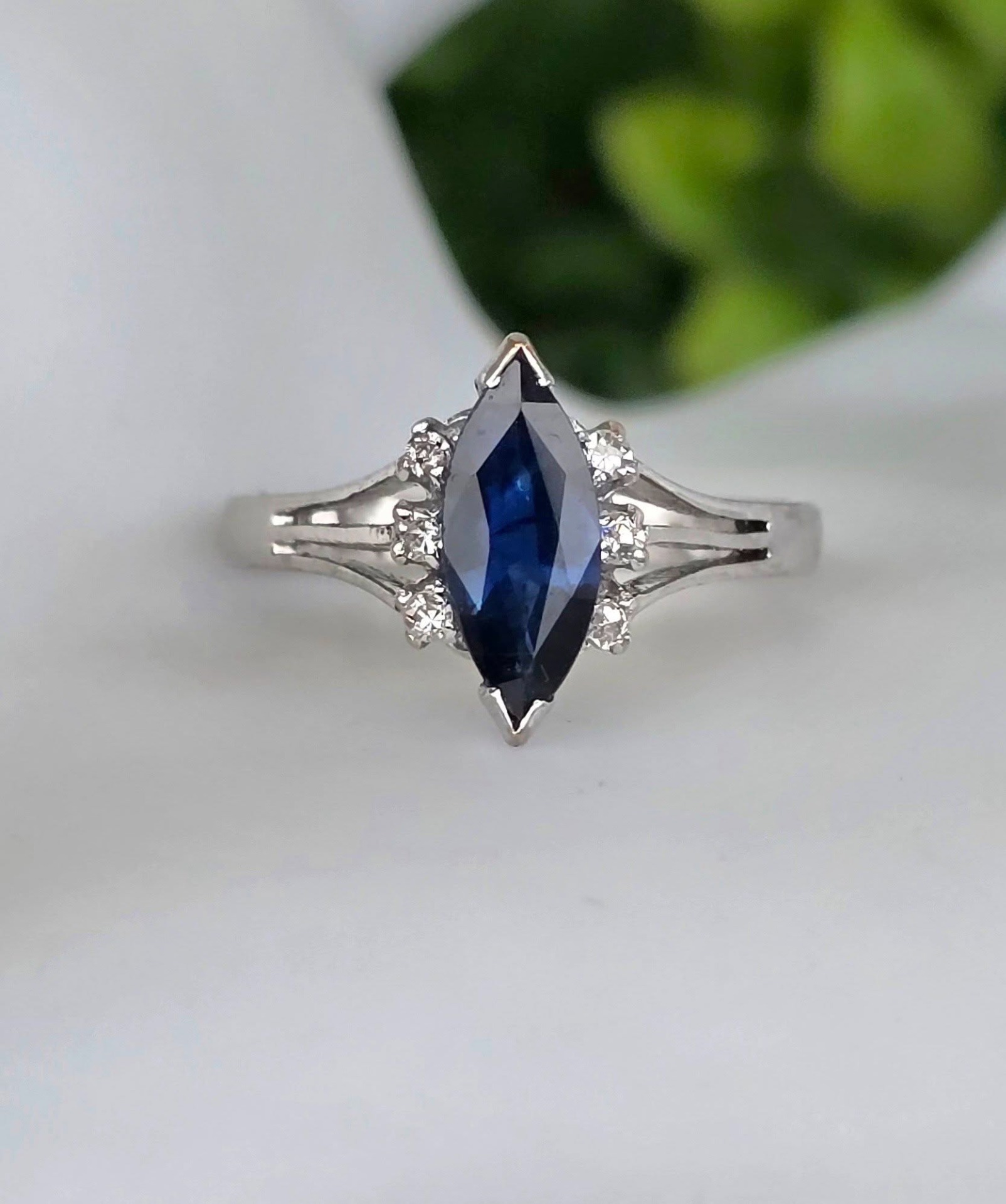Inel vechi spectaculos, din aur de 14K, cu un superb safir "marquise cut" și 6 diamante naturale.