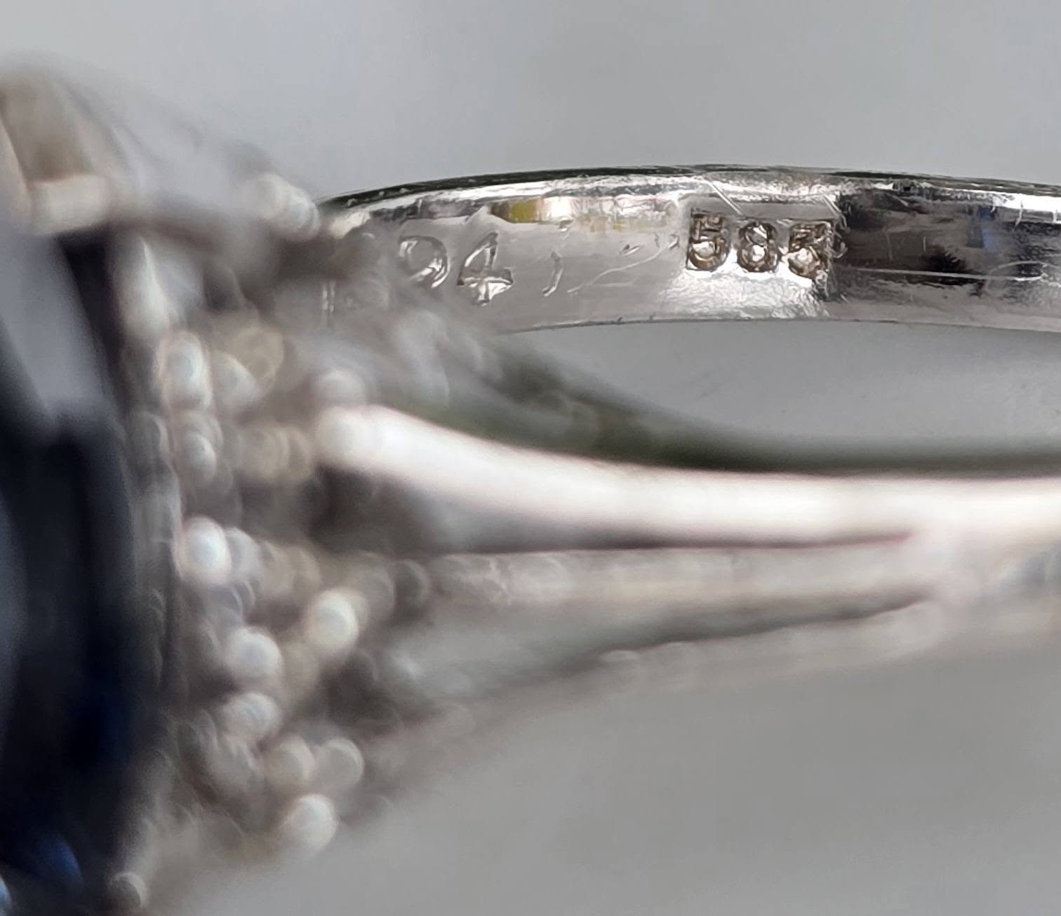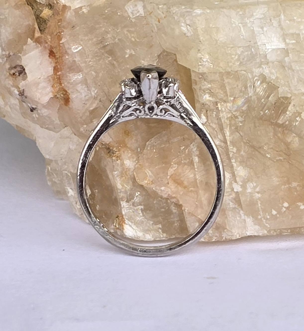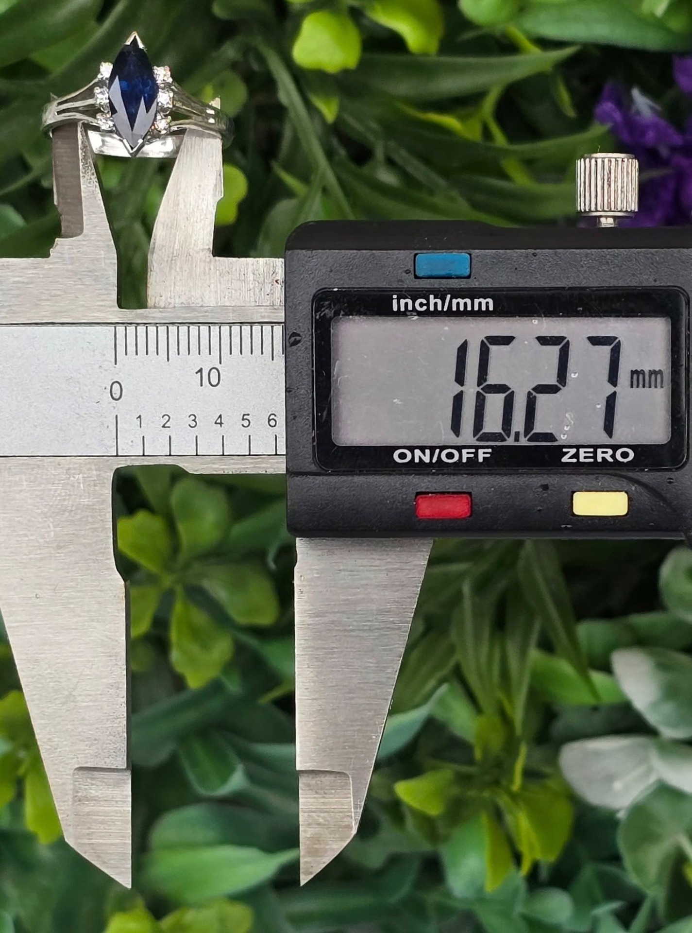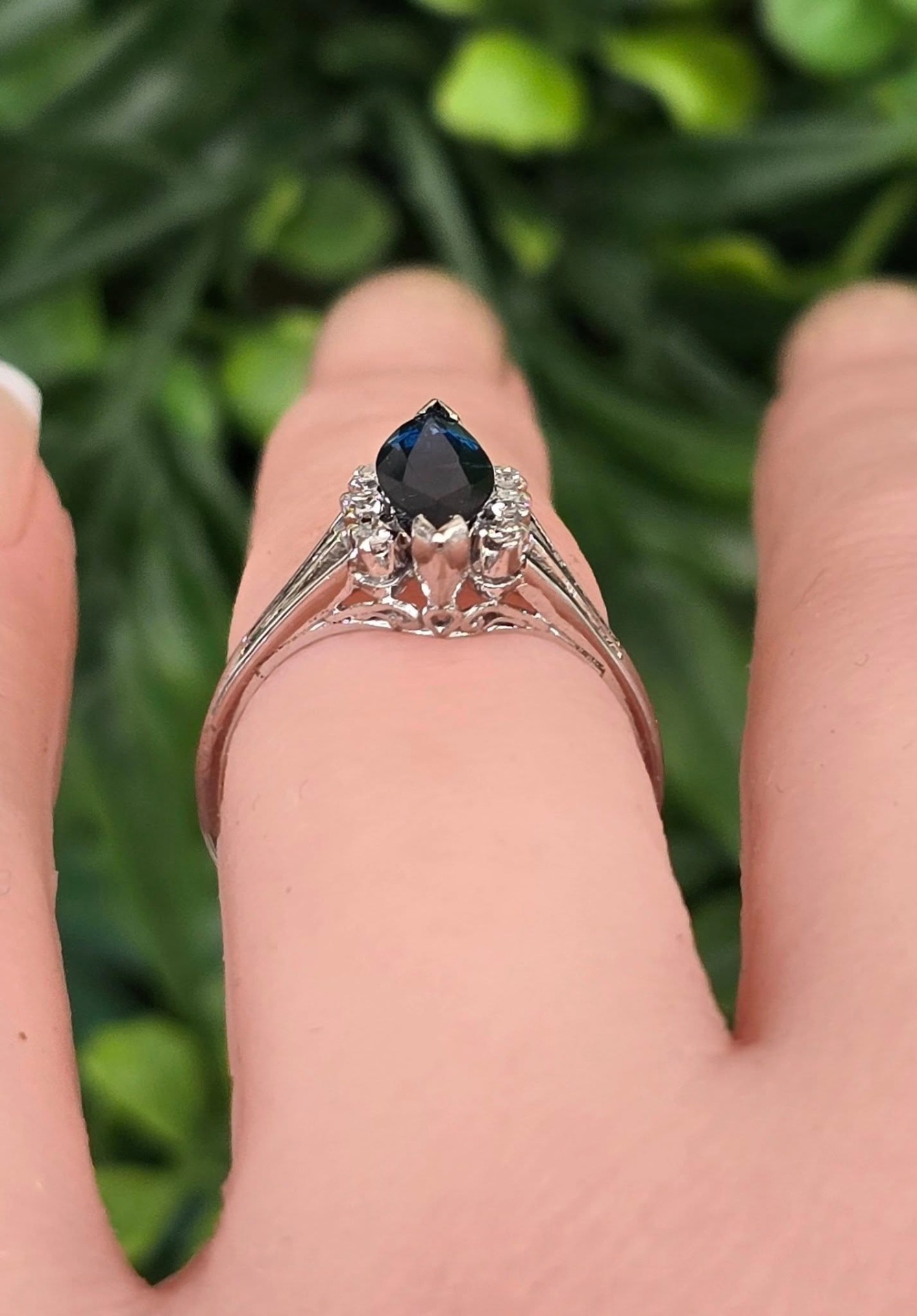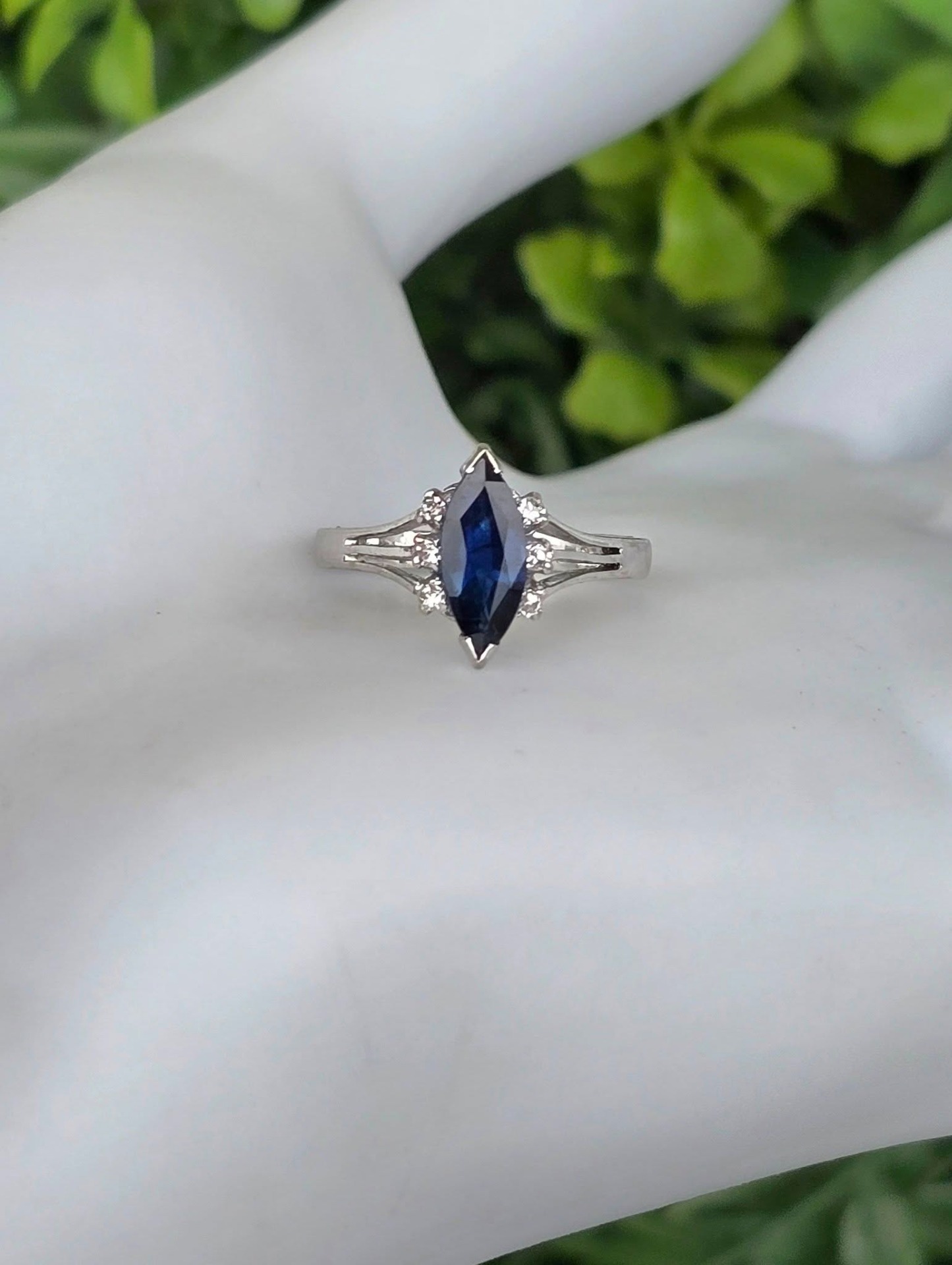 Inel vechi spectaculos, din aur de 14K, cu un superb safir "marquise cut" și 6 diamante naturale.