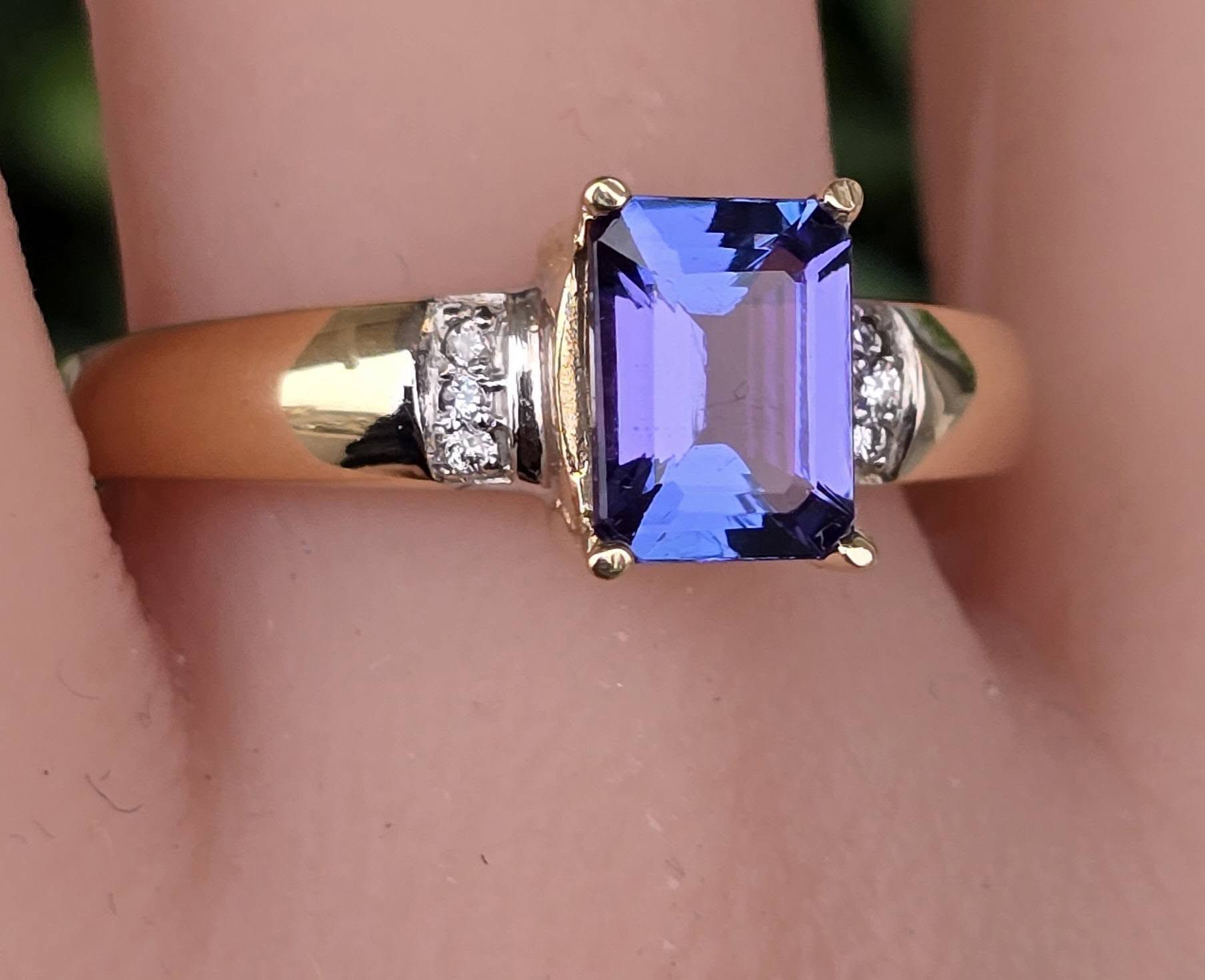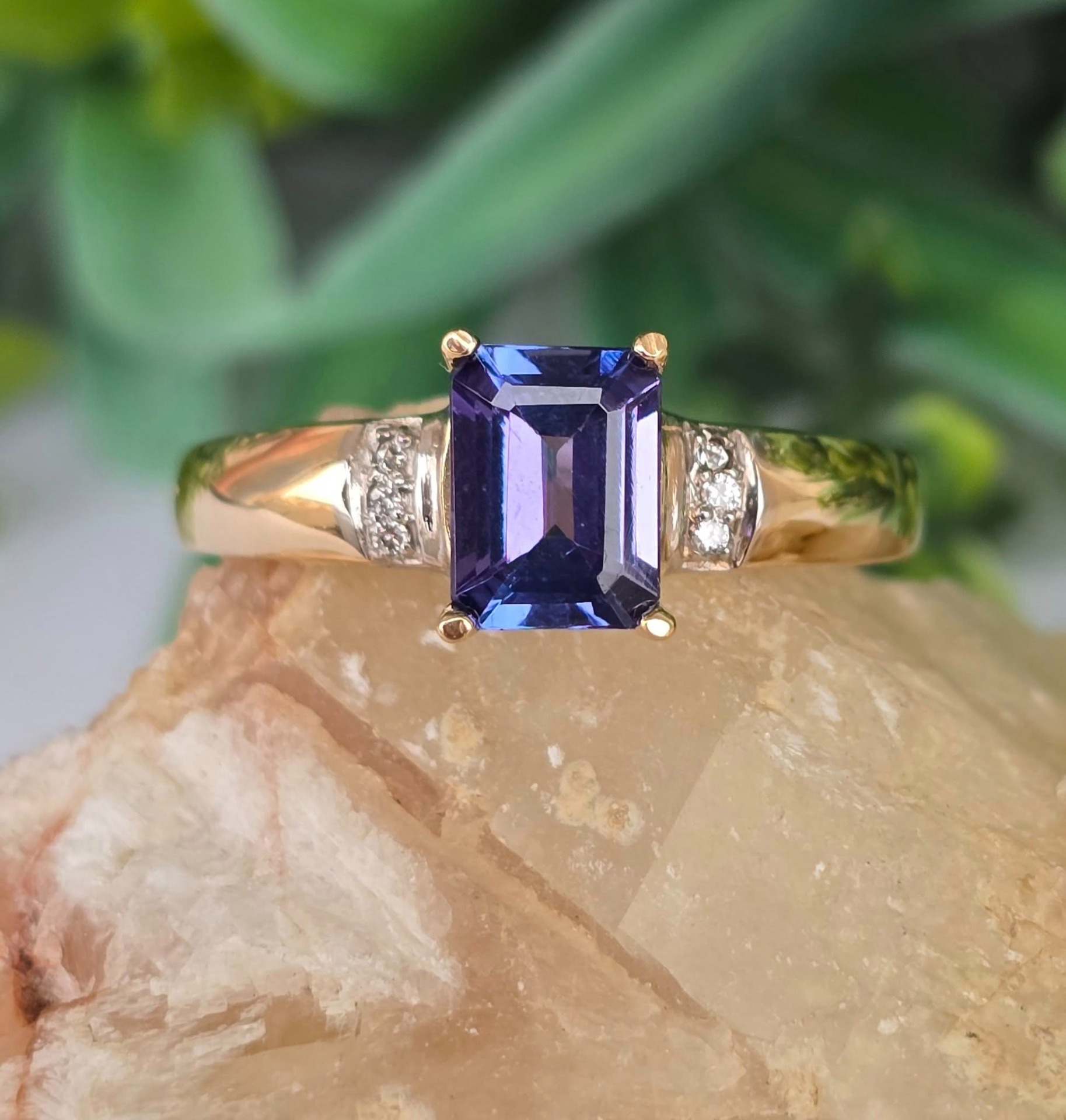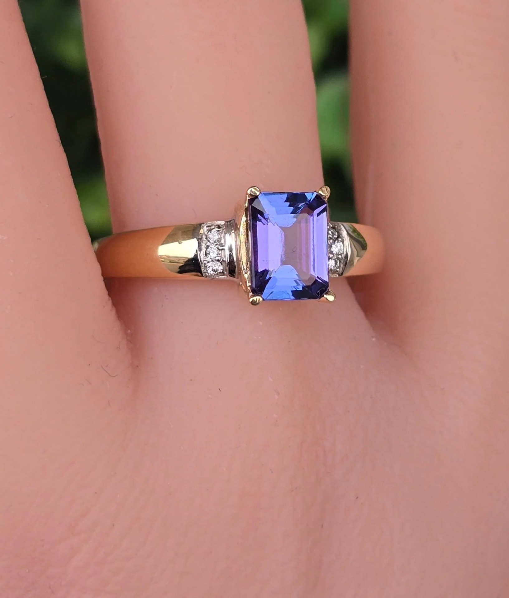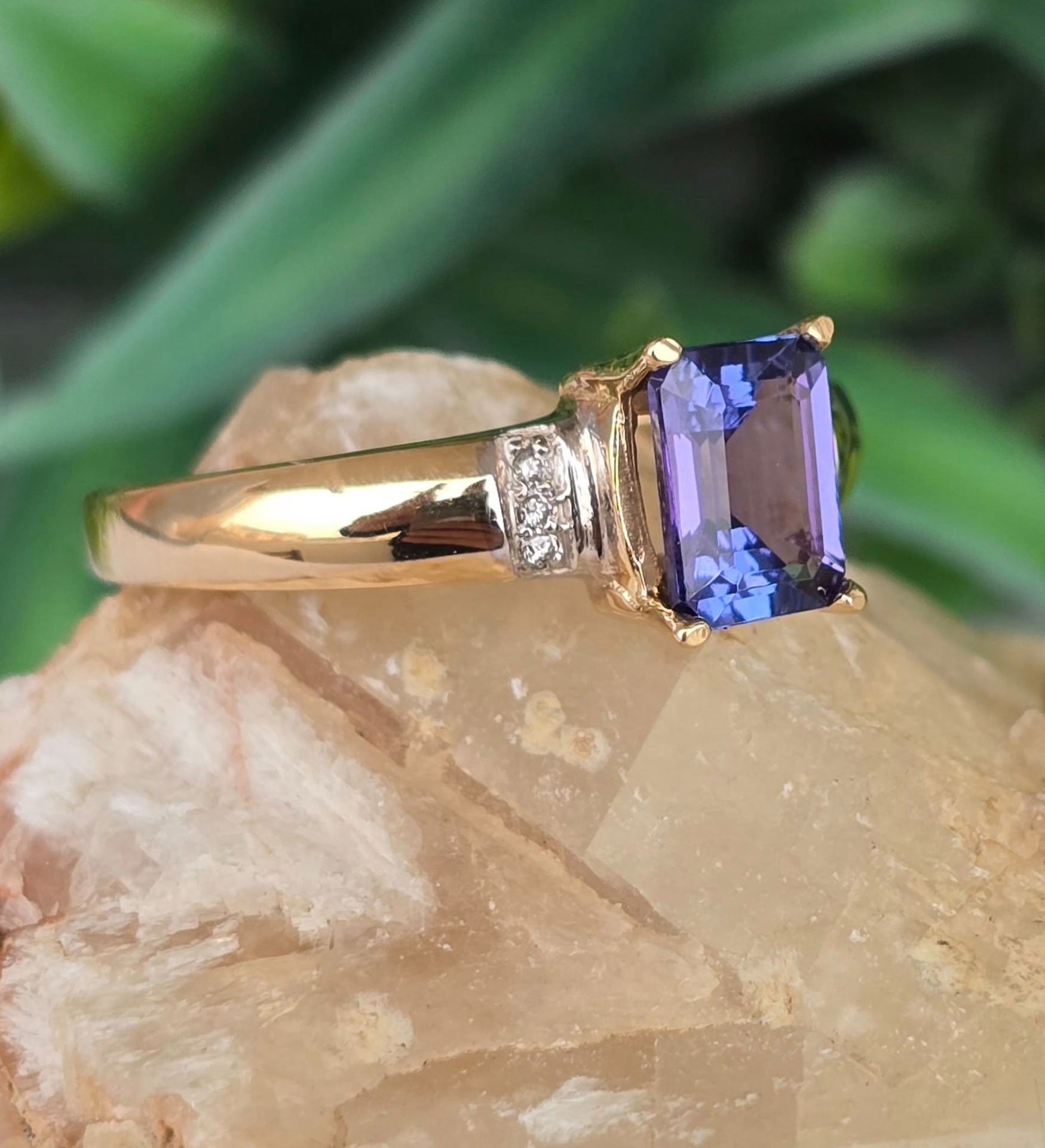 Inel vechi spectaculos, din aur de 14K, cu un superb tanzanit și 6 diamante naturale.